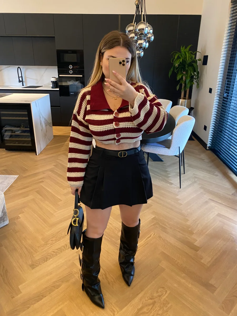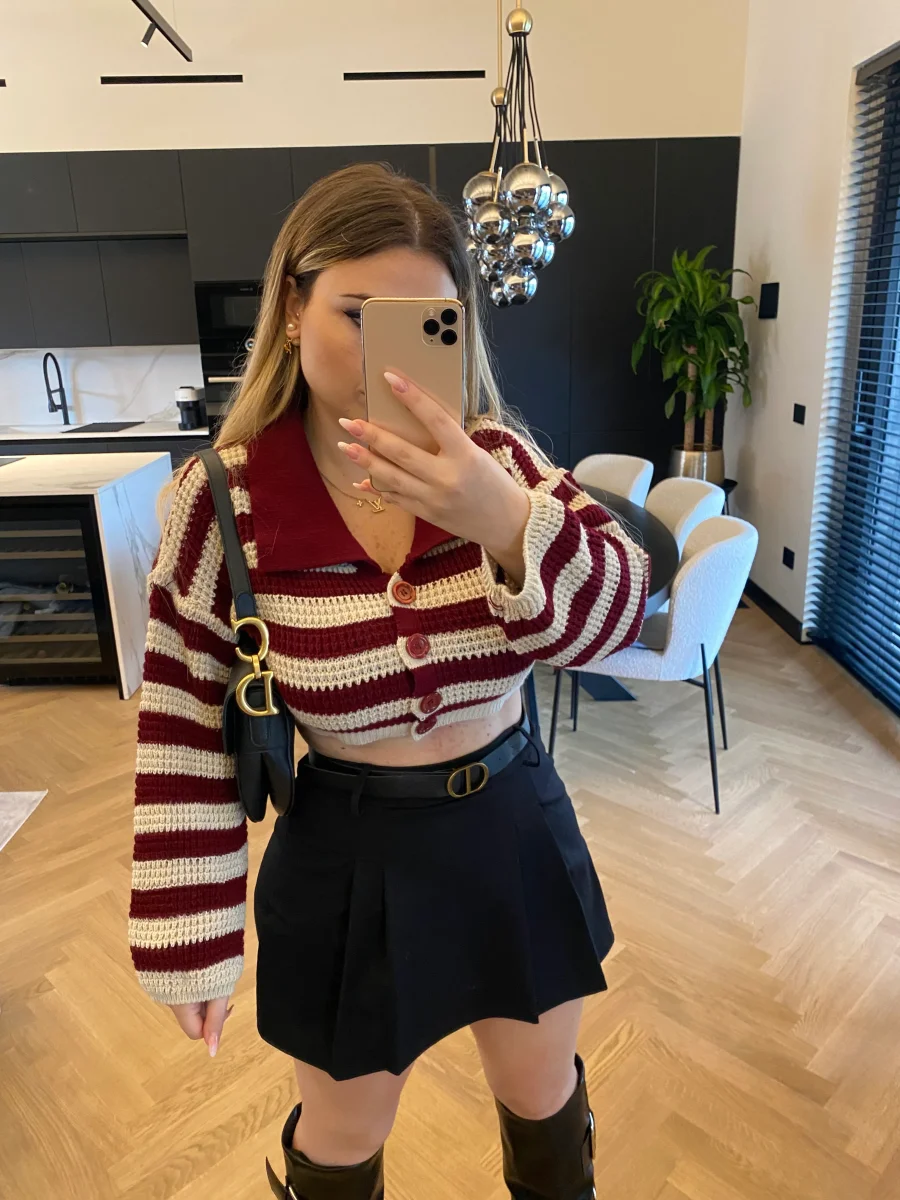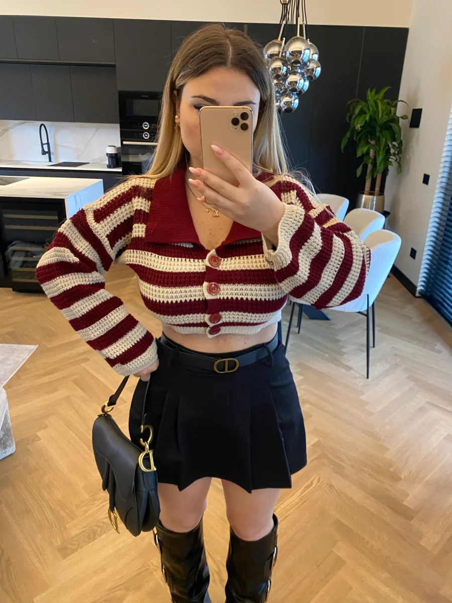 Maglione crop a righe con colletto e bottoncini.