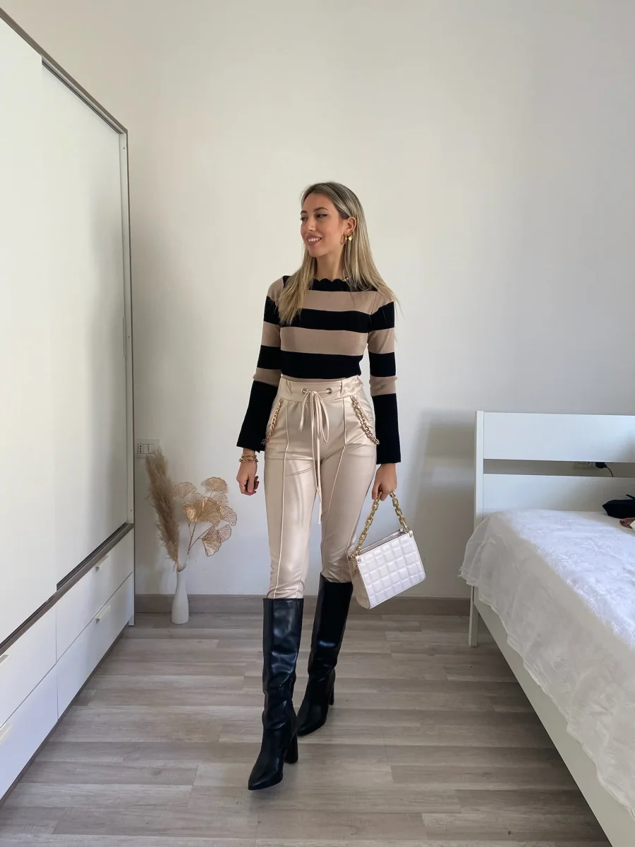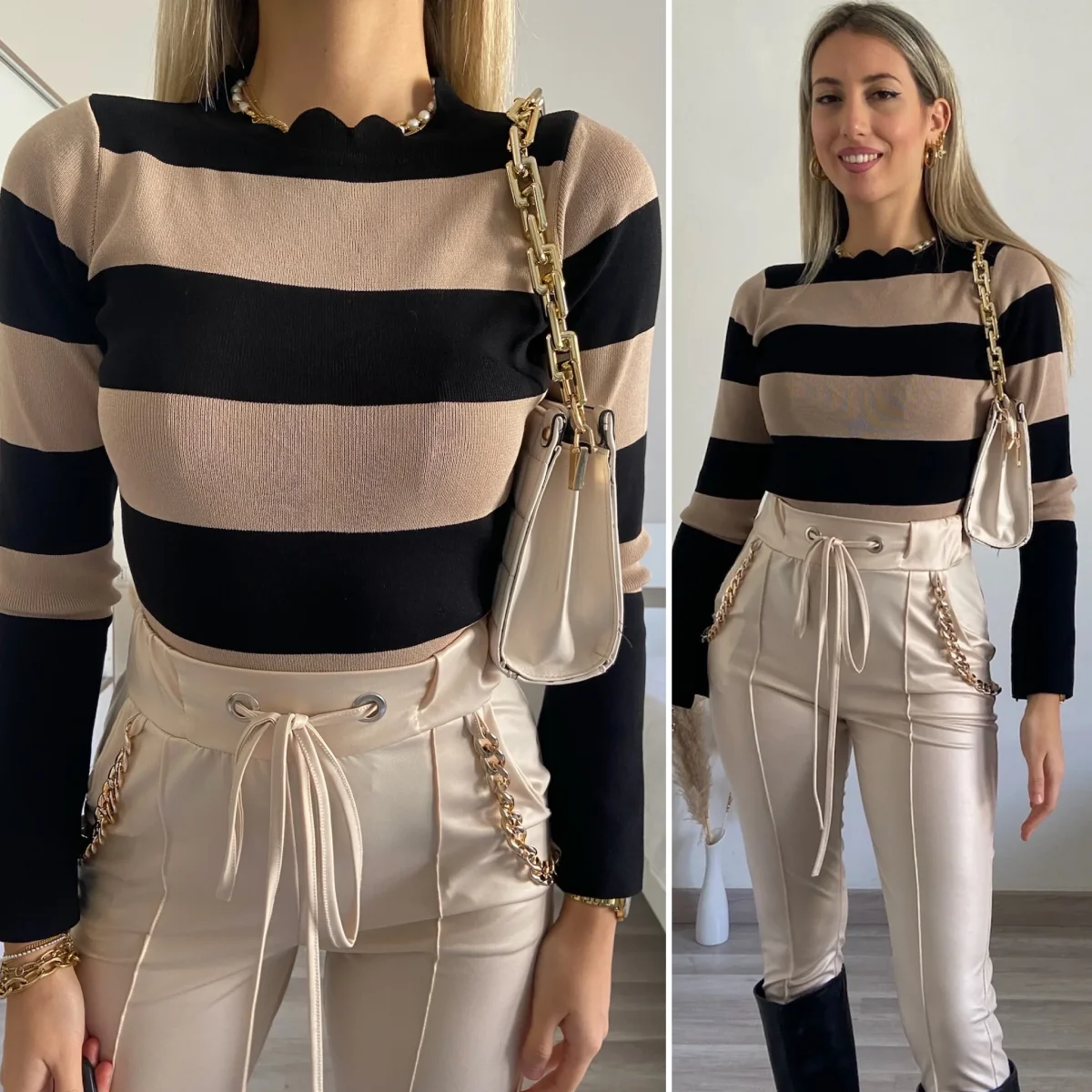 Maglioncino a Righe in tessuto elasticizzato medio, spacchetto sulle maniche e collo ondulato.