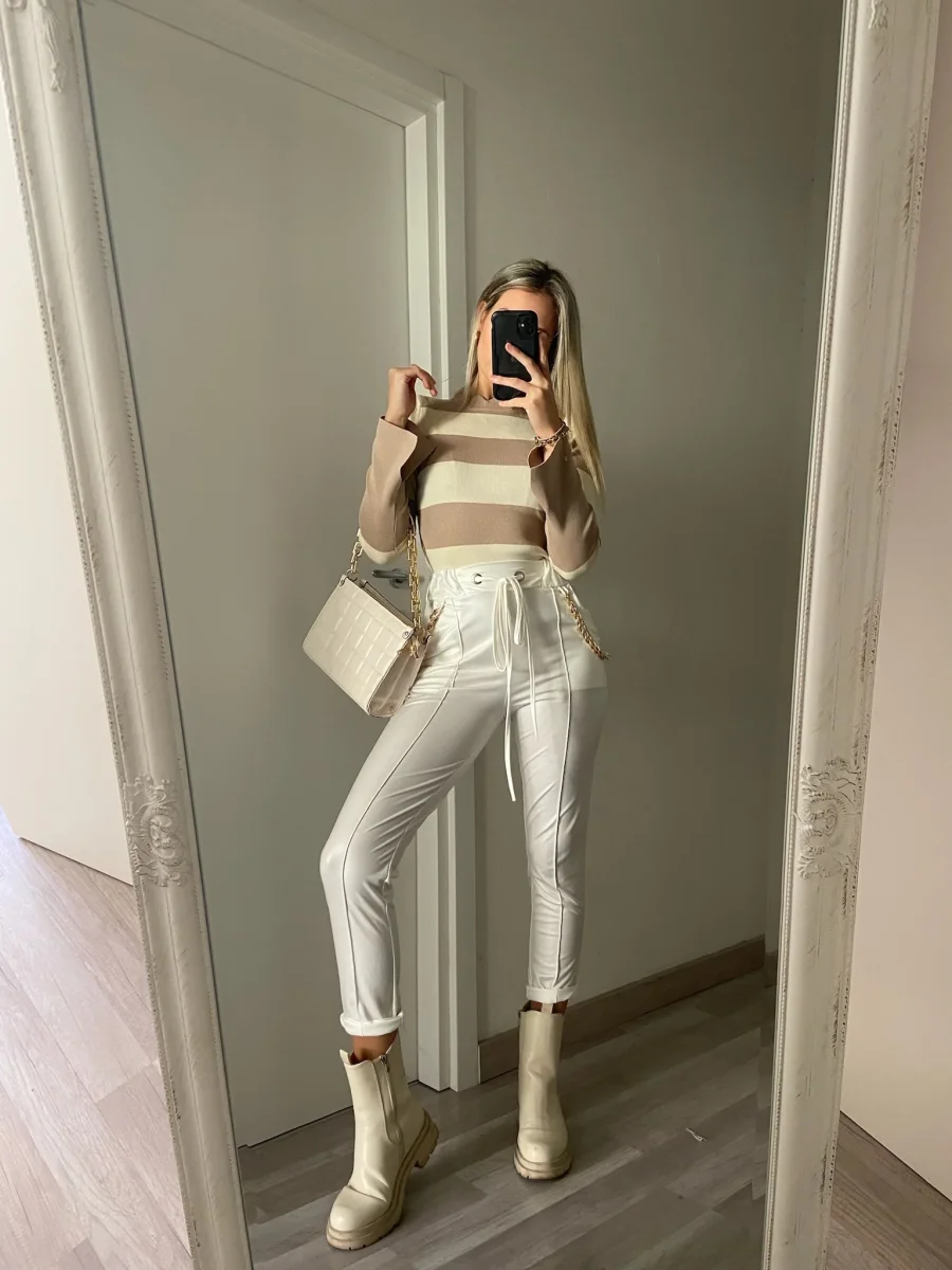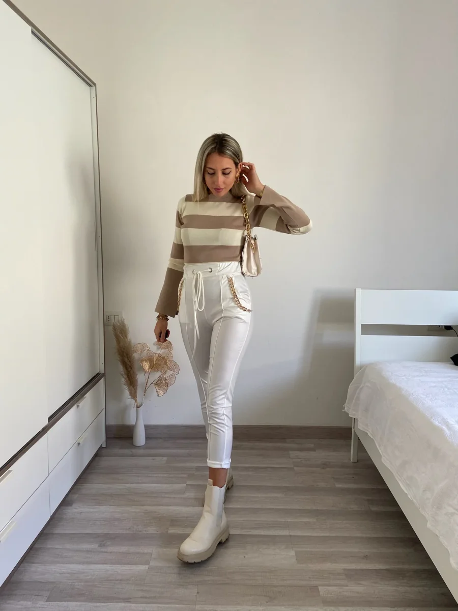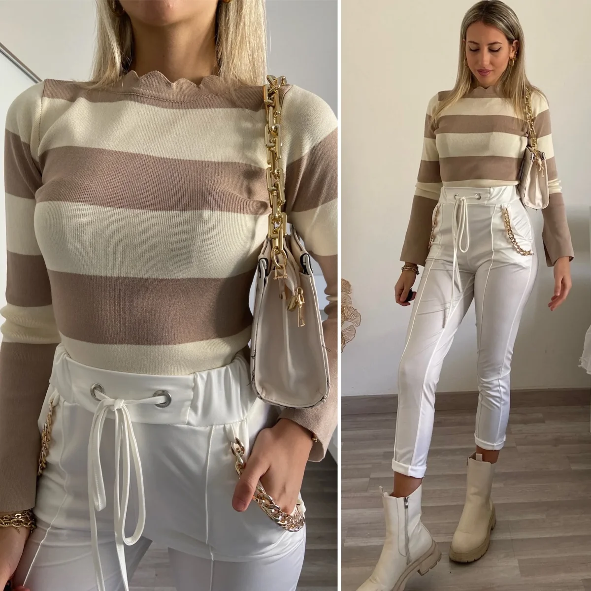 Maglioncino a Righe in tessuto elasticizzato medio, spacchetto sulle maniche e collo ondulato.