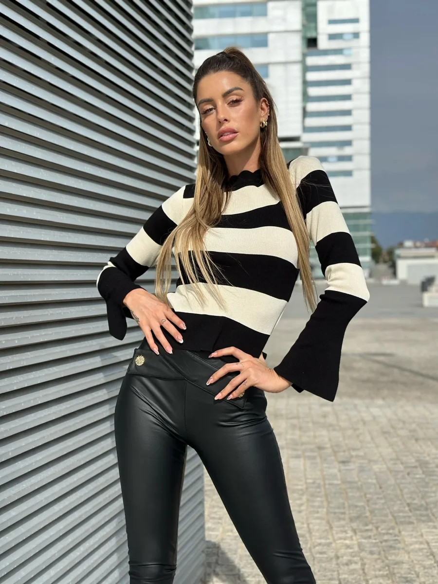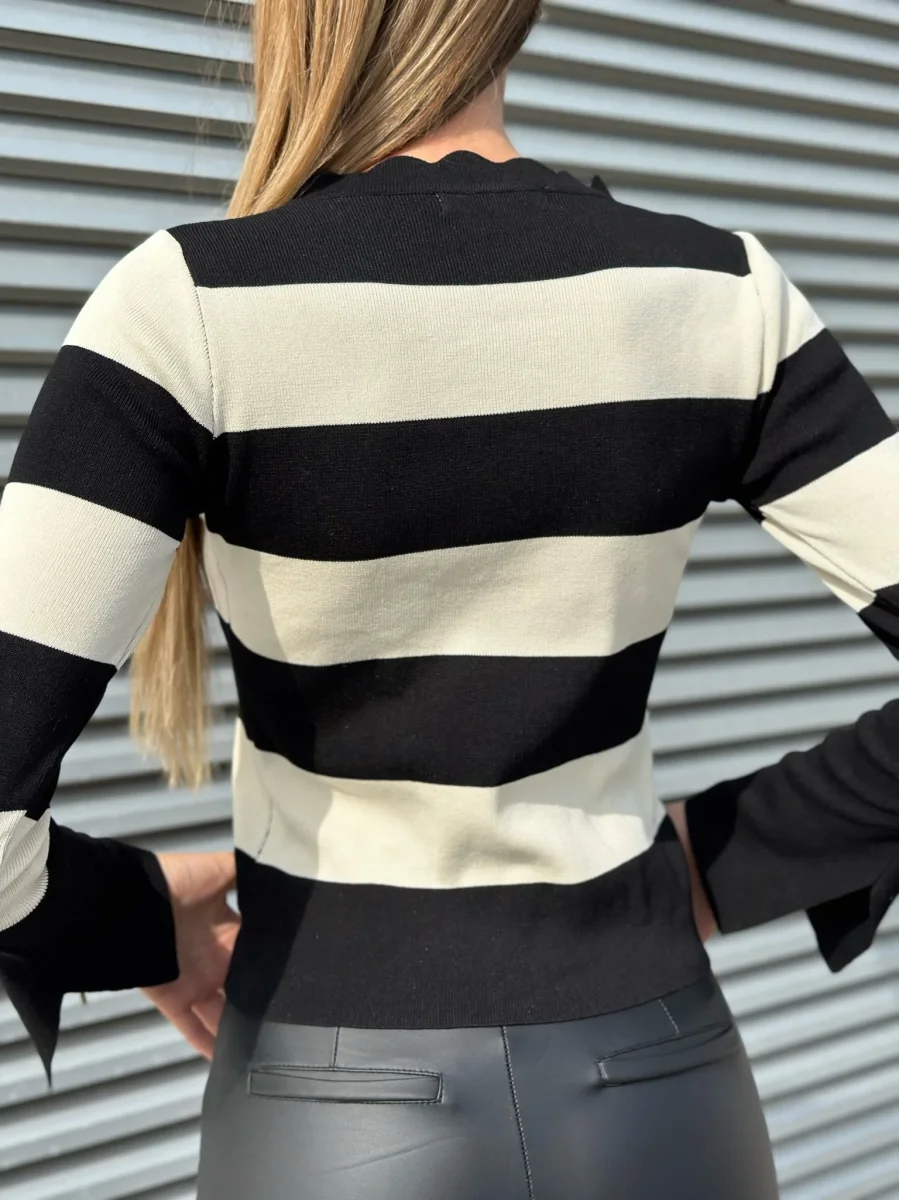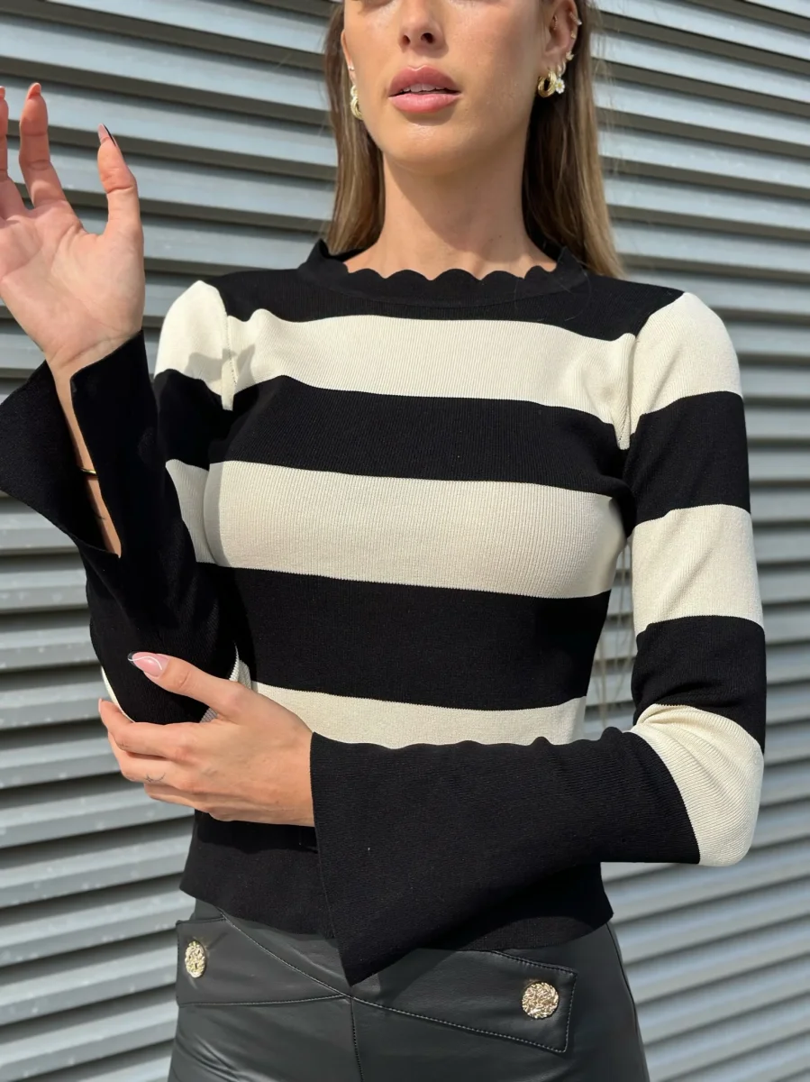 Maglioncino a Righe in tessuto elasticizzato medio, spacchetto sulle maniche e collo ondulato.