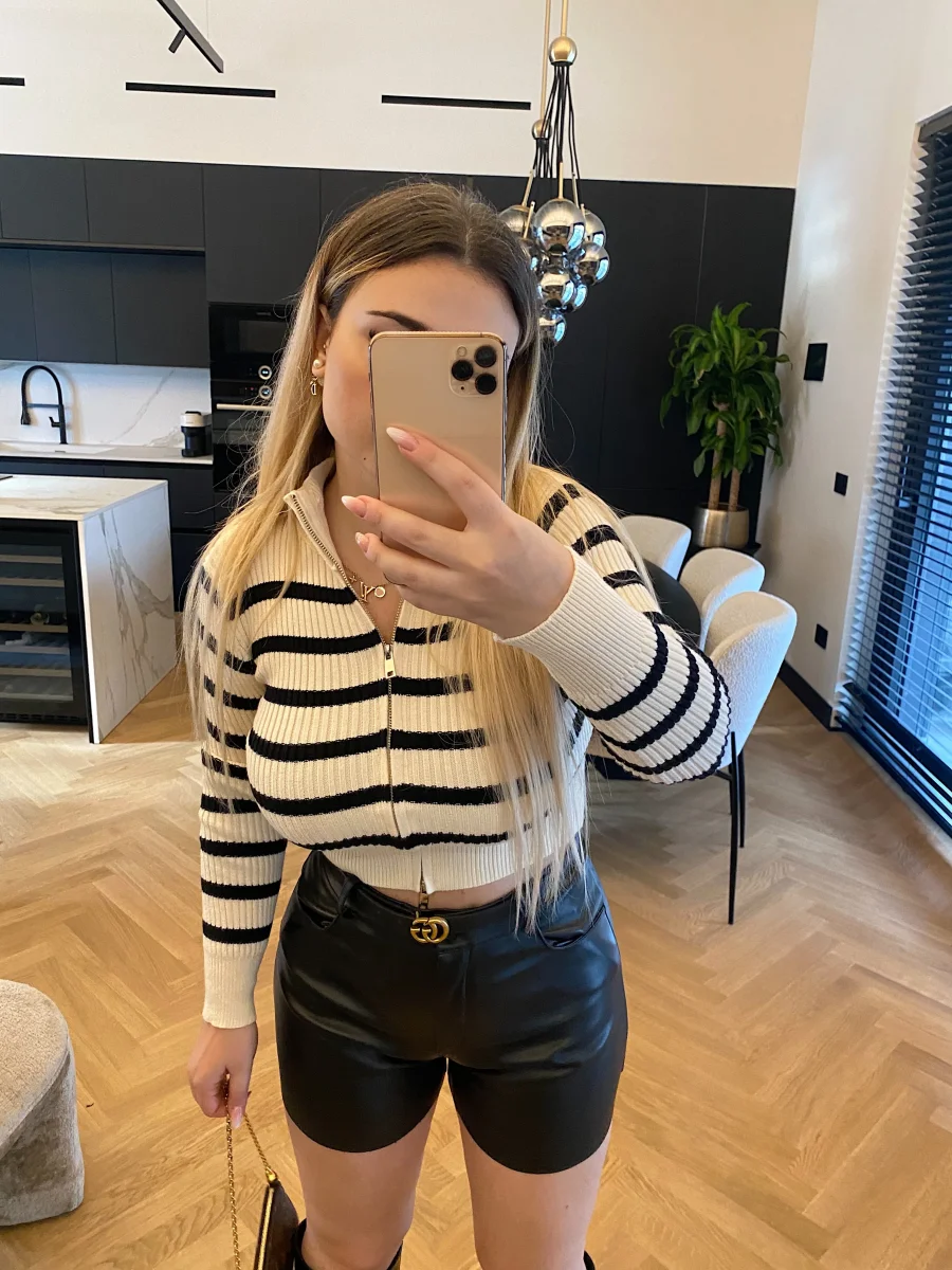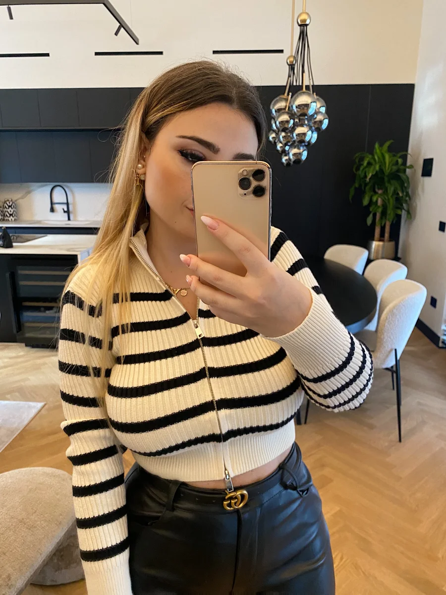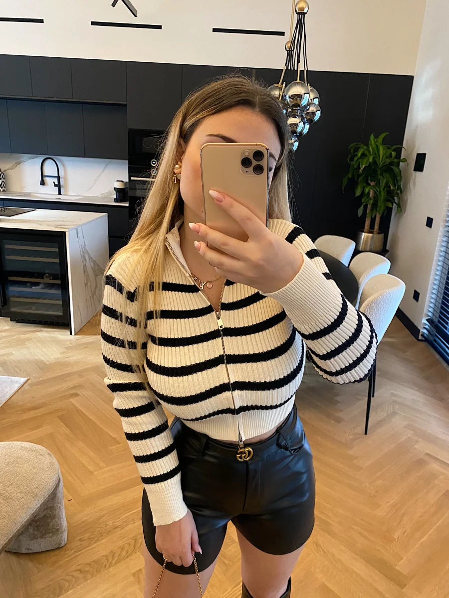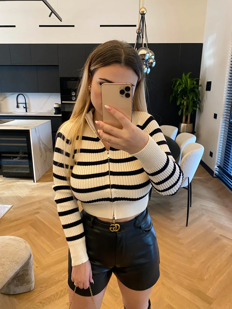 Maglione crop a righe bianco e nero con zip doppio lato