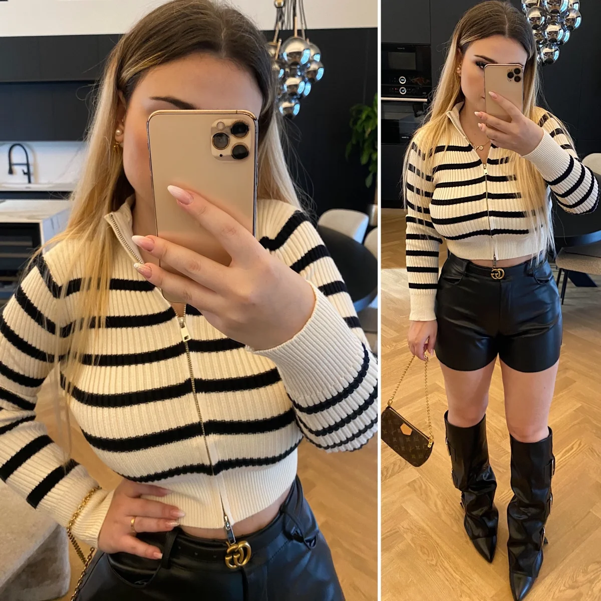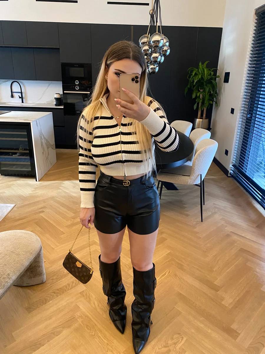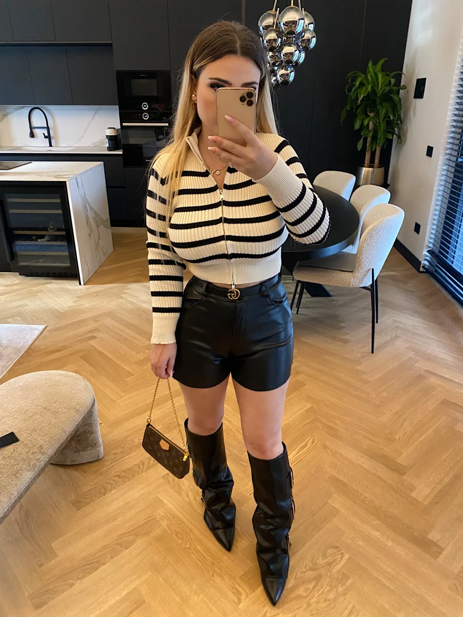 Maglione crop a righe bianco e nero con zip doppio lato