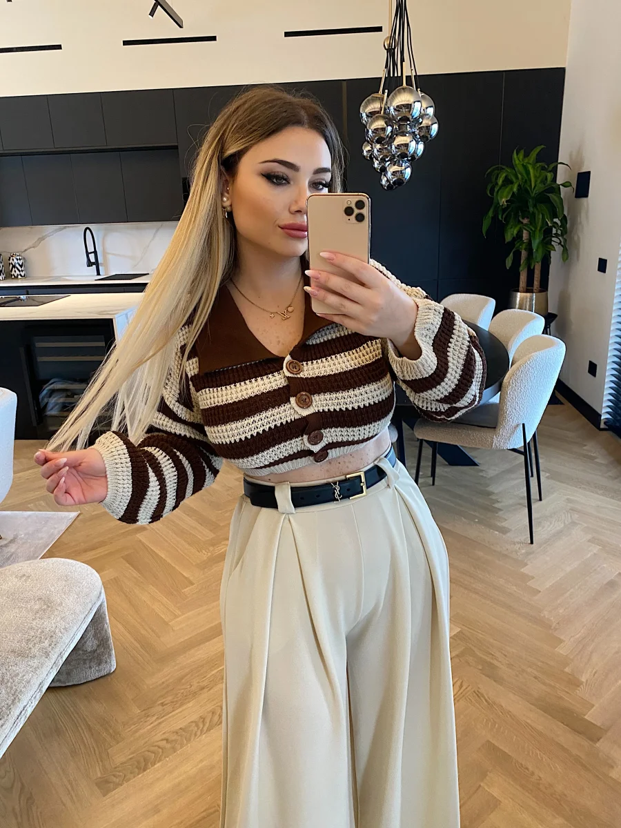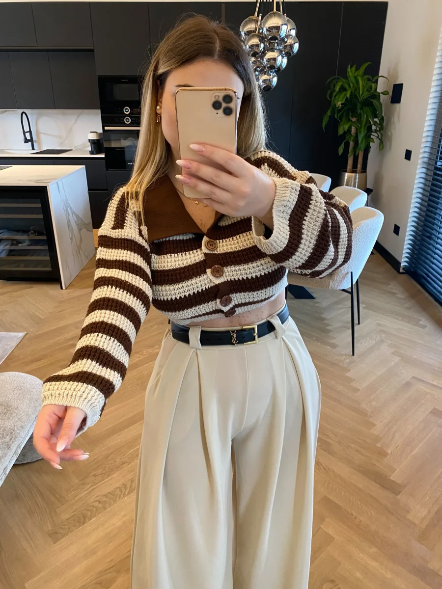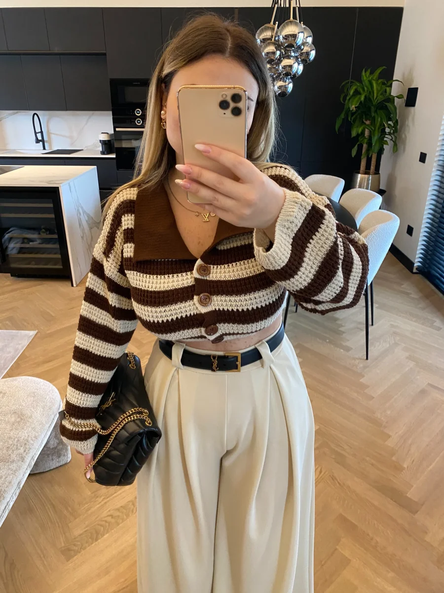 Maglione crop a righe con colletto e bottoncini.