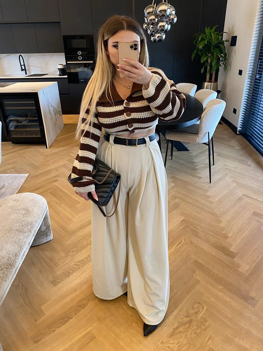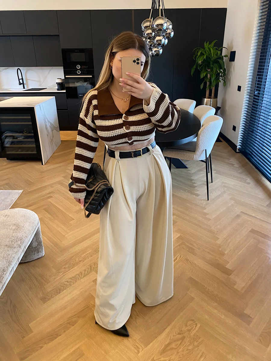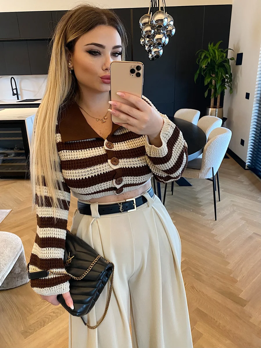 Maglione crop a righe con colletto e bottoncini.