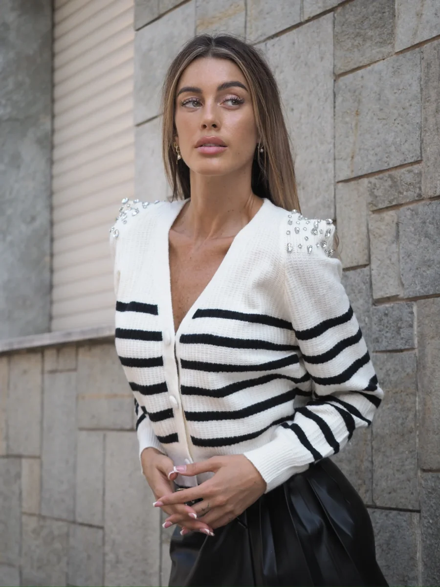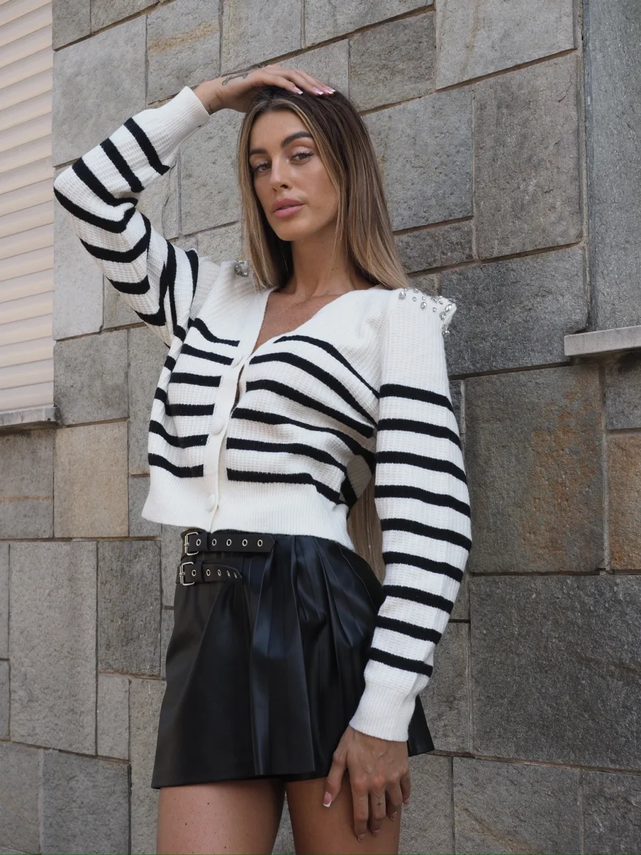 Maglione a righe bianco e nero con spalline bombate e strass. Chiusura con bottoni.