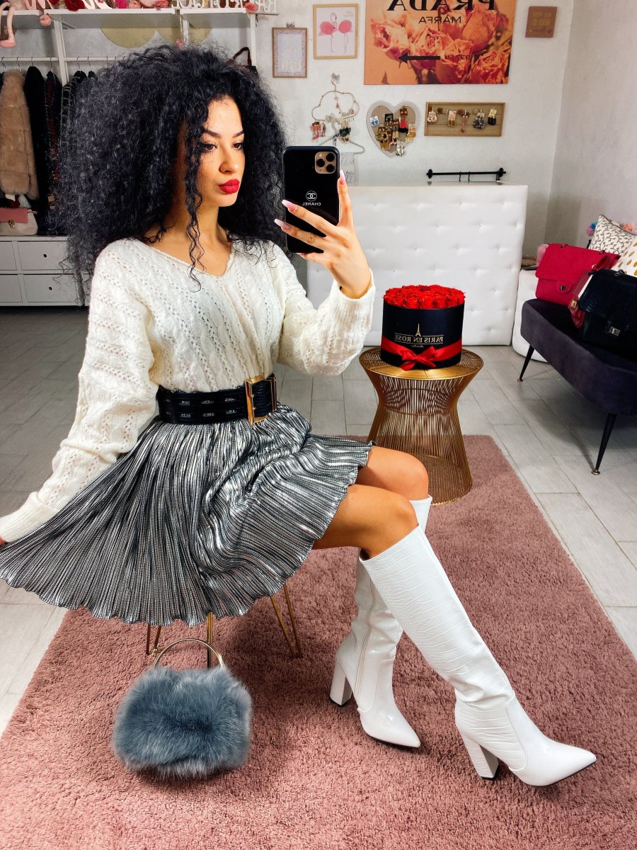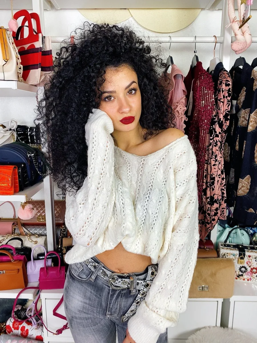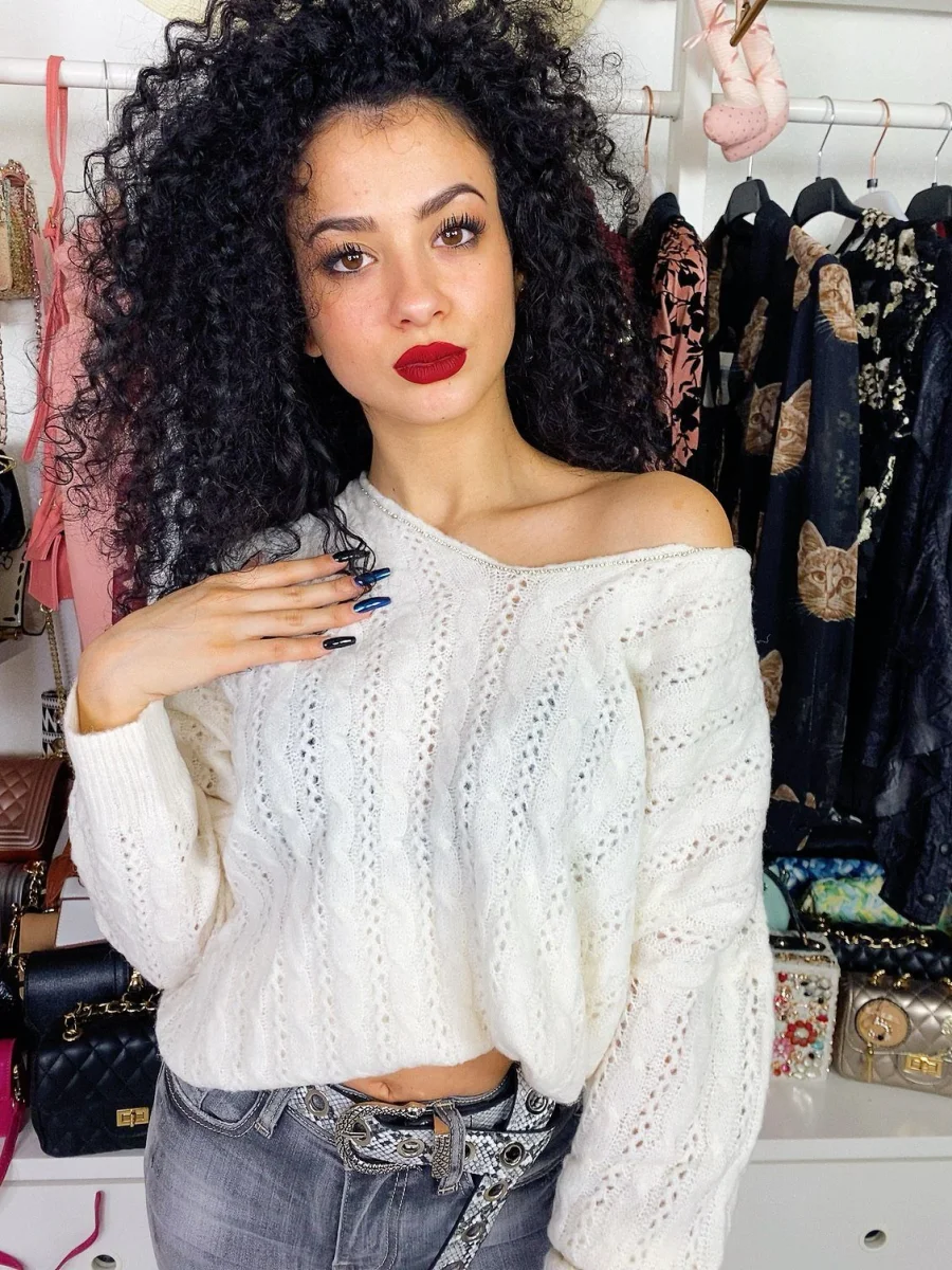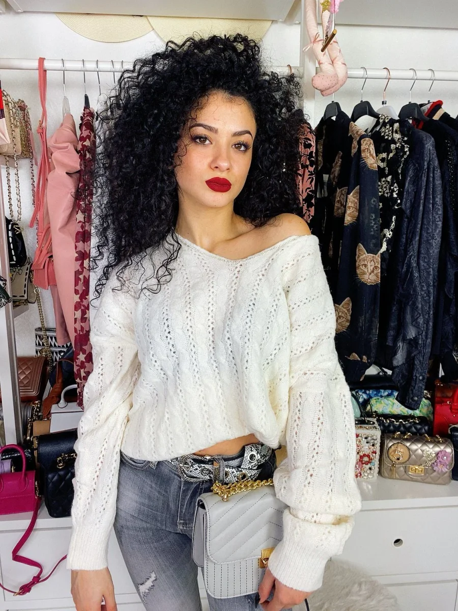 Morbido maglione in alta qualità con trecce e strass mini sullo scollo.