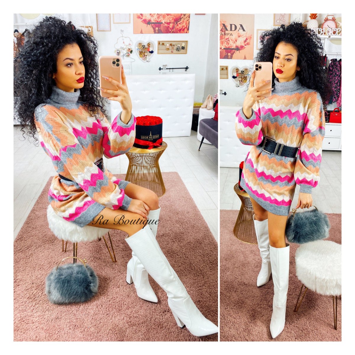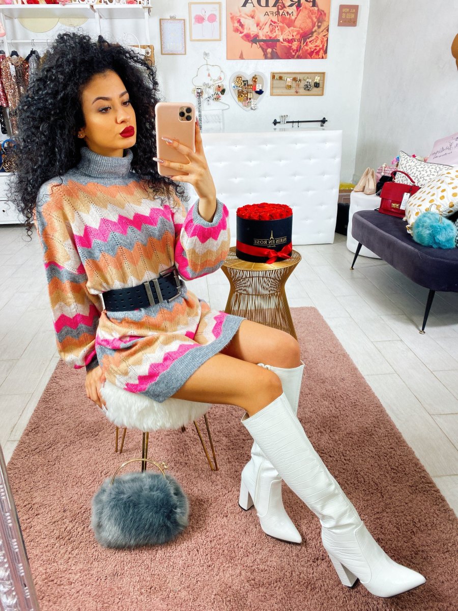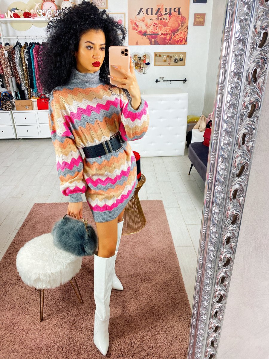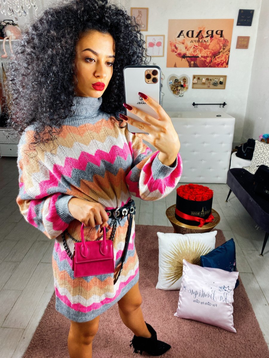 Maxi maglione o Dress a collo alto con fantasia colorata. Tessuto morbido e elasticizzato