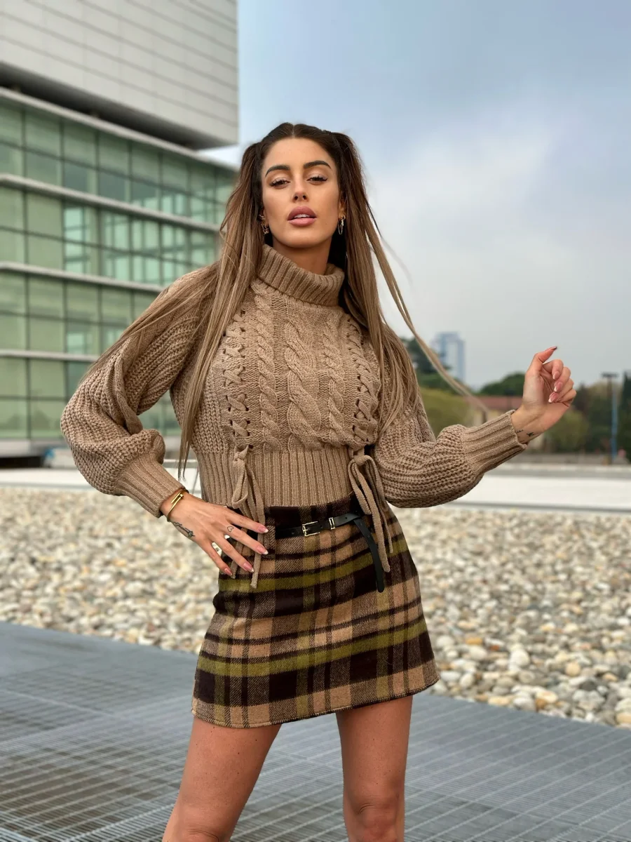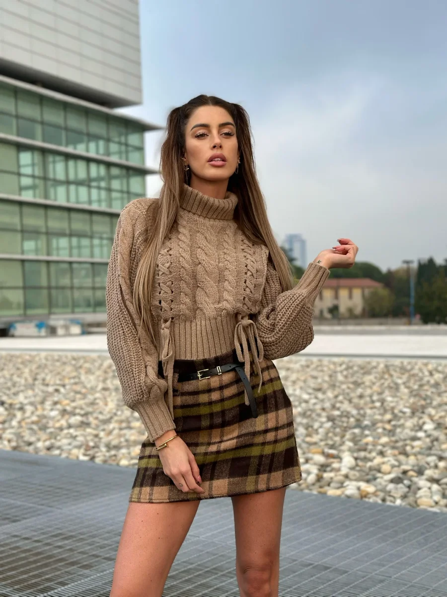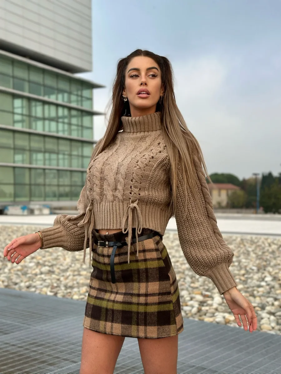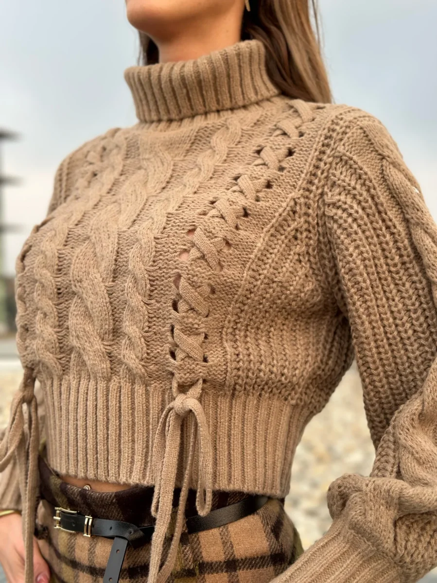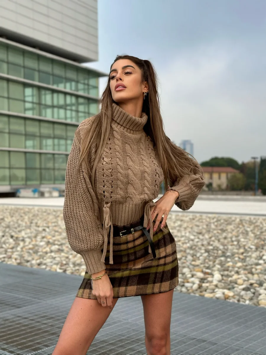 Maglione pesante a collo alto con trama a trecce sul davanti. Tessuto elasticizzato e molto caldo