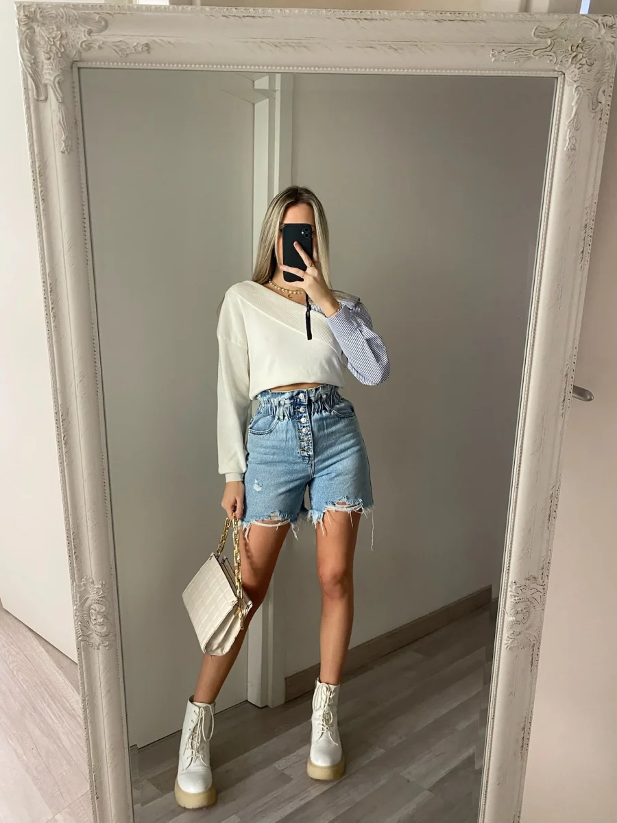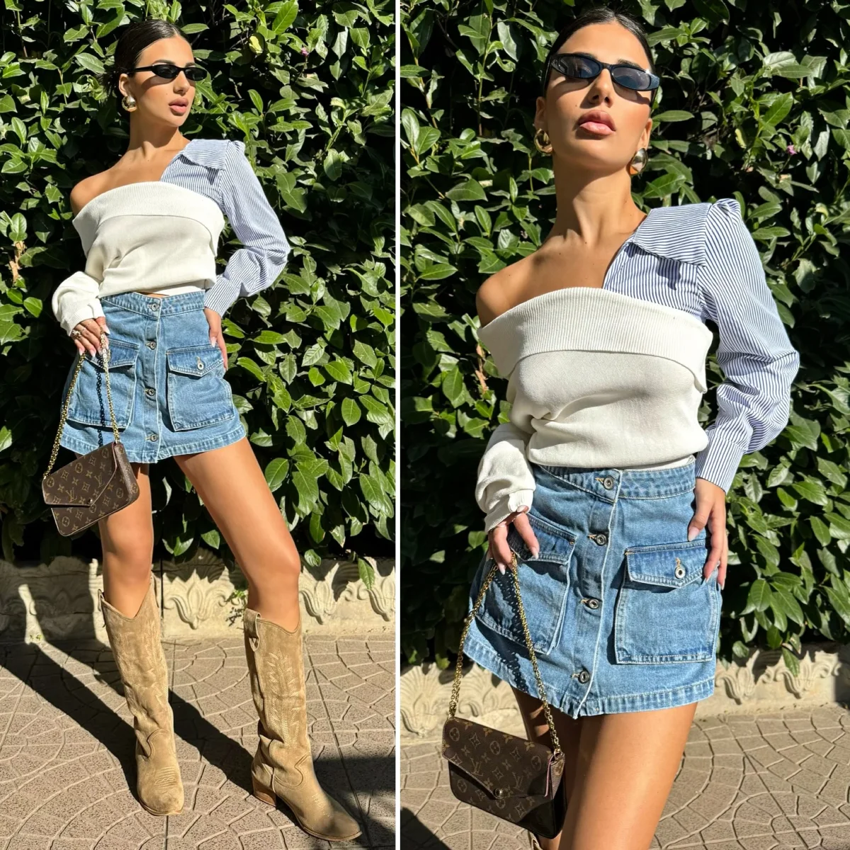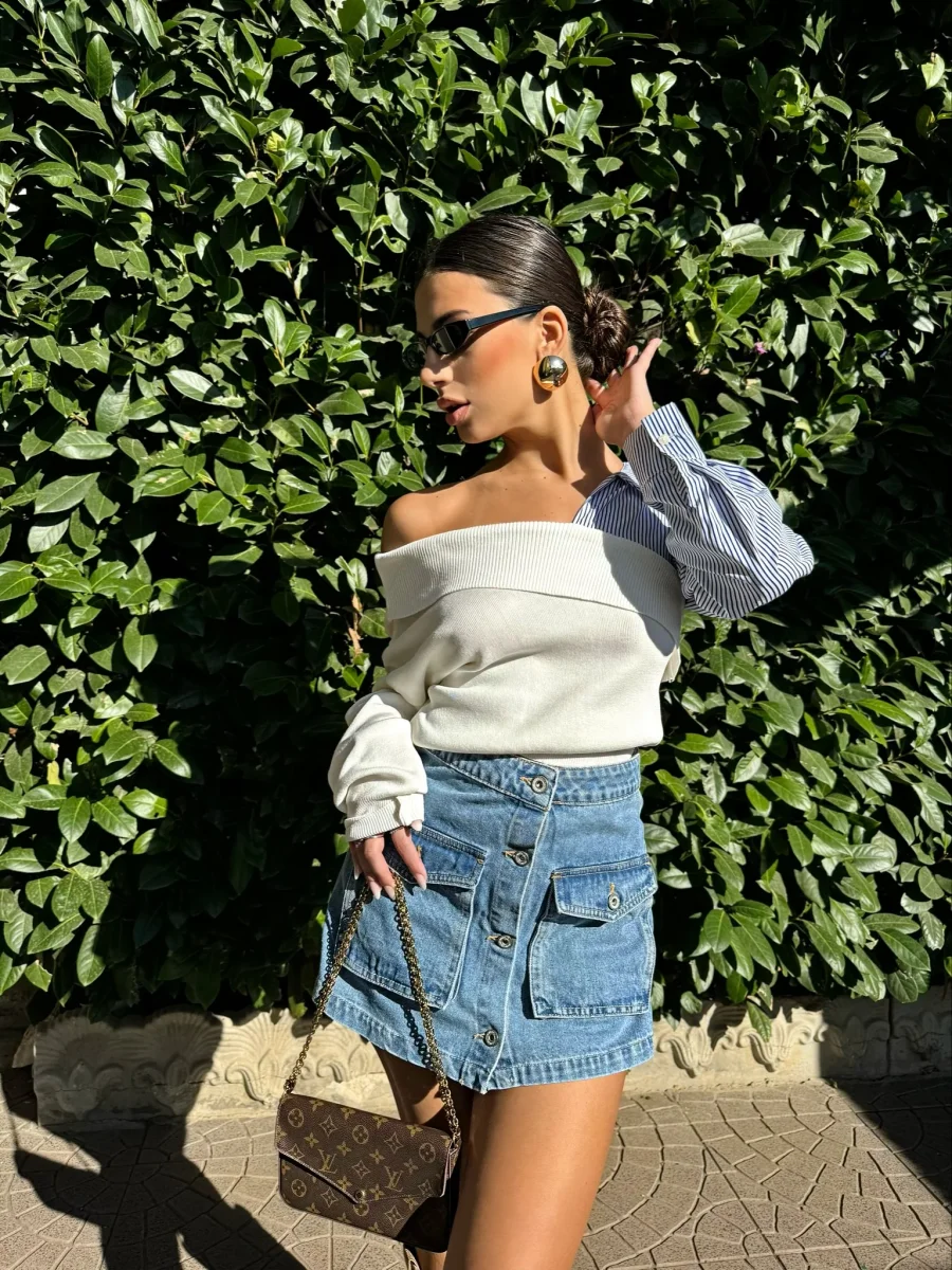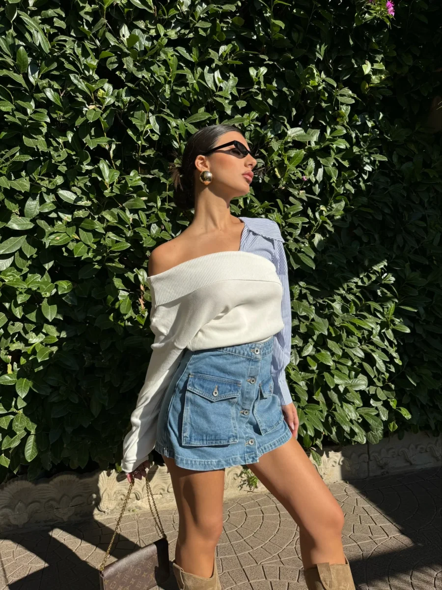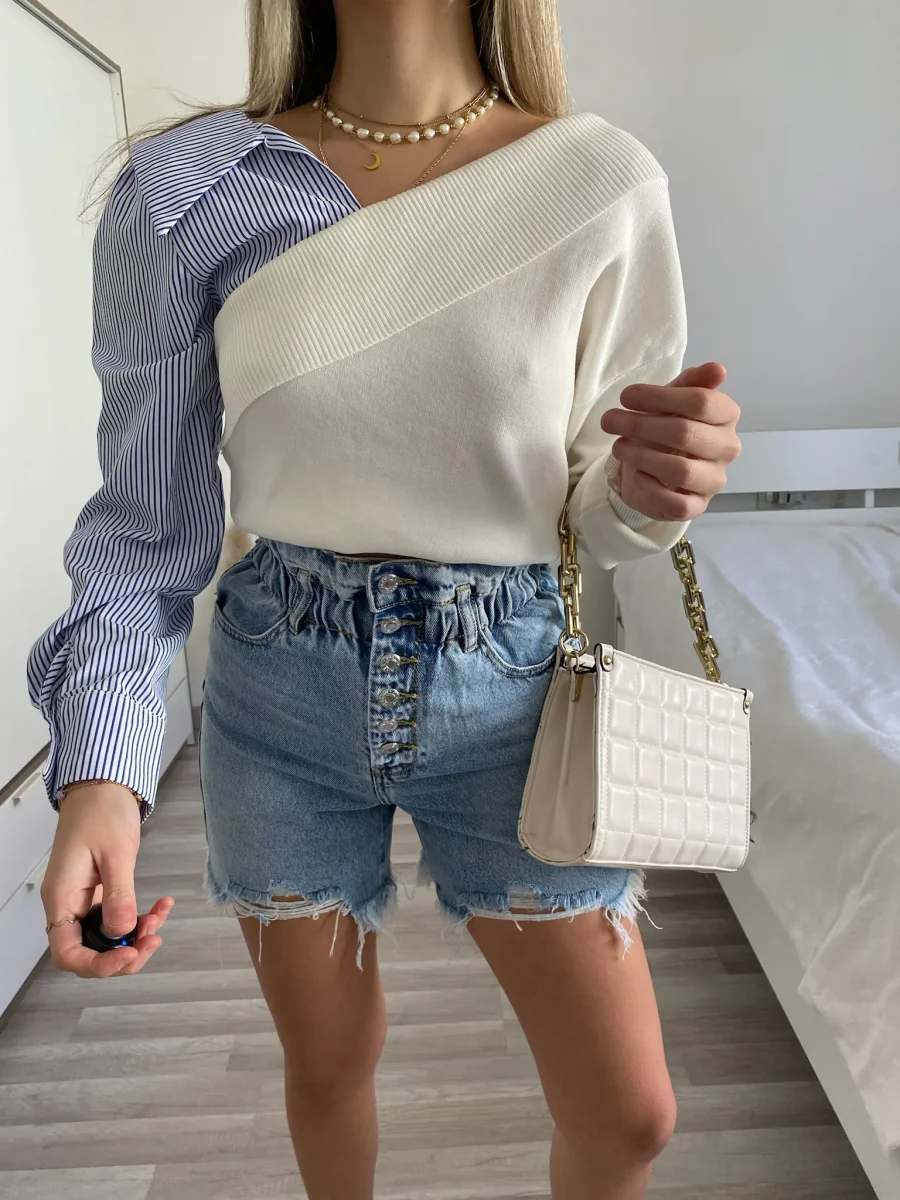 Maglioncino primaverile con scollo, particolare manica effetto camicia bianco e celeste