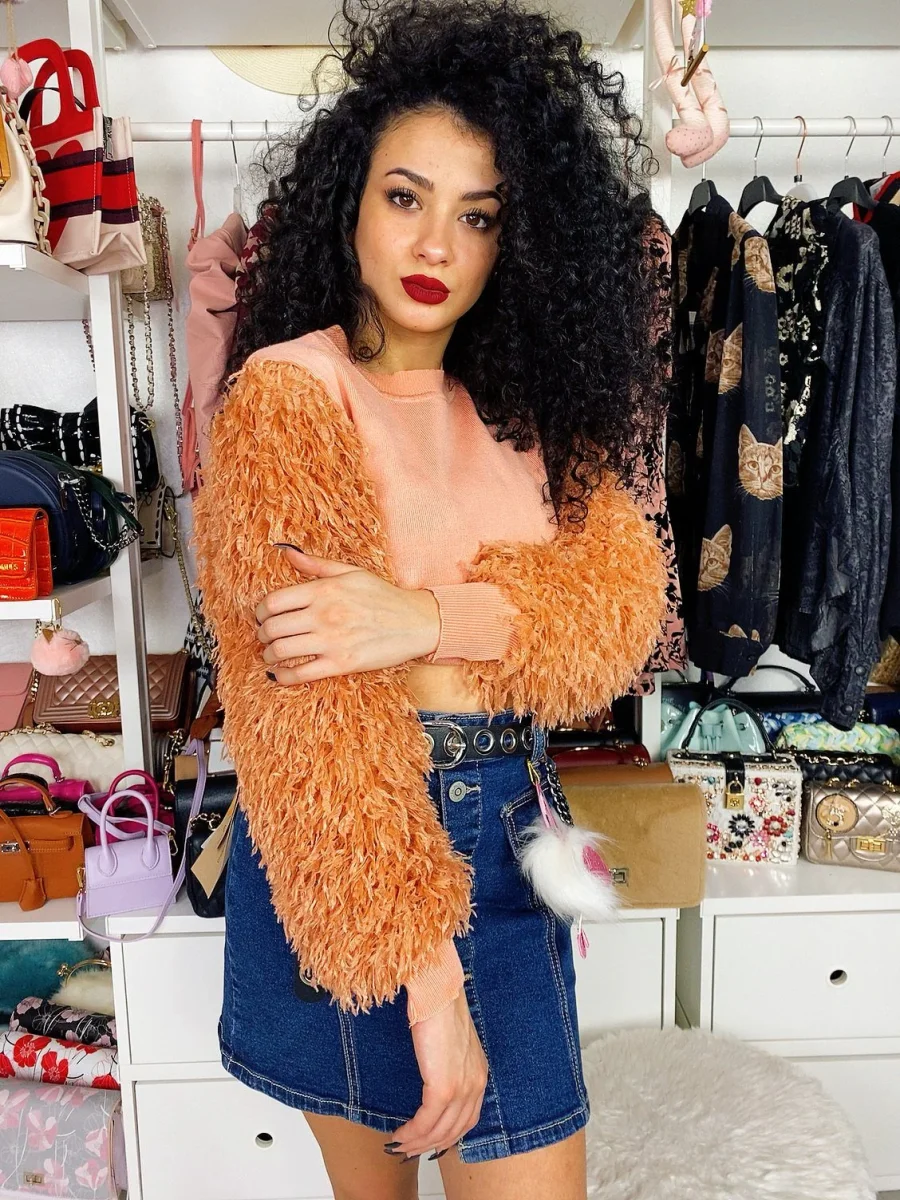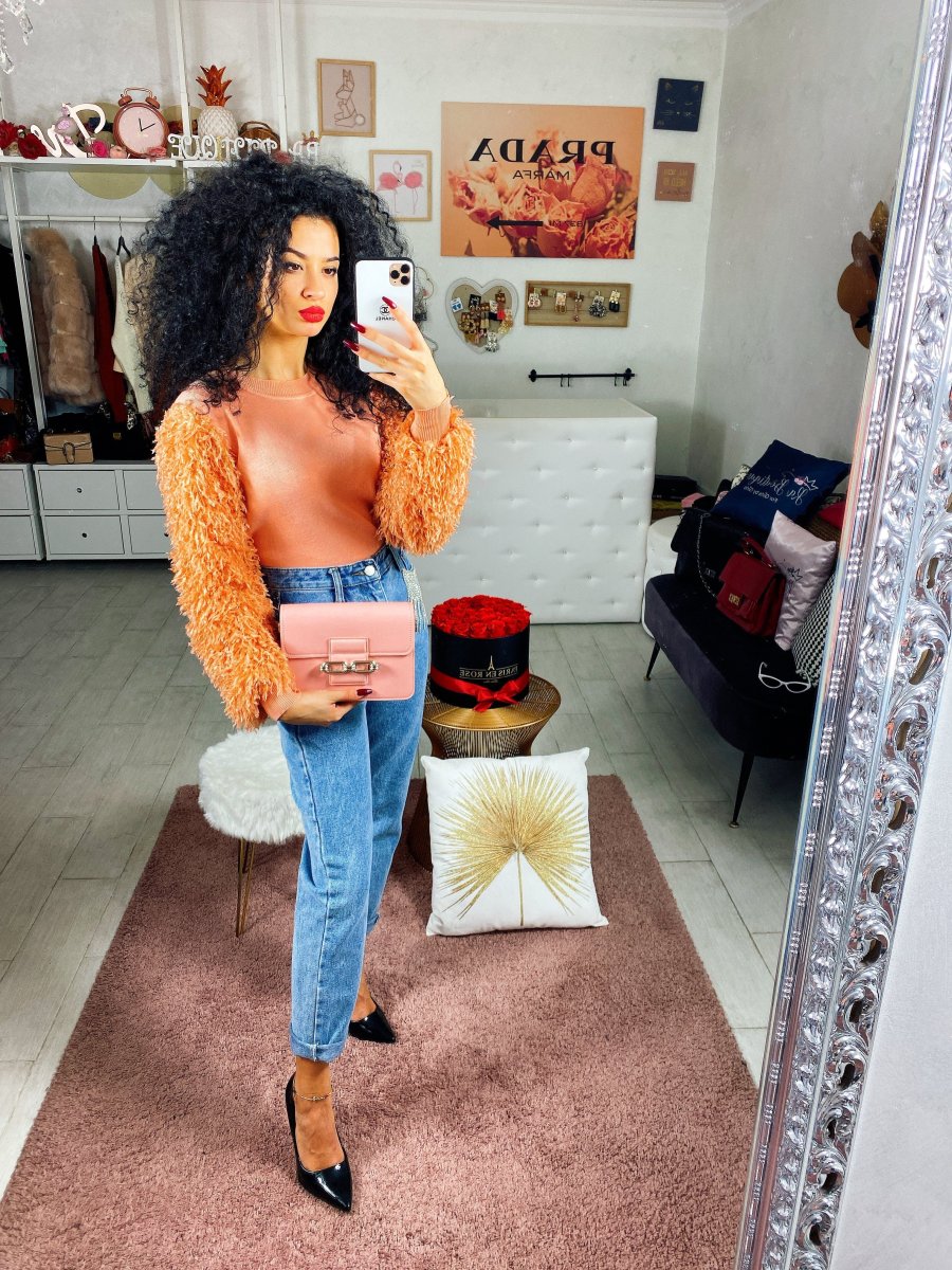 Maglione pesante con manicotti sulle maniche con frange. Tessuto elasticizzato taglia unica