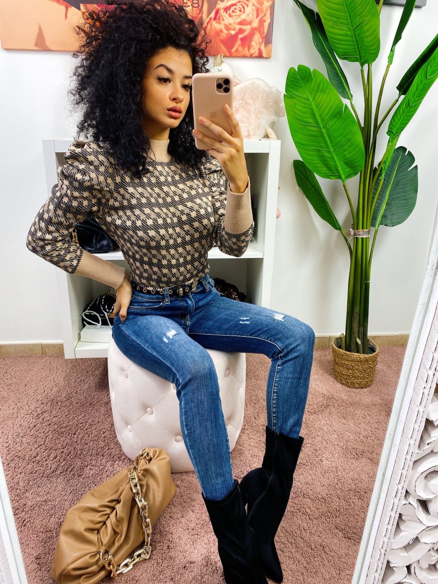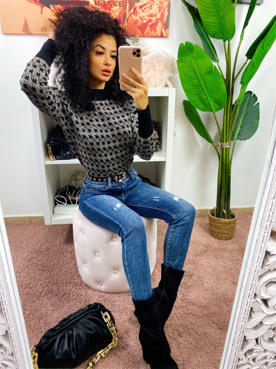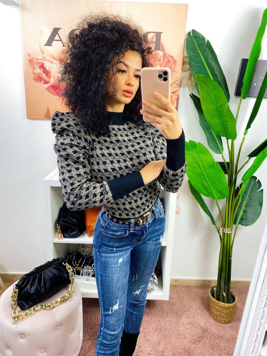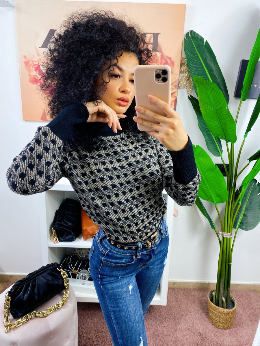 Maglione a collo alto in tessuto aderente. Trama pied de poule a contrasto. Taglia unica