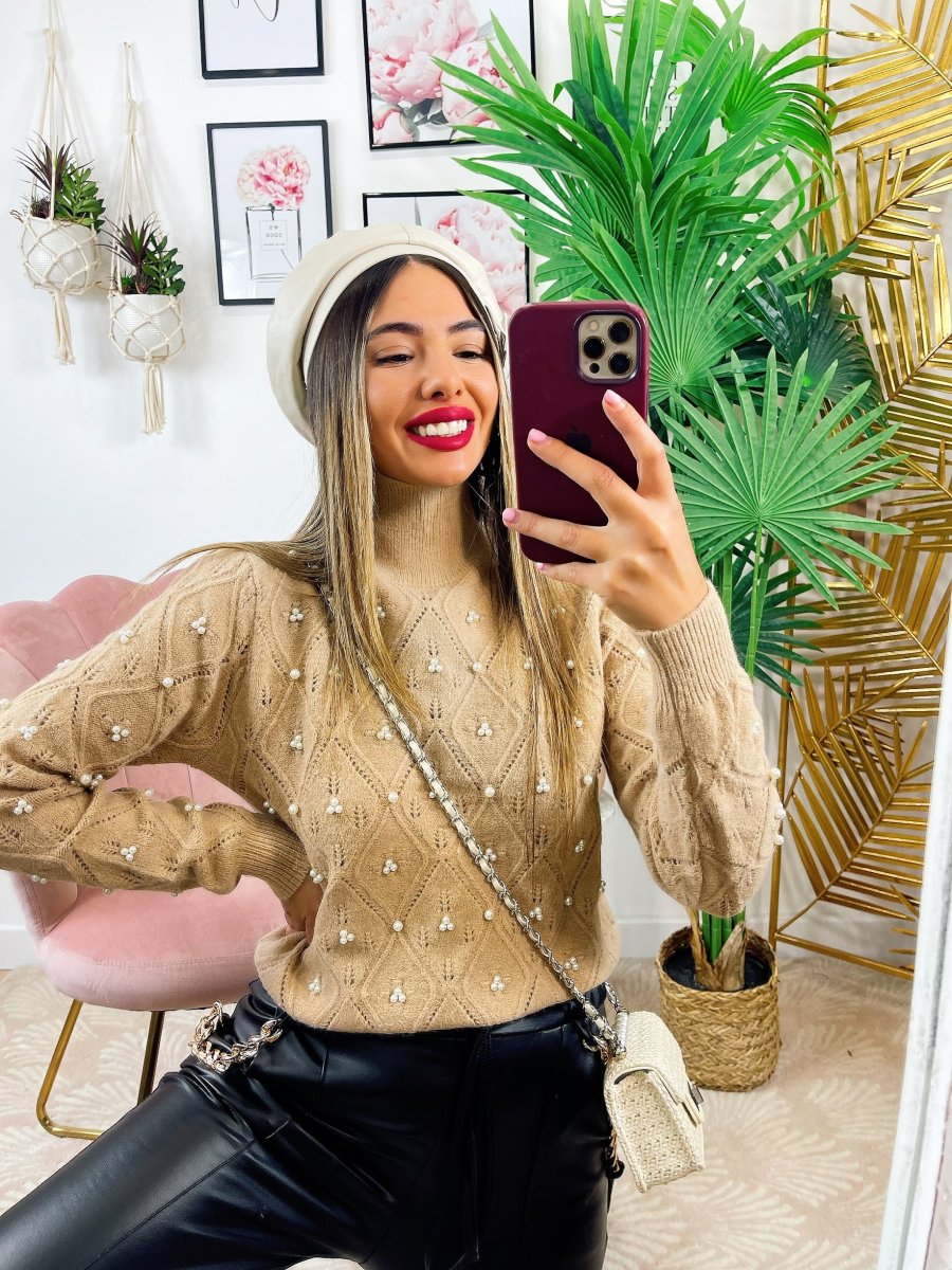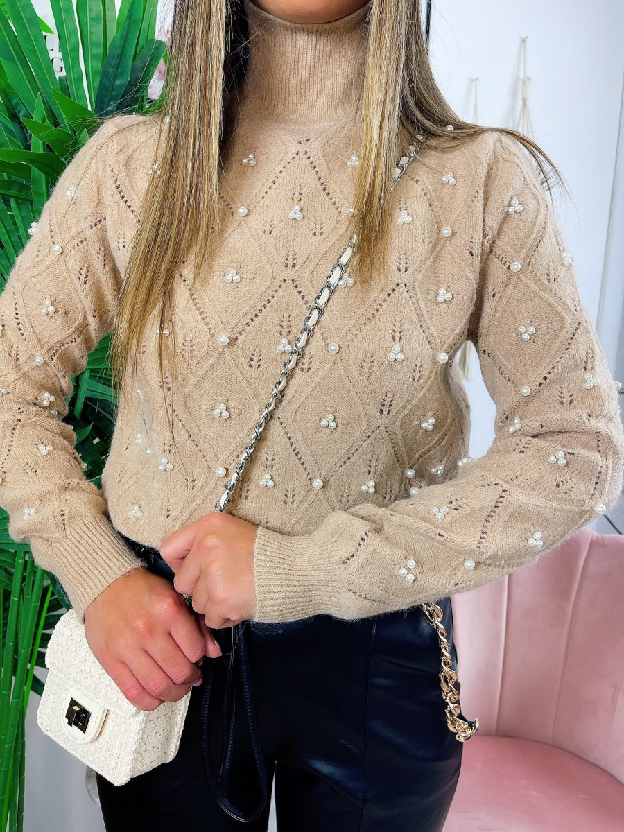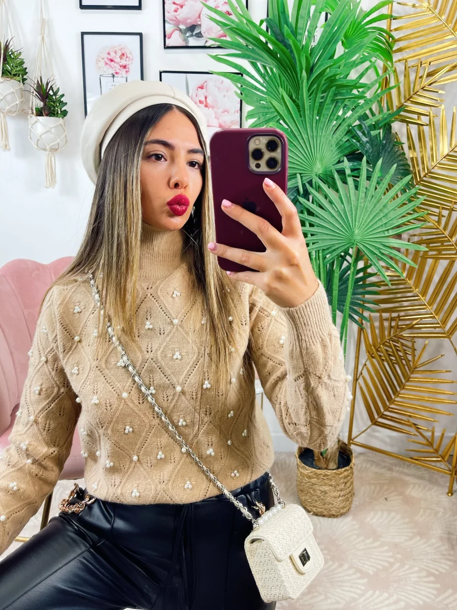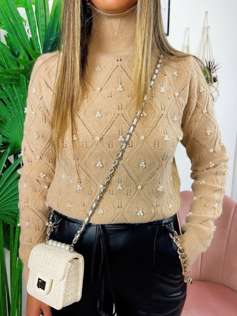 Maglione top quality con perle camel