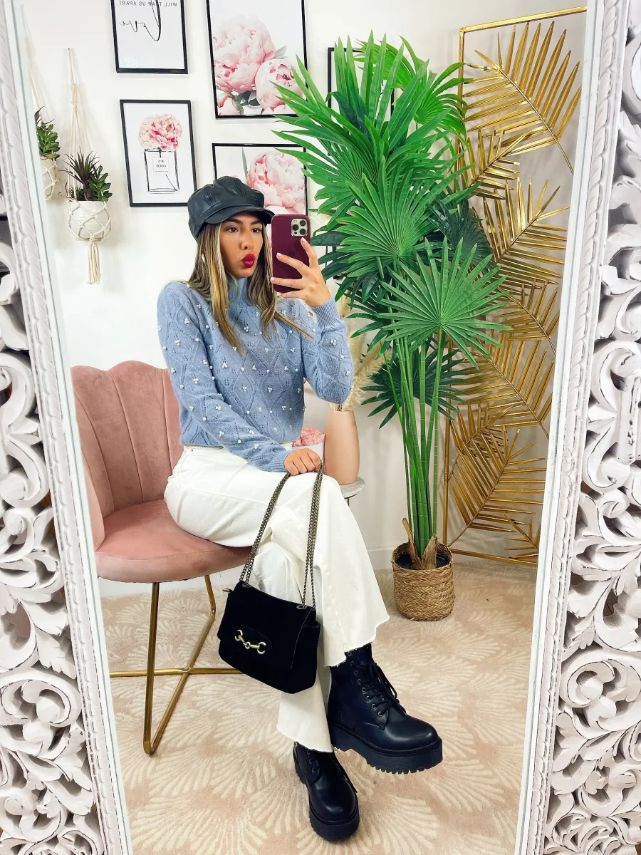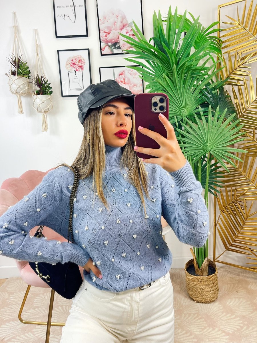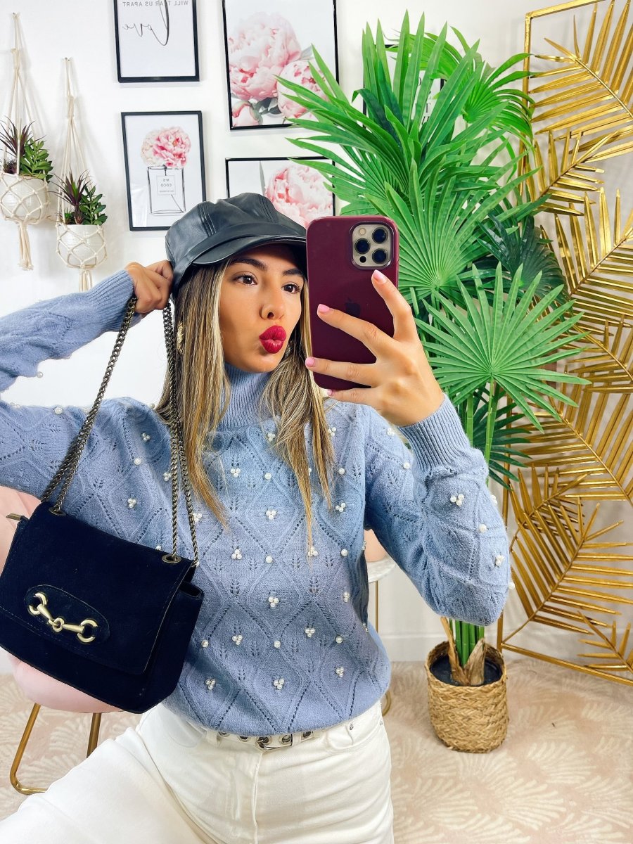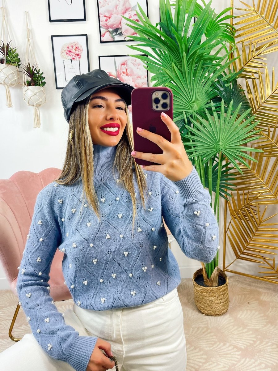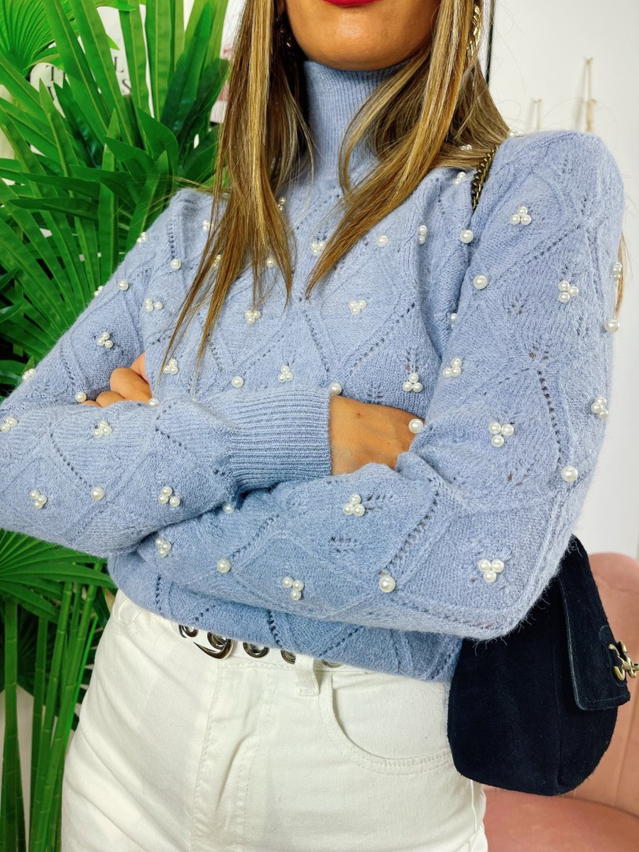 Maglione top quality con perle, morbido e caldo con collo leggermente alto.