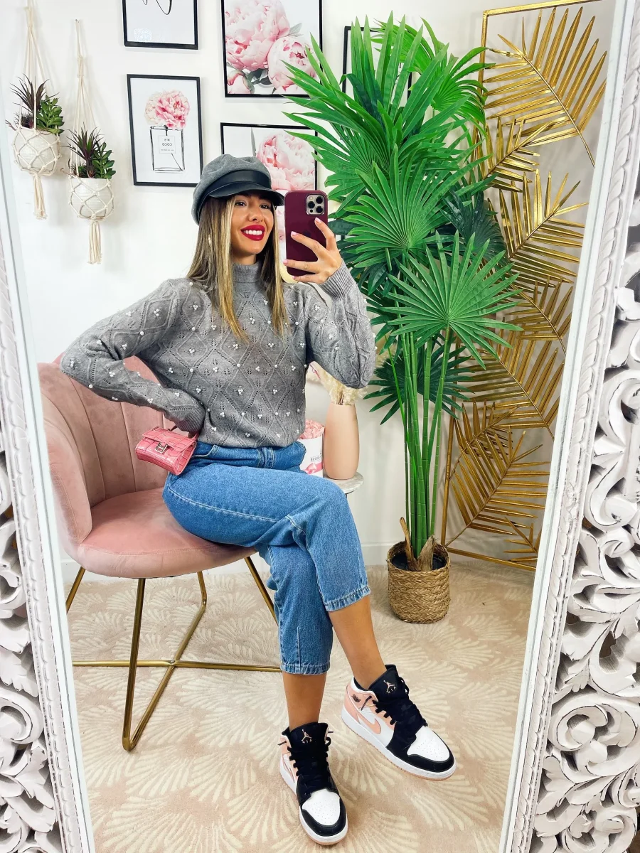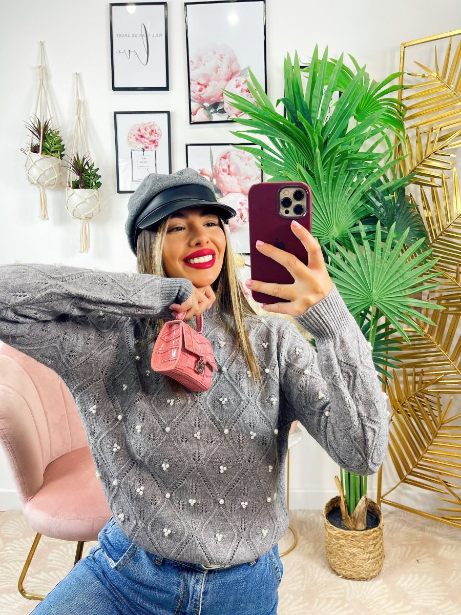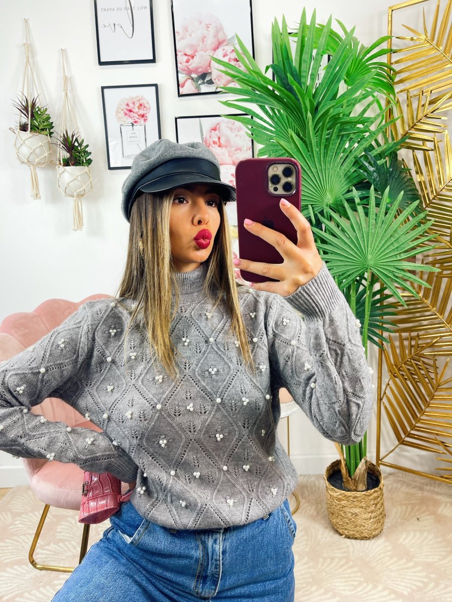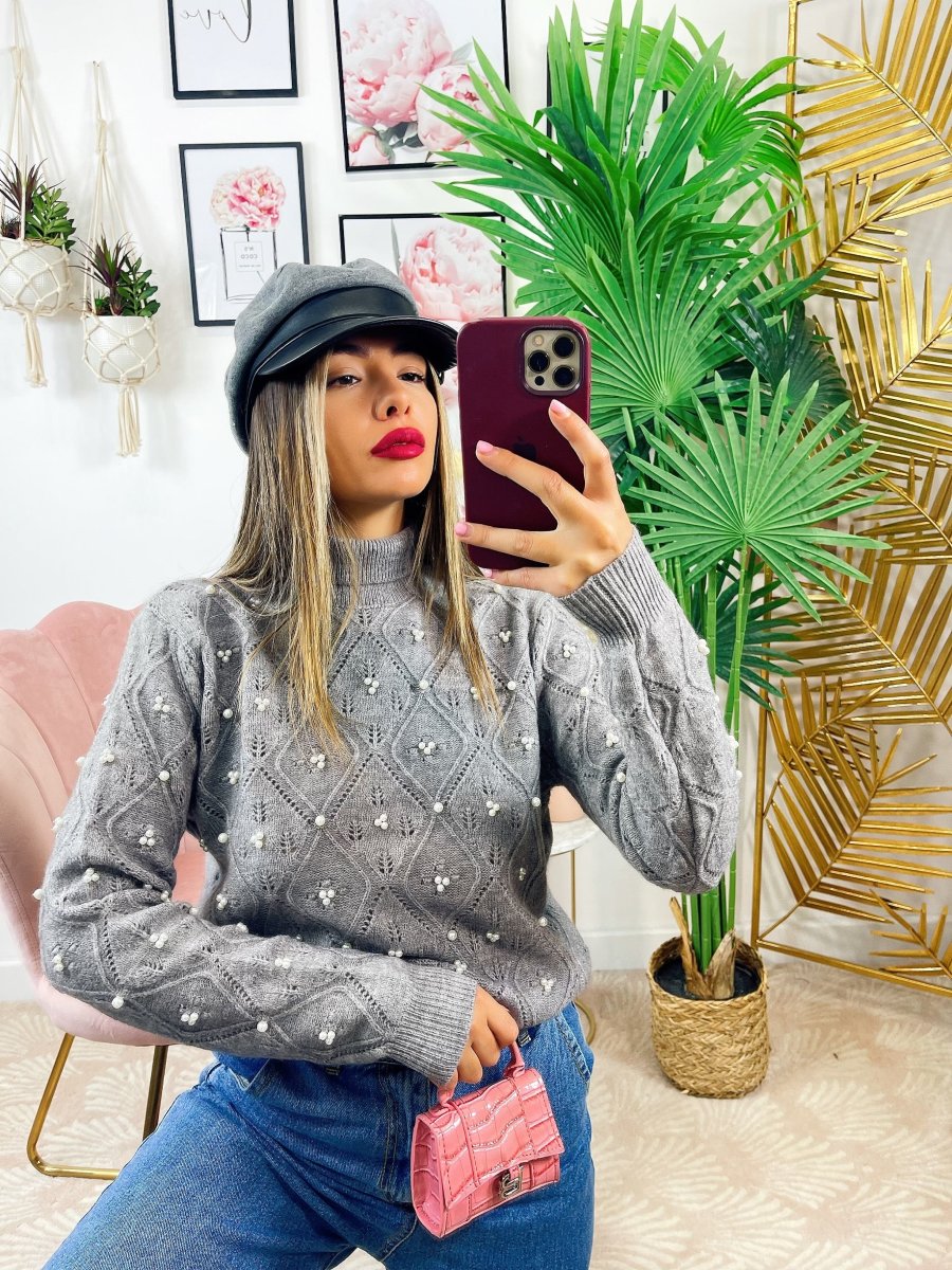Maglione top quality con perle, morbido e caldo con collo leggermente alto.
