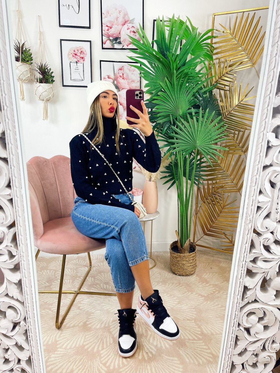Maglione top quality con perle, morbido e caldo con collo leggermente alto.