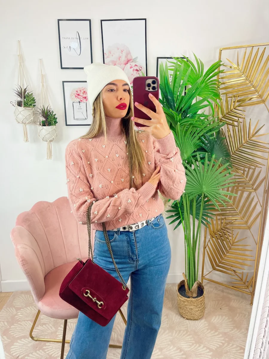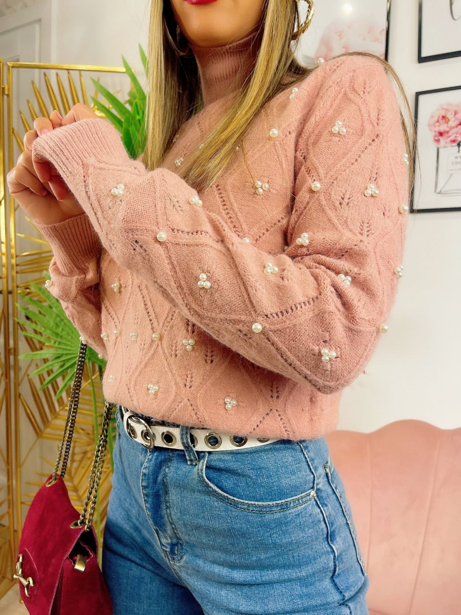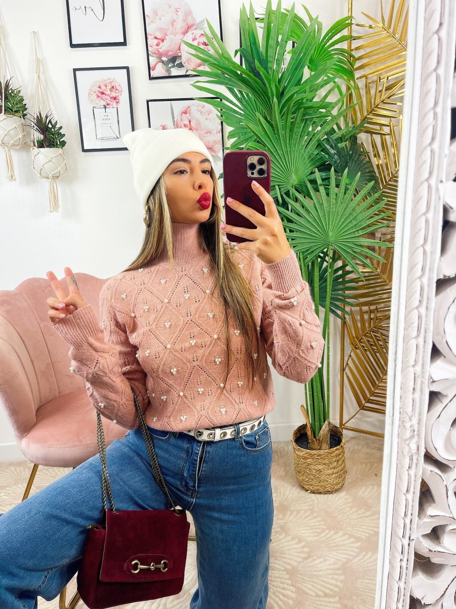 Maglione top quality con perle, morbido e caldo con collo leggermente alto.