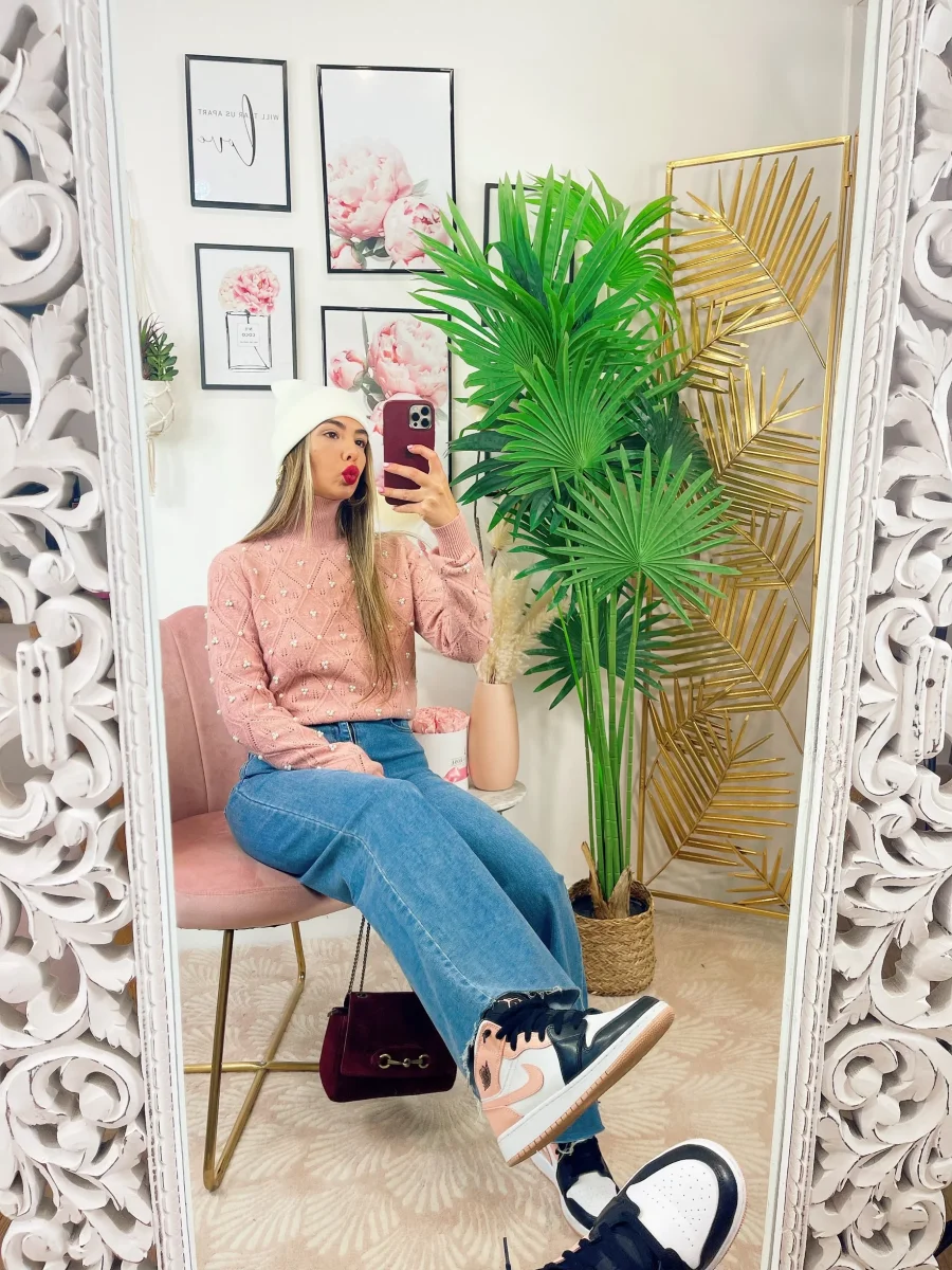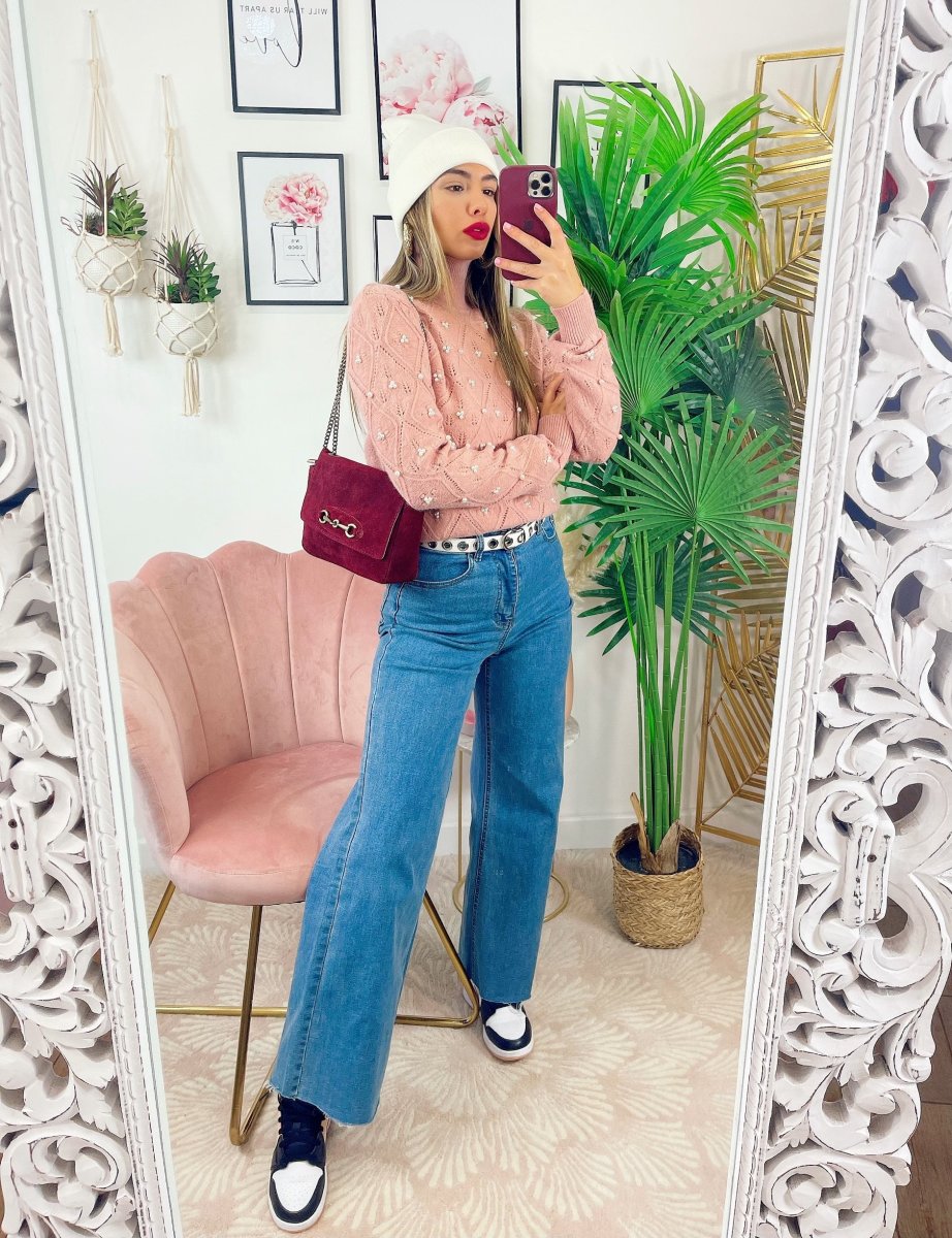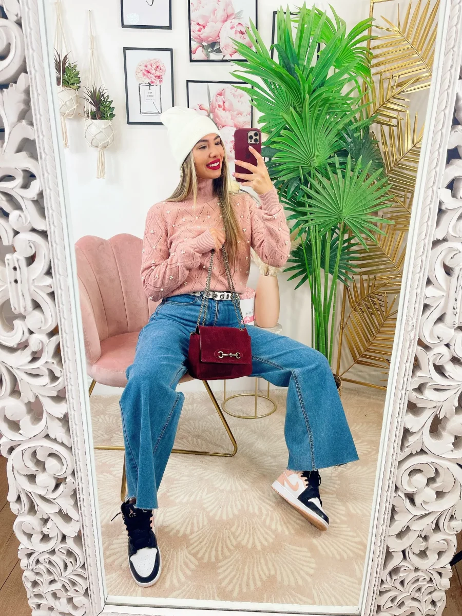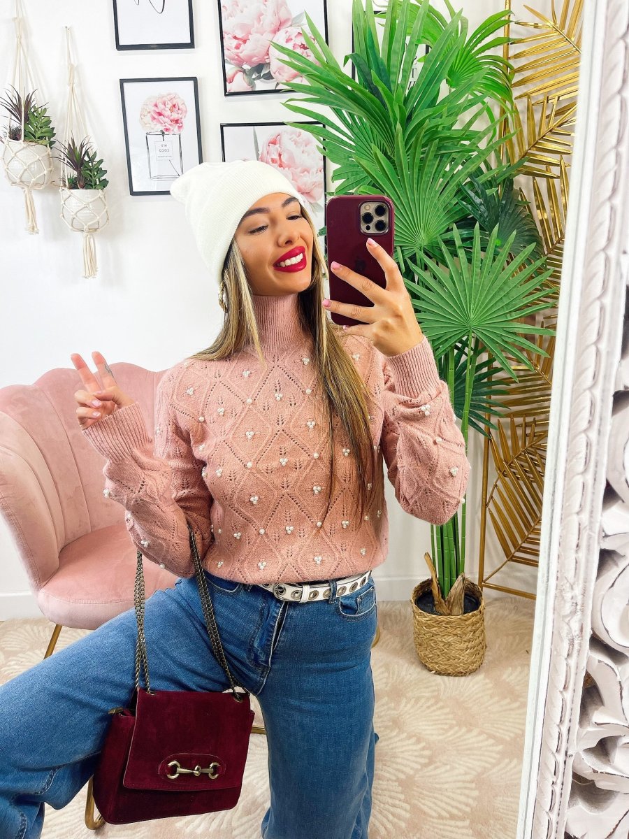 Maglione top quality con perle, morbido e caldo con collo leggermente alto.
