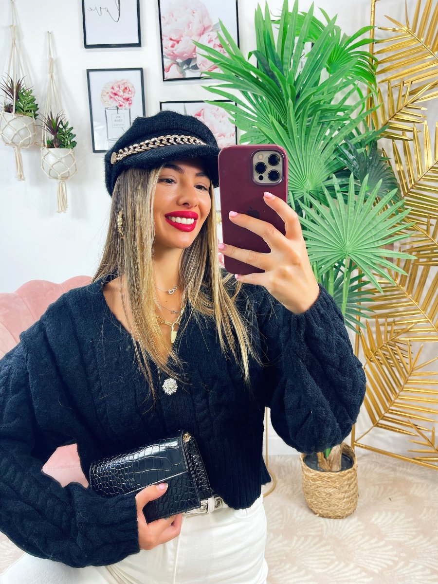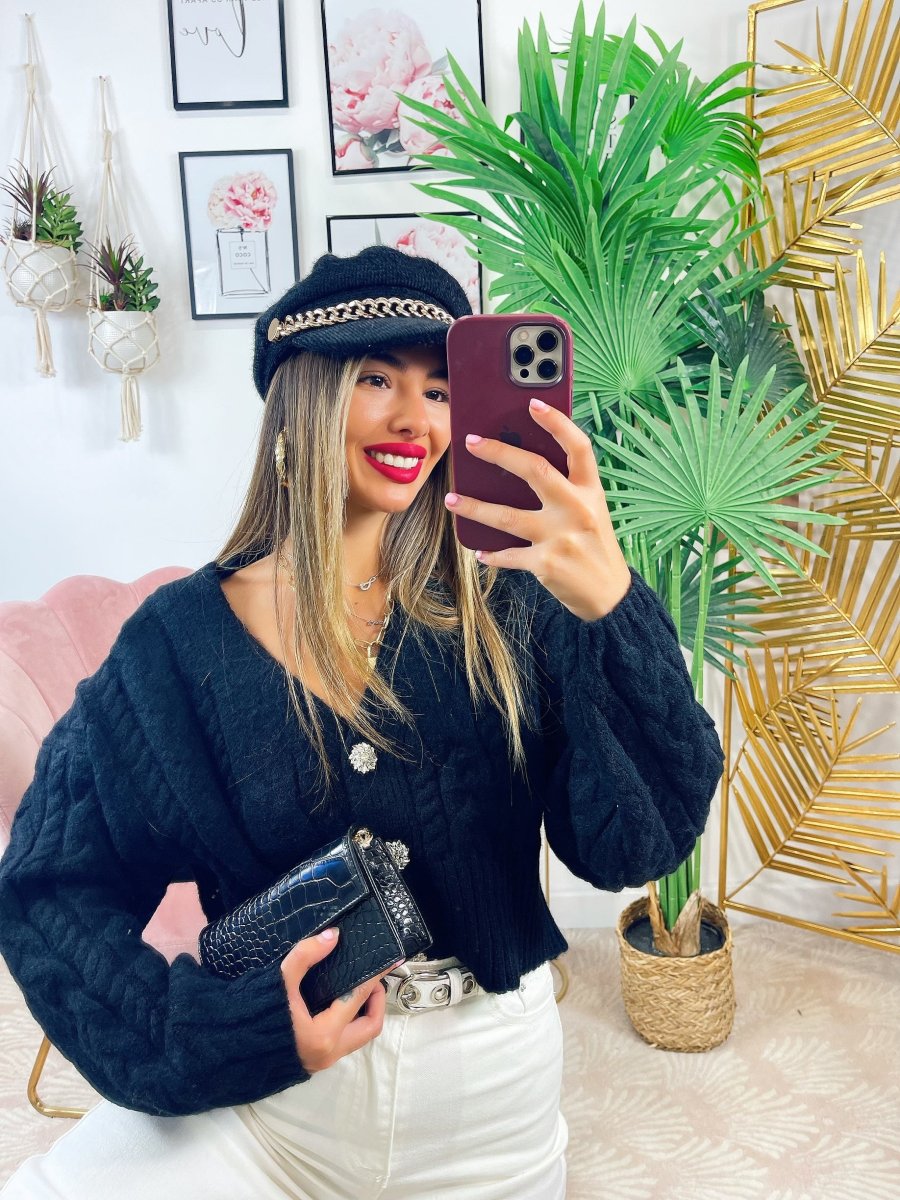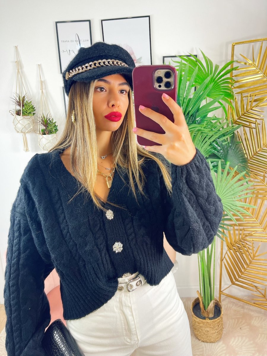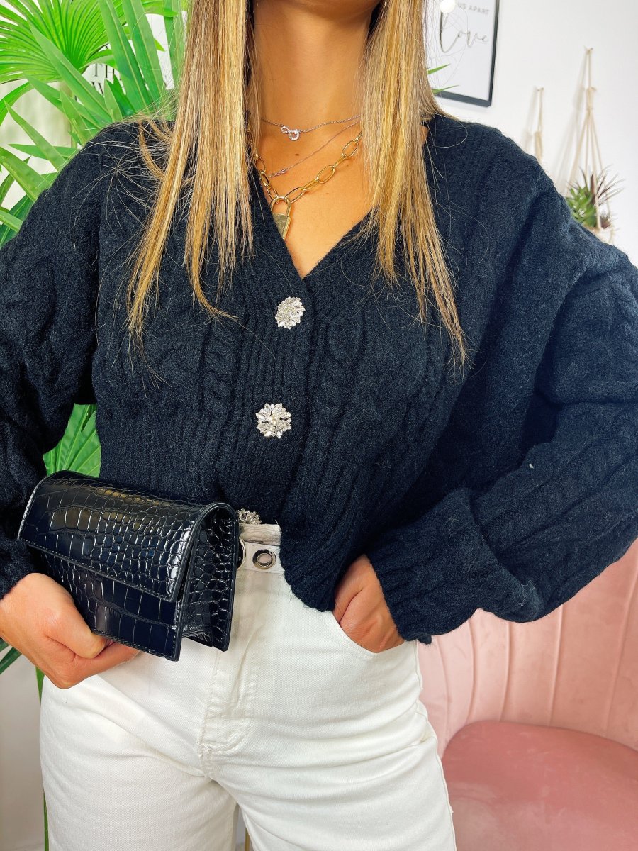 Maglione top quality con gioiello in strass, scollo a V da usare anche come cardigan.