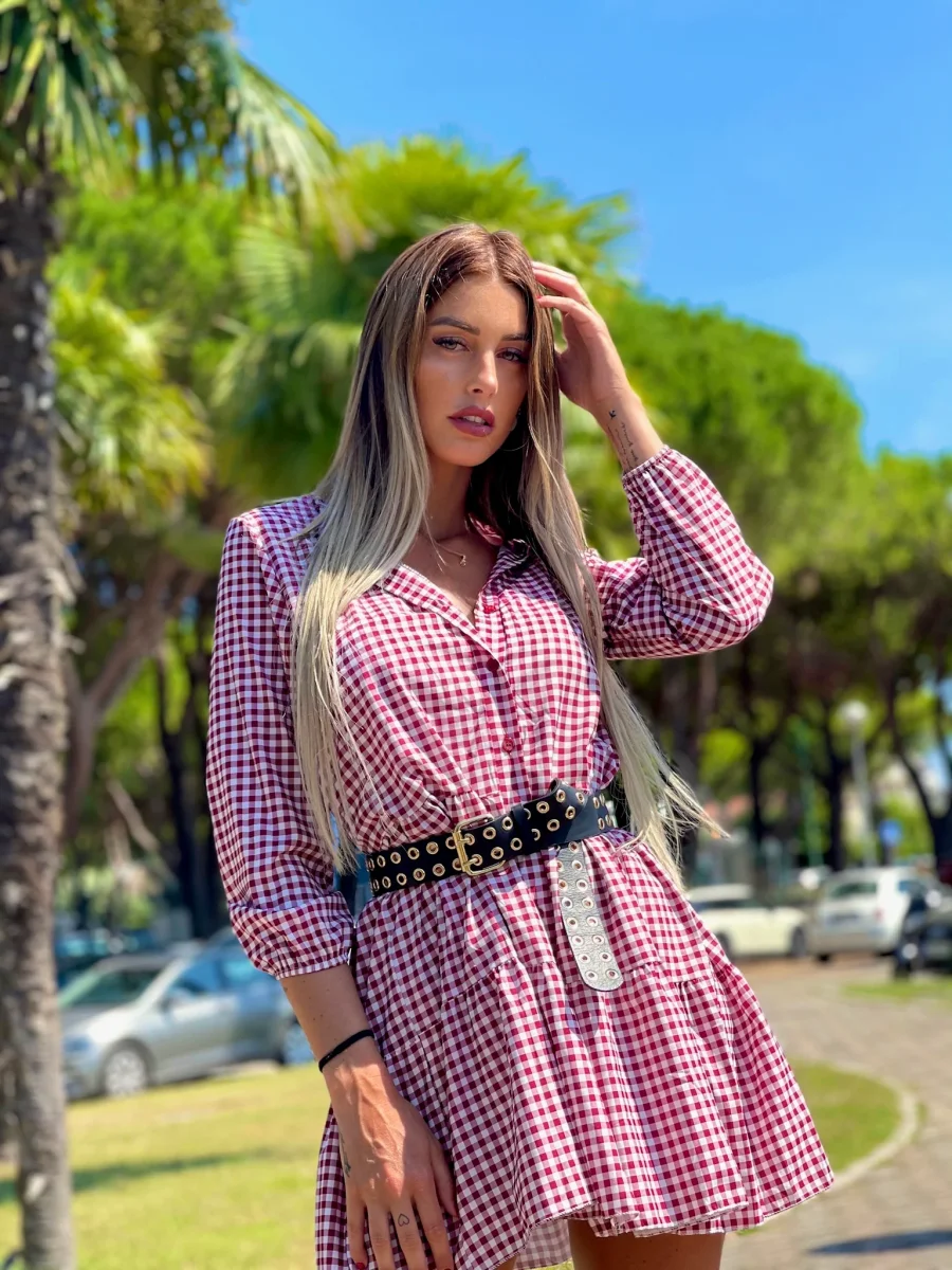 Maxi abito con bottoncini ampissimo, perfetto quindi con la cintura. Manica lunga a fantasia a quadri