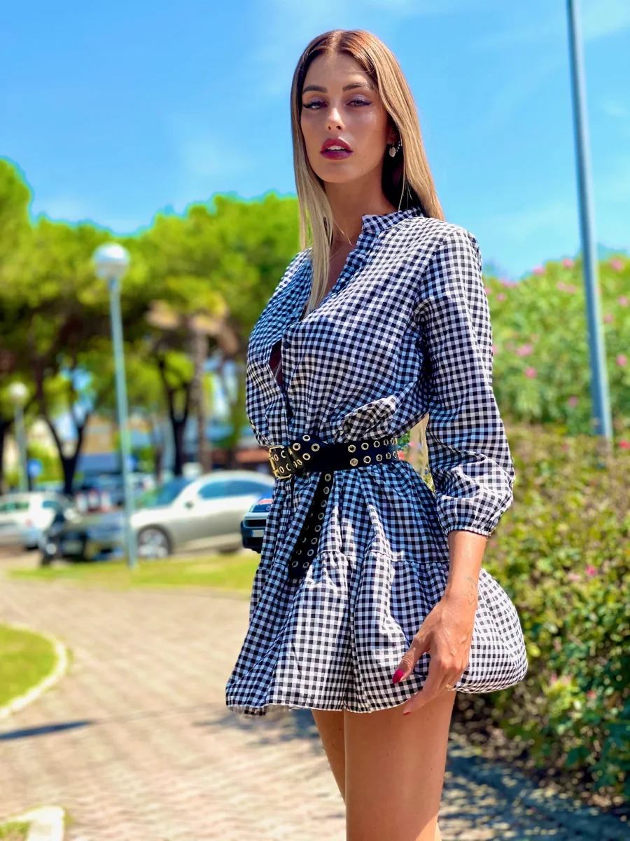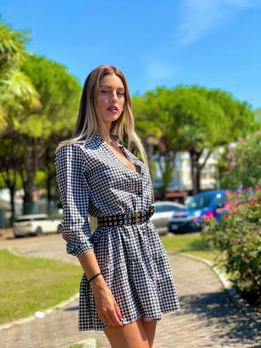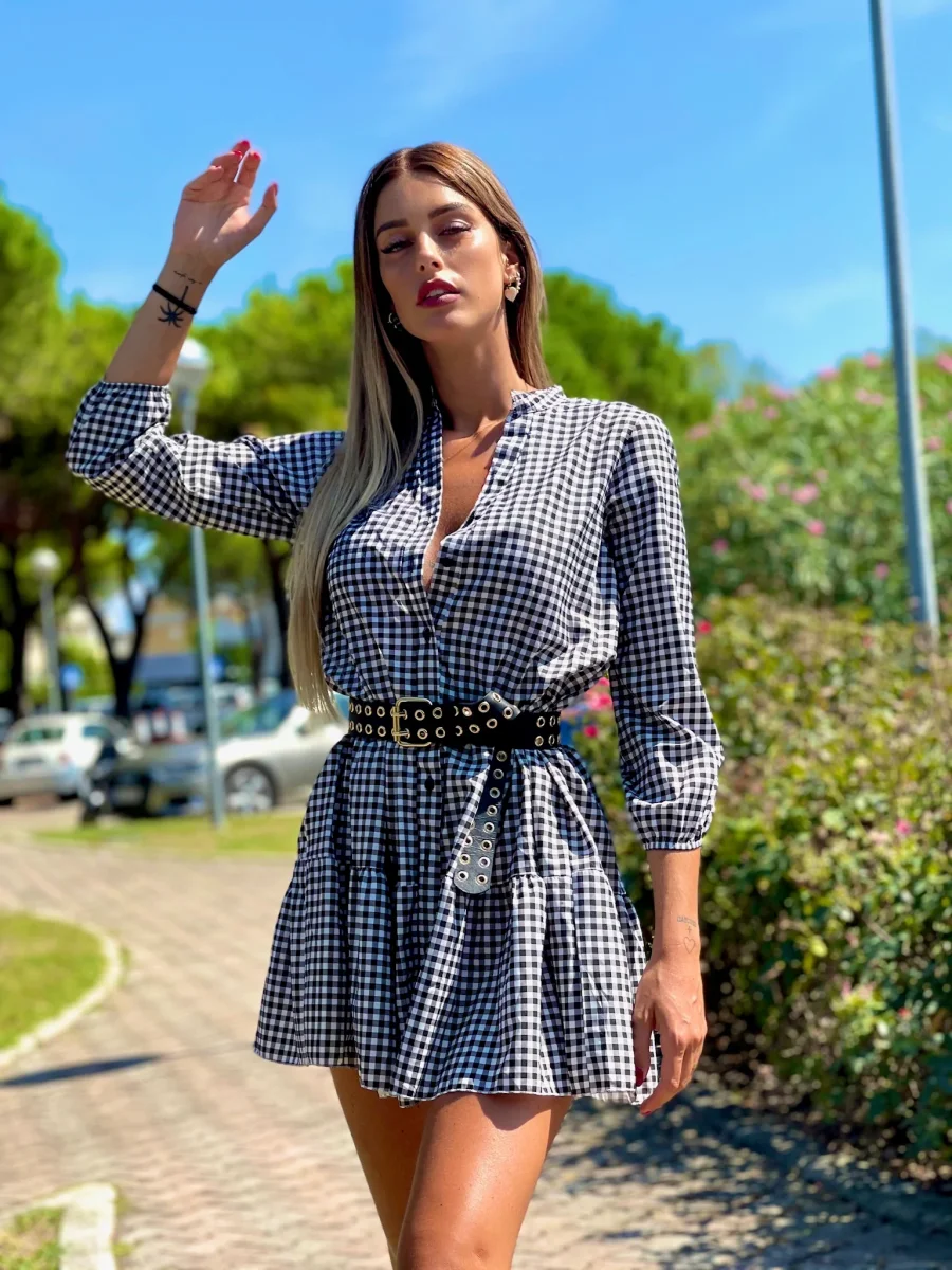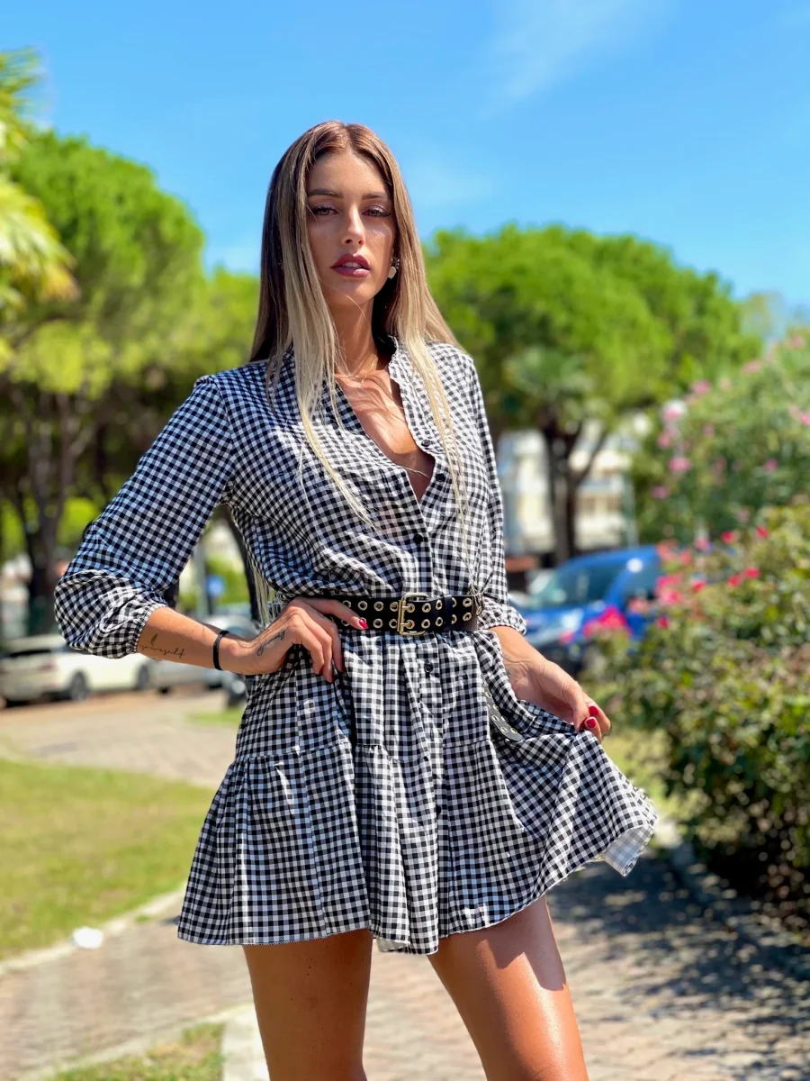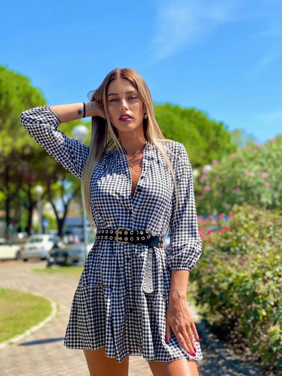 Maxi abito con bottoncini ampissimo, perfetto quindi con la cintura. Manica lunga a fantasia a quadri