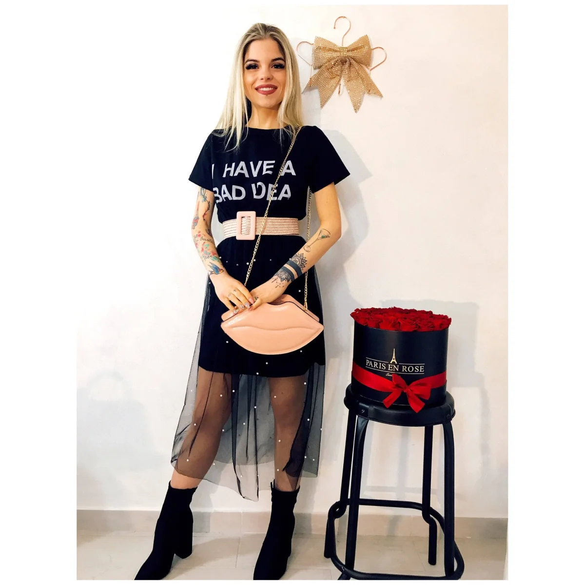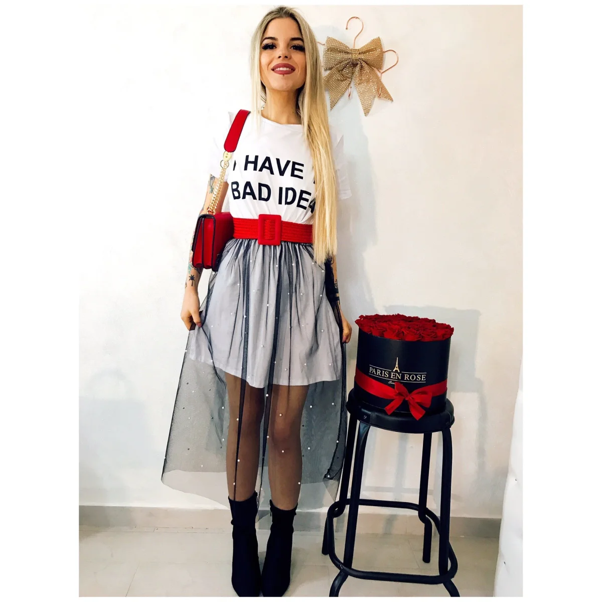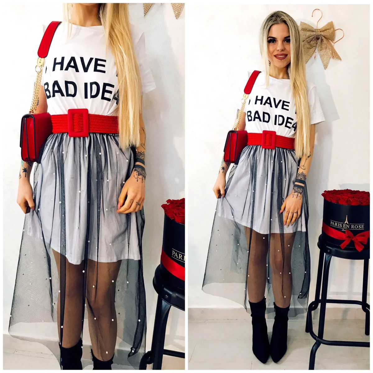 Maxi maglia con scritta stampata. Gonna in tulle con perle.