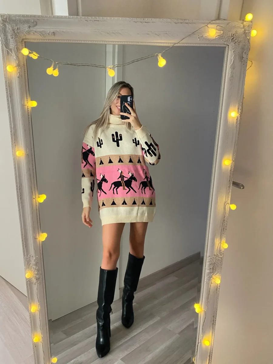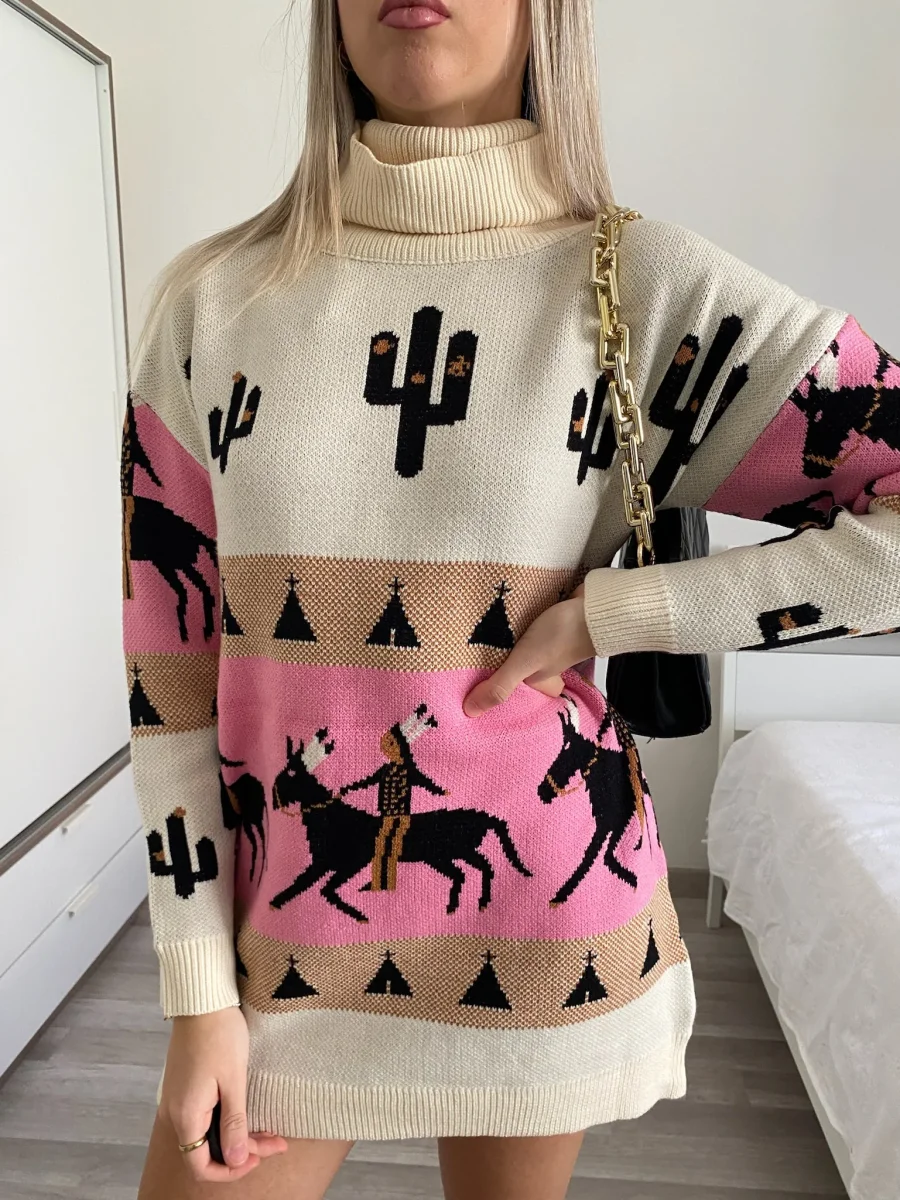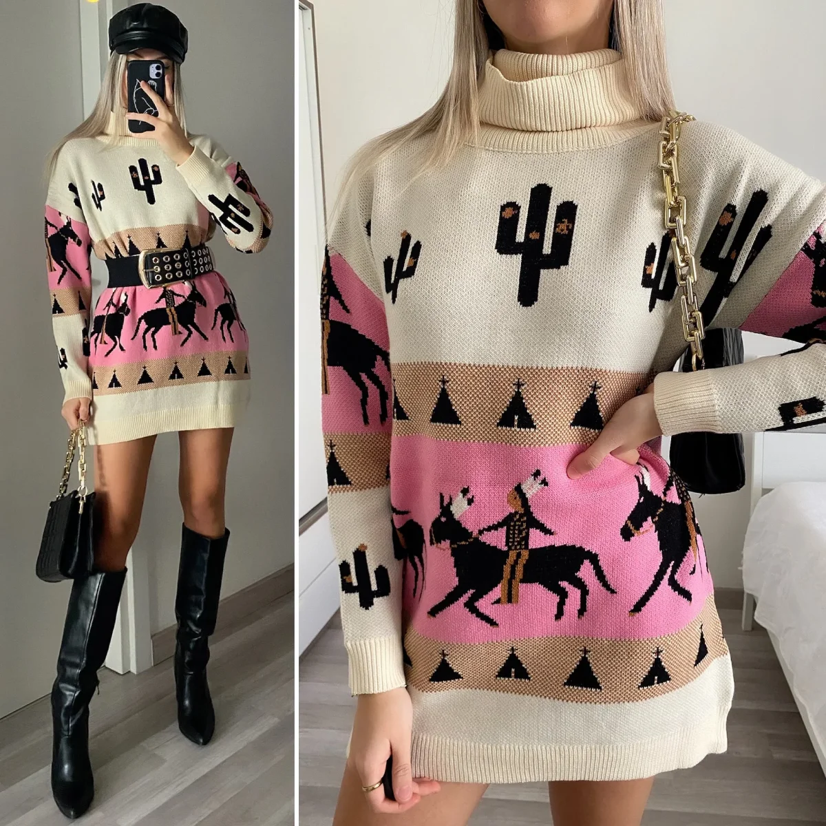 Maxi maglia o mini Dress a collo alto in tessuto caldissimo e pesante. Stampa a fantasia.