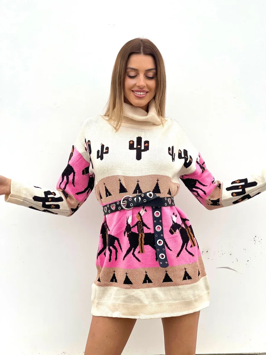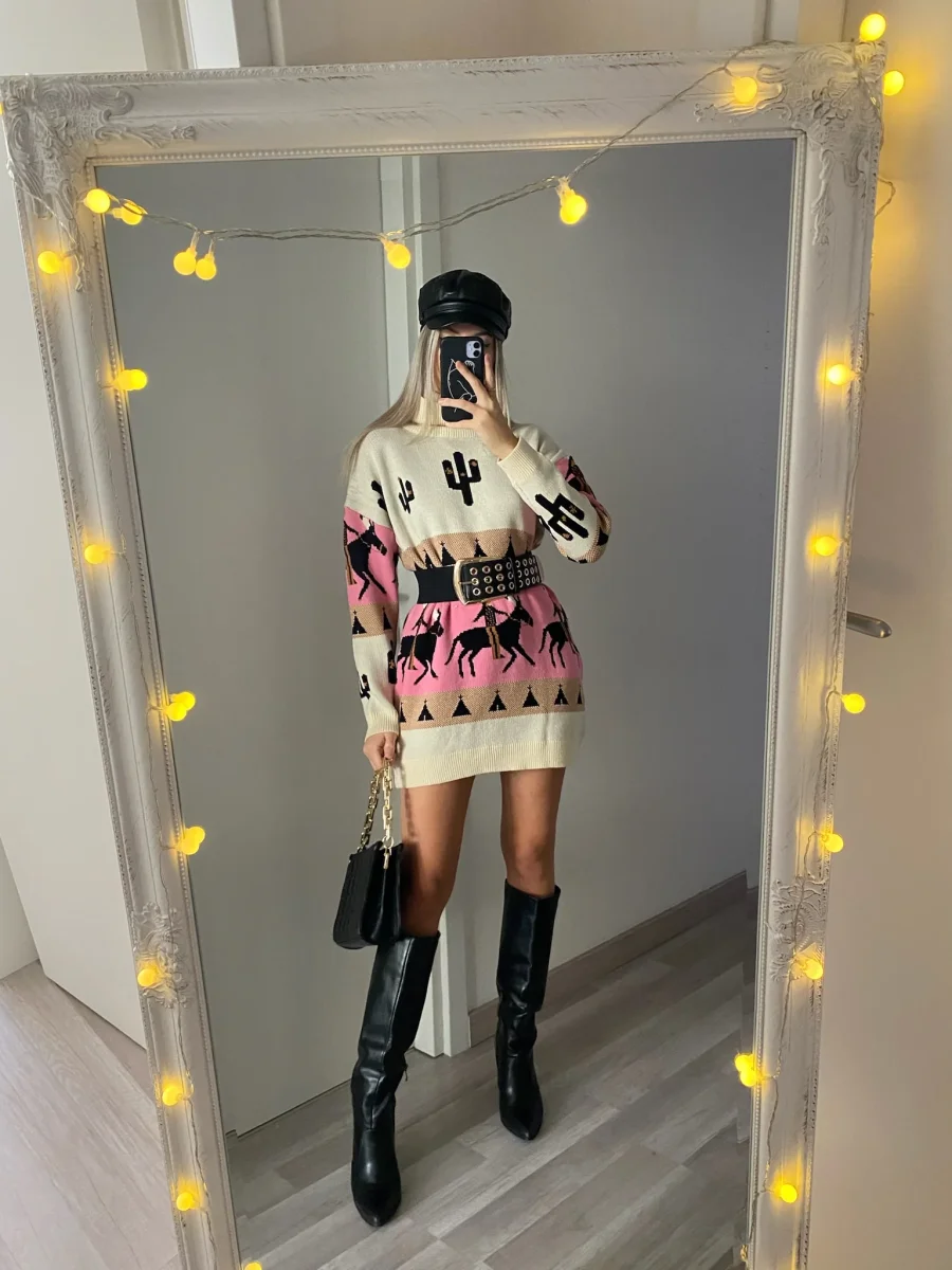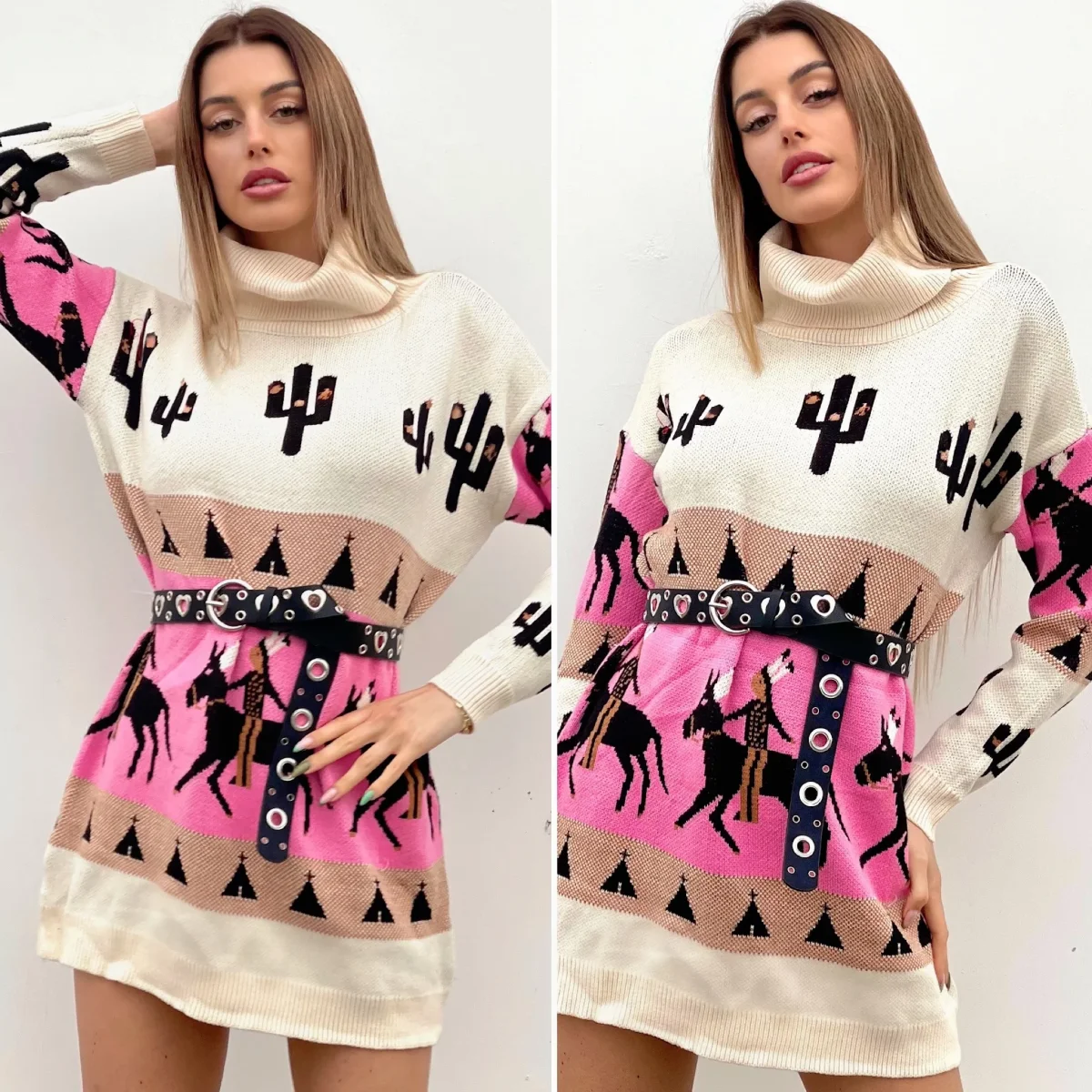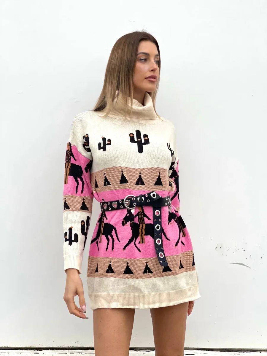 Maxi maglia o mini Dress a collo alto in tessuto caldissimo e pesante. Stampa a fantasia.