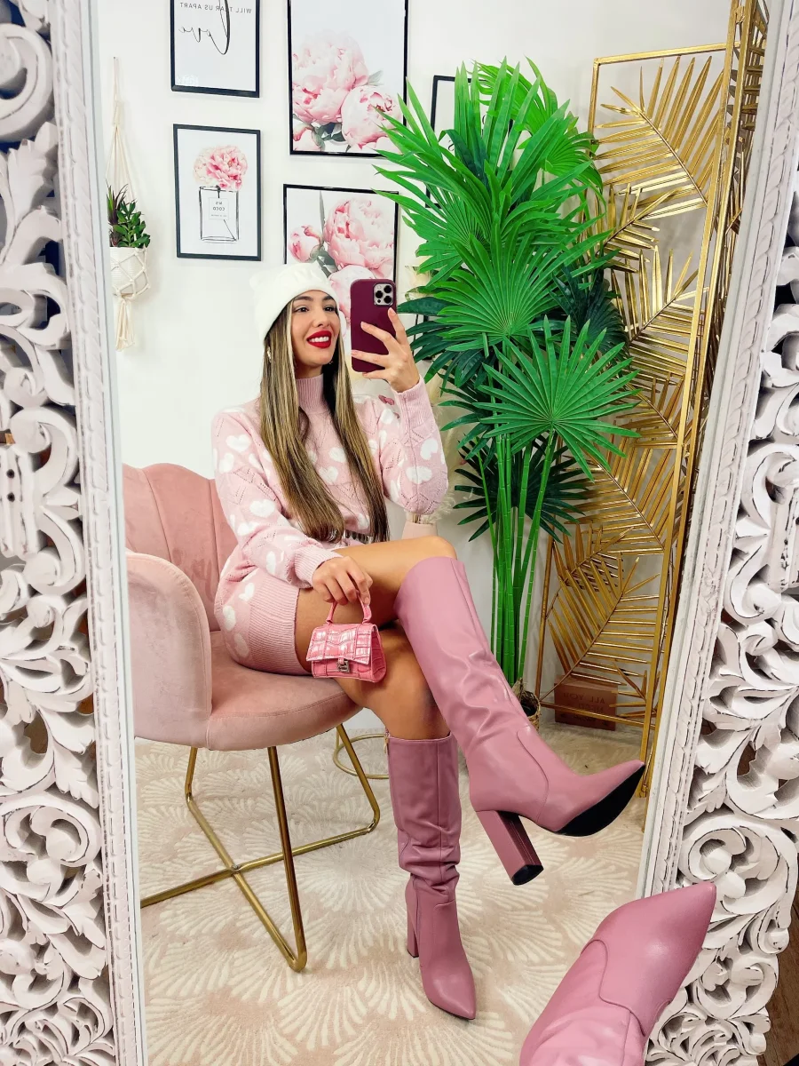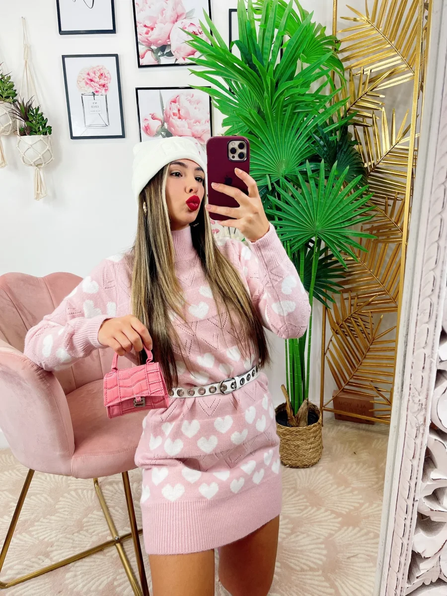 Maxi maglione rosa a cuori modello medio lungo, fantasie a contrasto