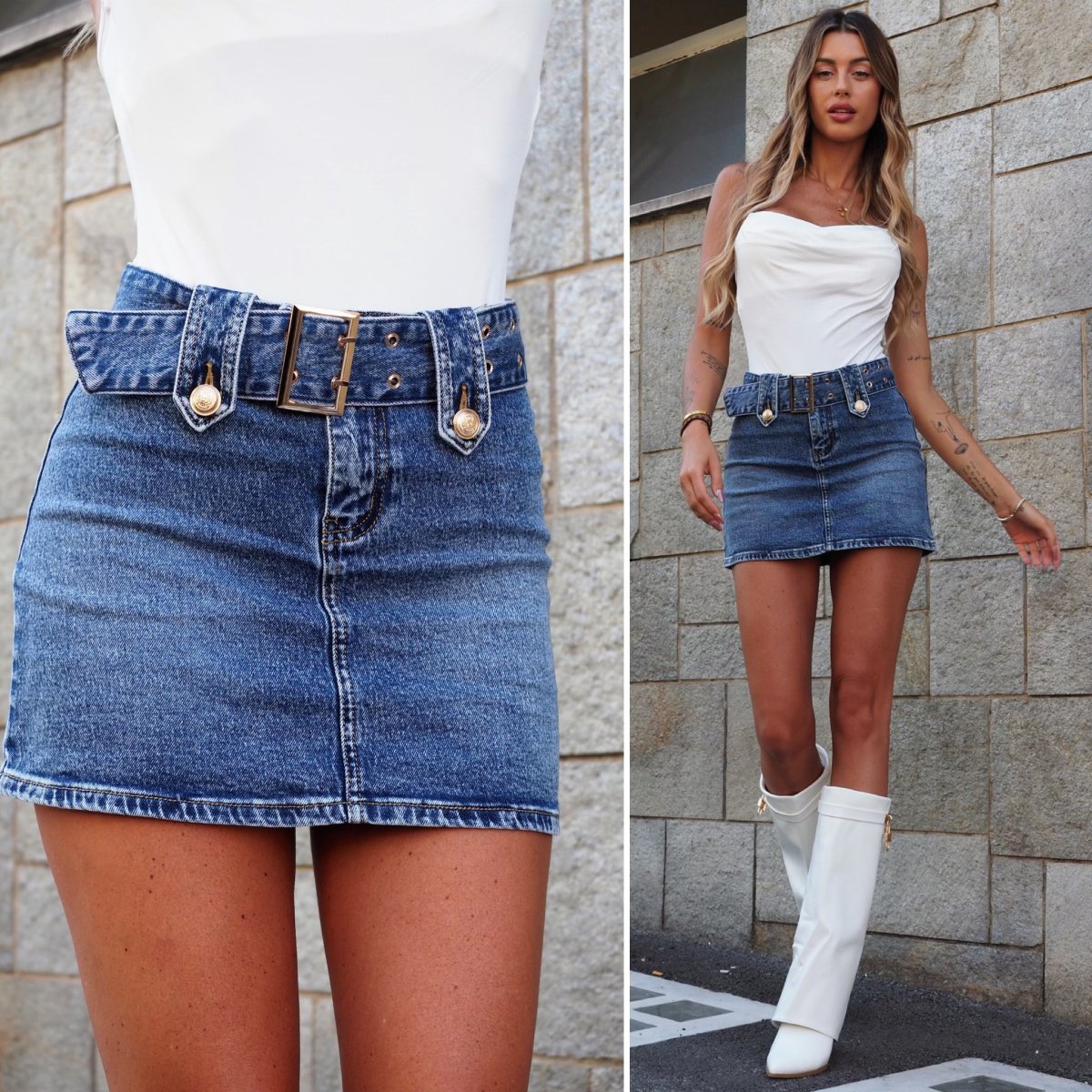 Mini gonna in jeans non elasticizzata con cintura in vita con dettagli oro . Vita bassissima