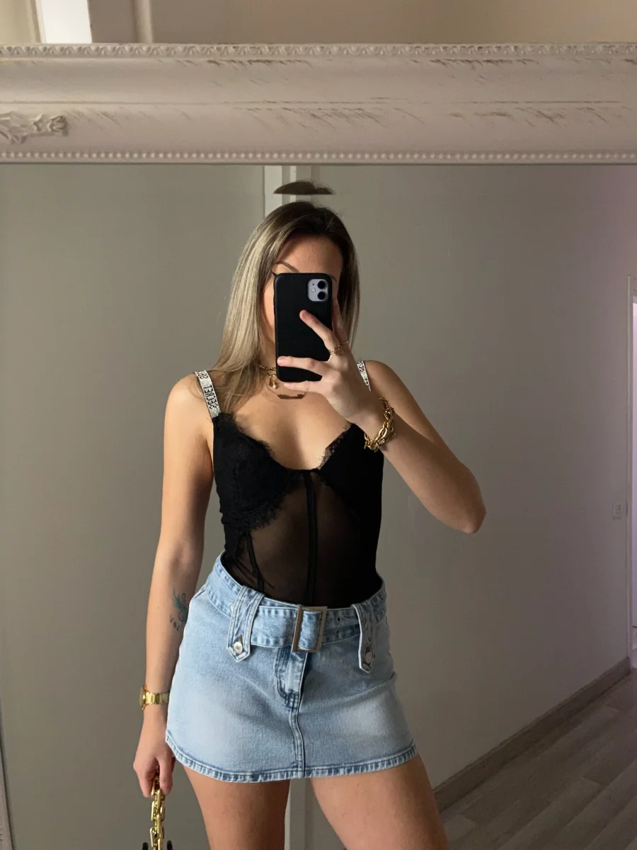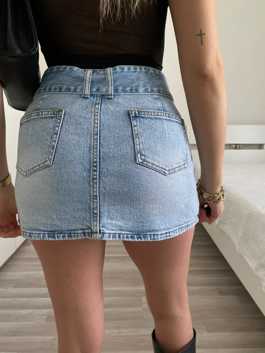 Mini in jeans con dettaglio cintura e tasche. Modello a vita bassa