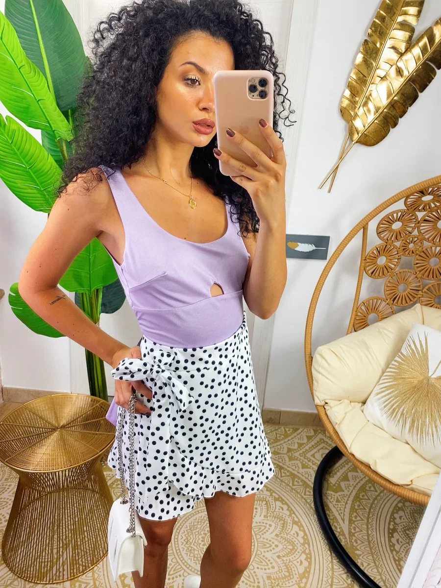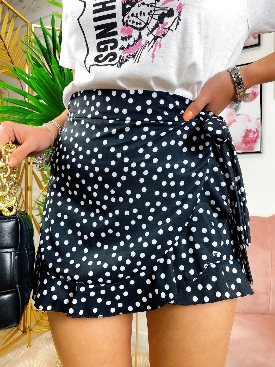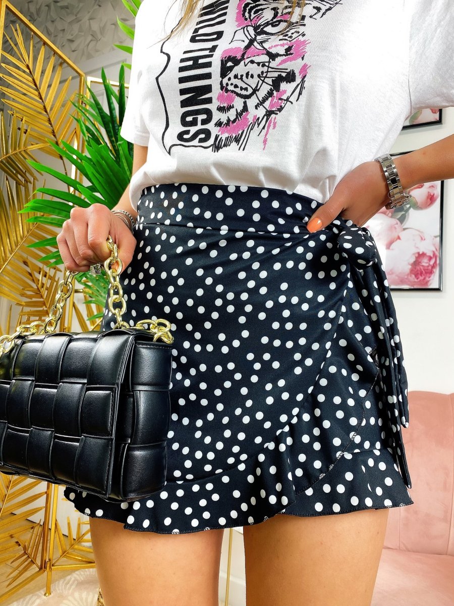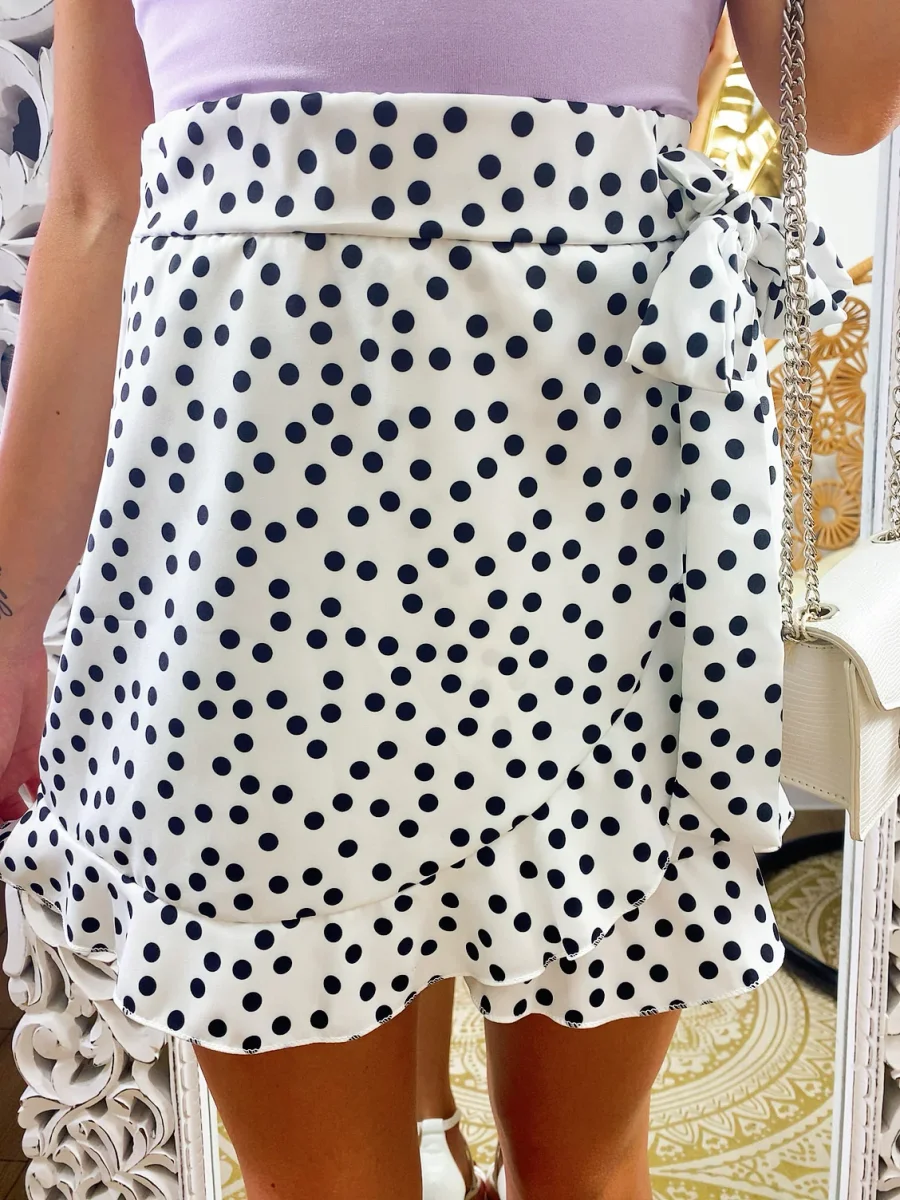Minishort effetto gonna con fantasia a pois e zip dietro elastico in vita. Adatto a taglie 38-40