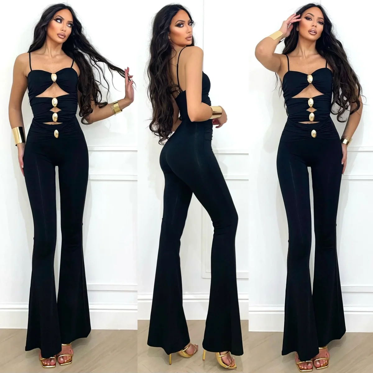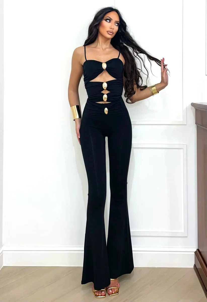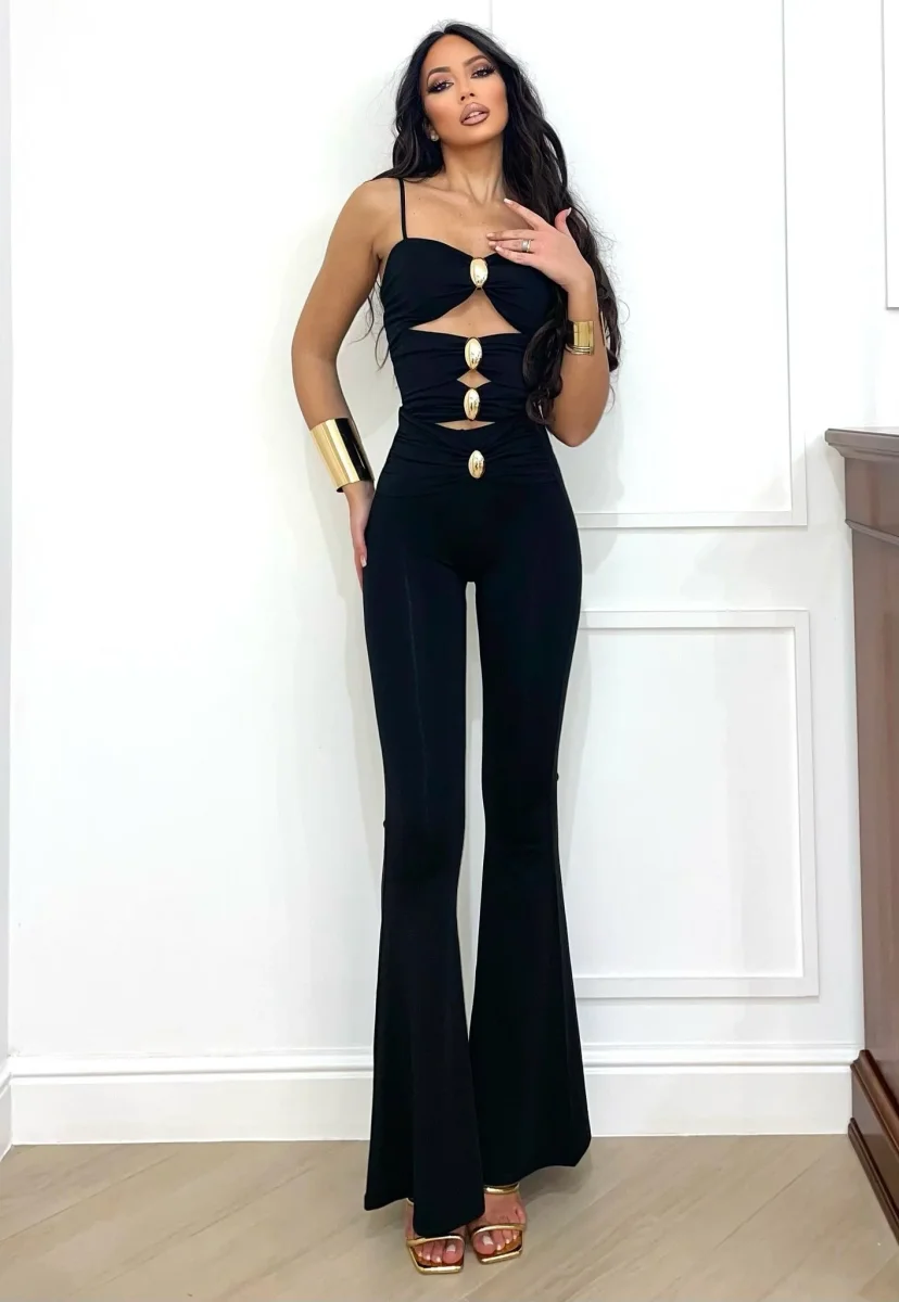Pantalone in lycra elasticizzata a zampa con elastico in vita e gioiello oro sul davanti