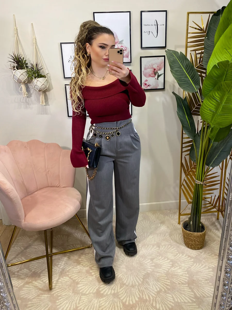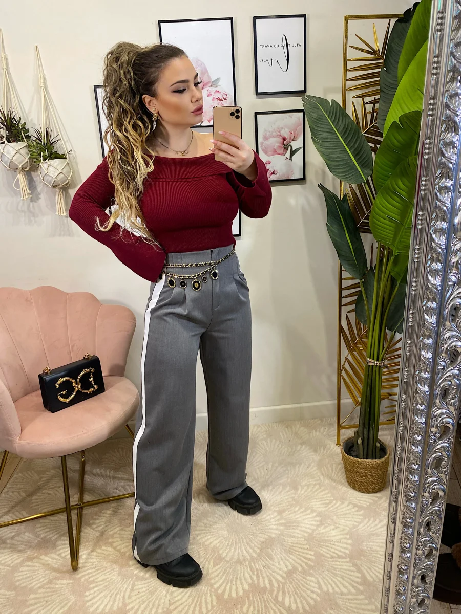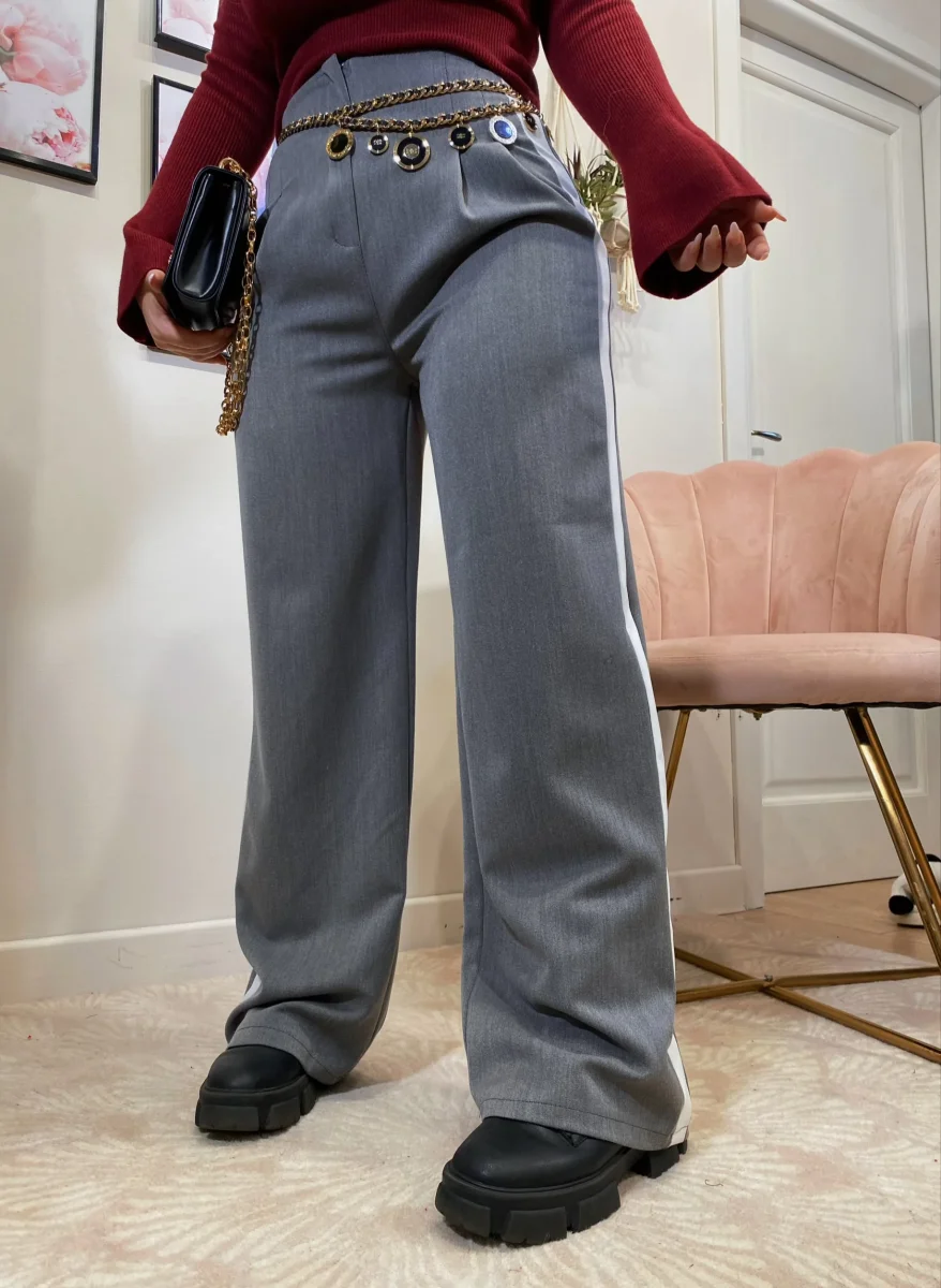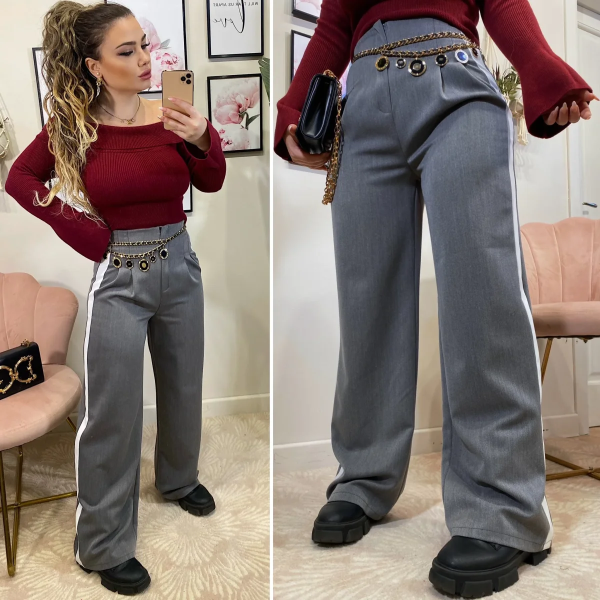 Pantalone a vita alta con zip molto elasticizzato a palazzo con banda laterale bianca