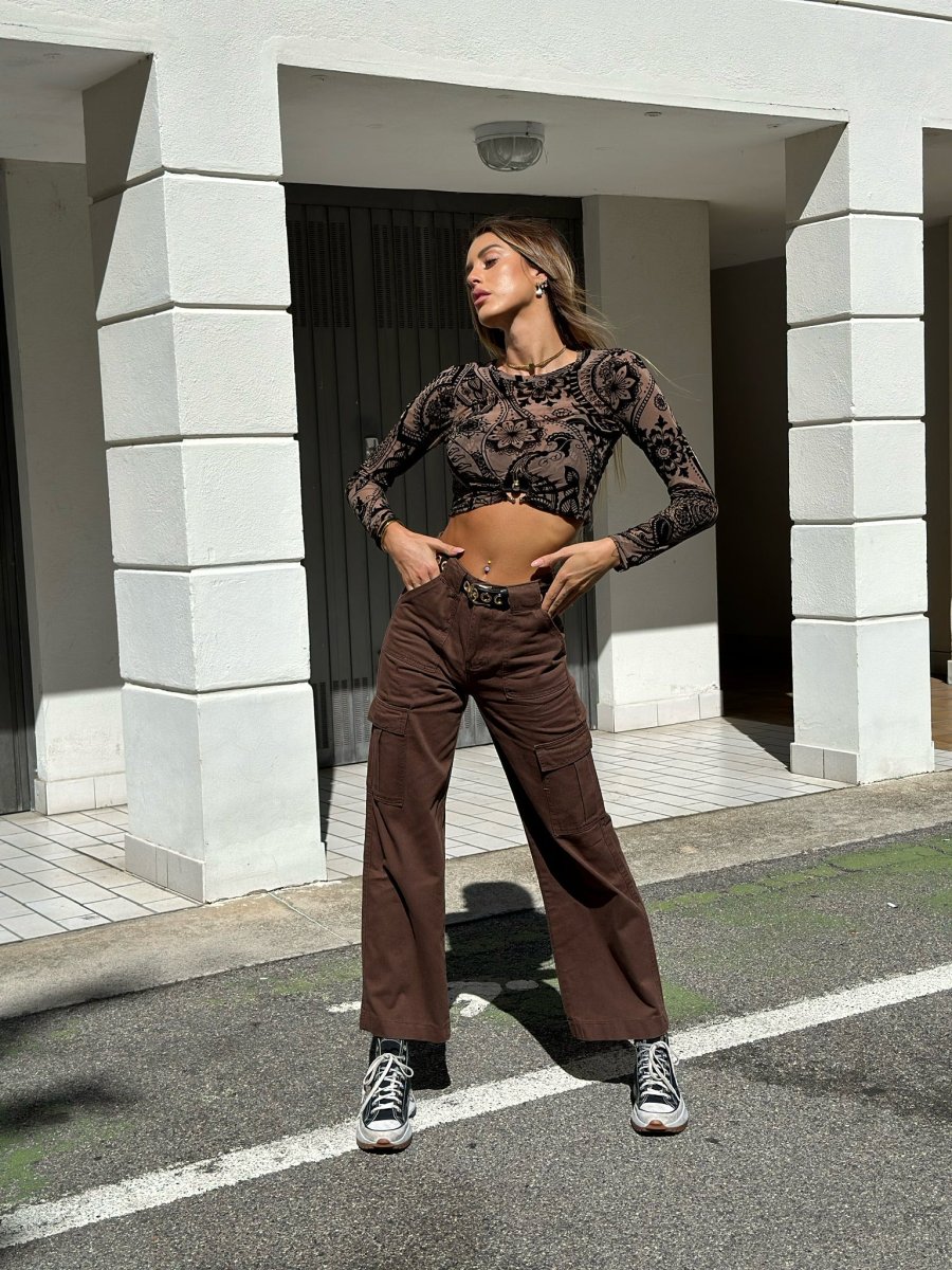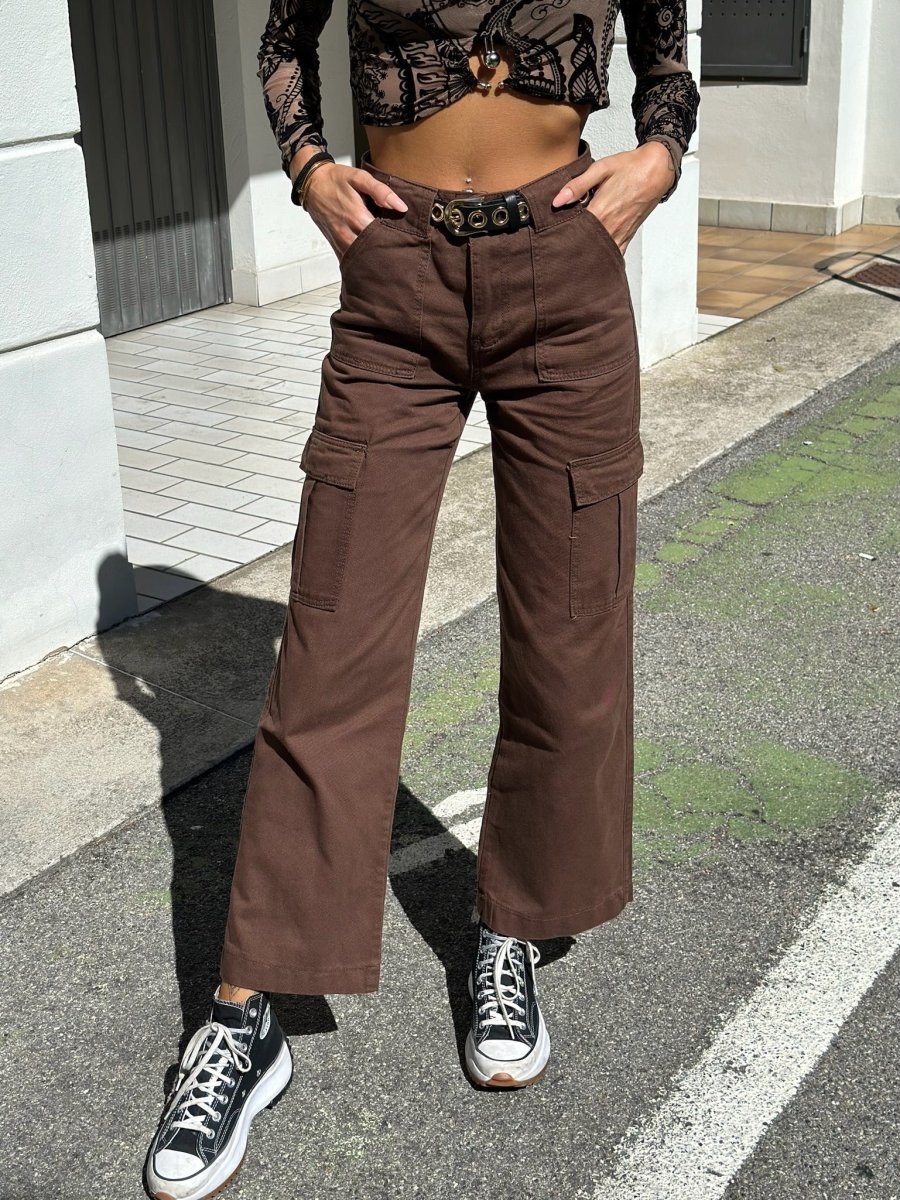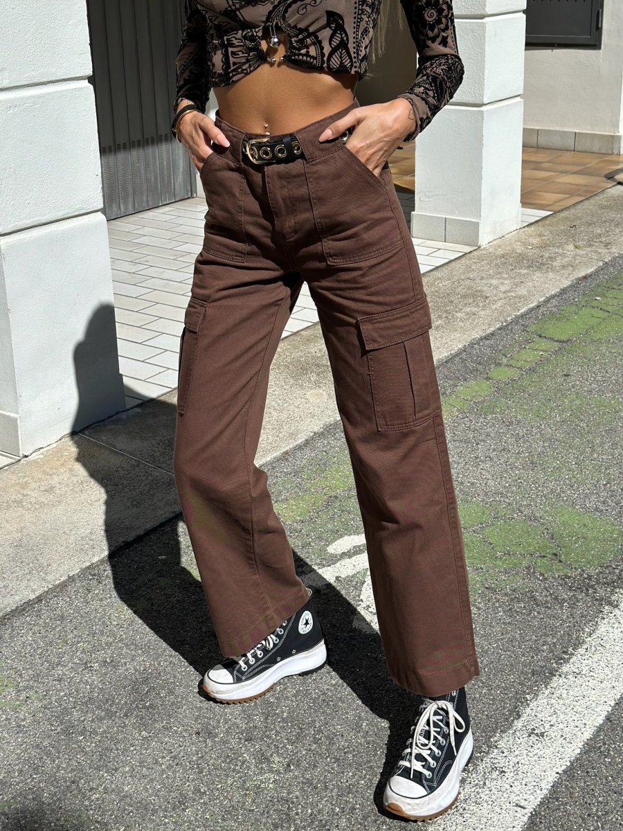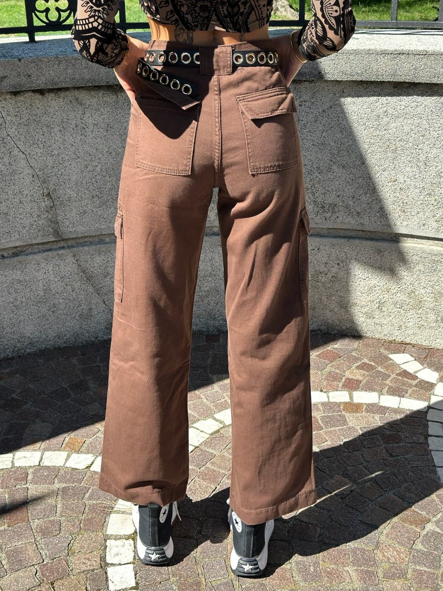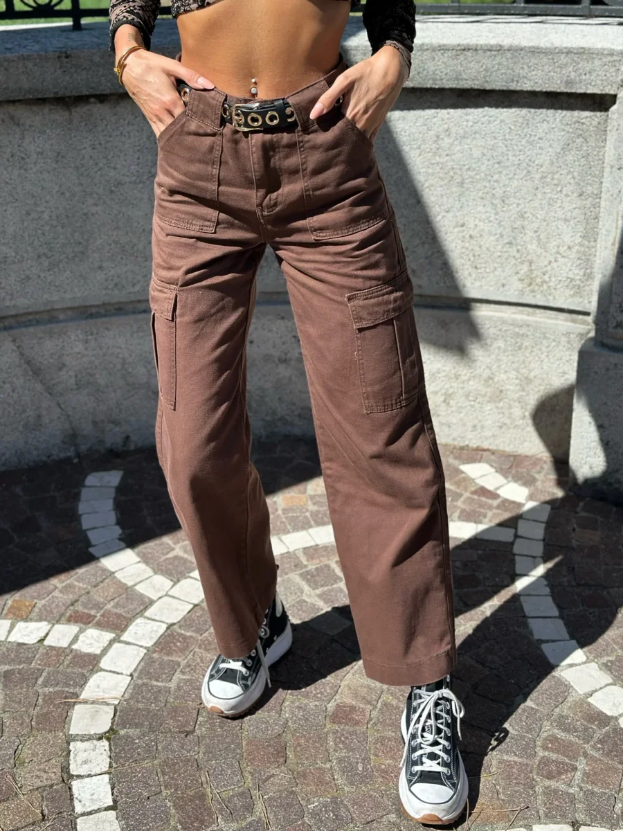 Pantalone cargo in jeans con maxi tasconi, non elasticizzato. La modella in foto indossa XS