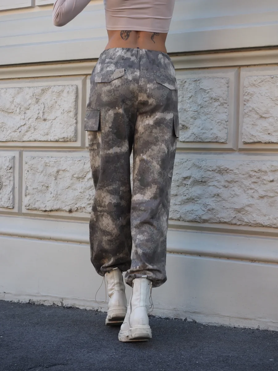 Pantalone cargo in tessuto jeansato elasticizzato regolabile in vita e sui polsini. Maxi tasconi.