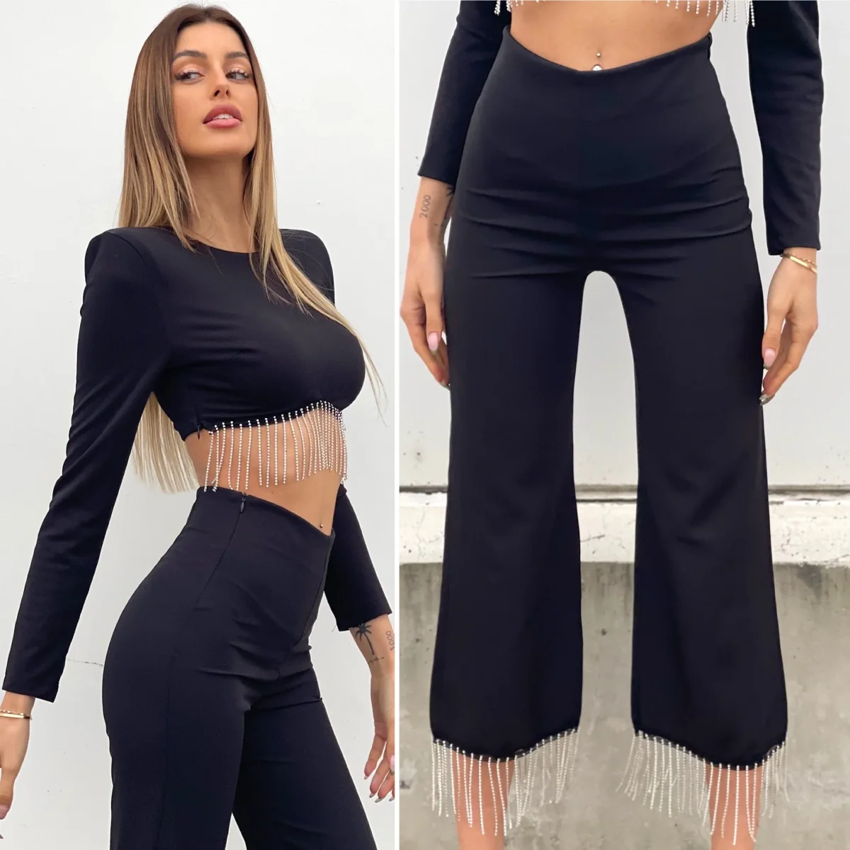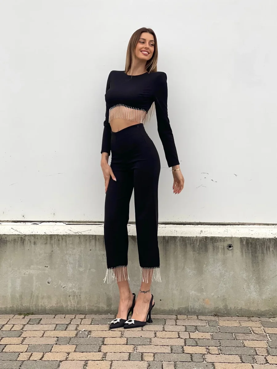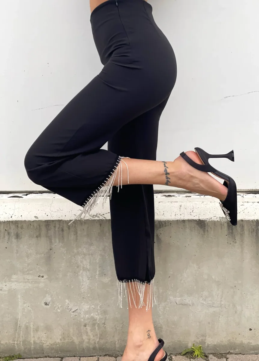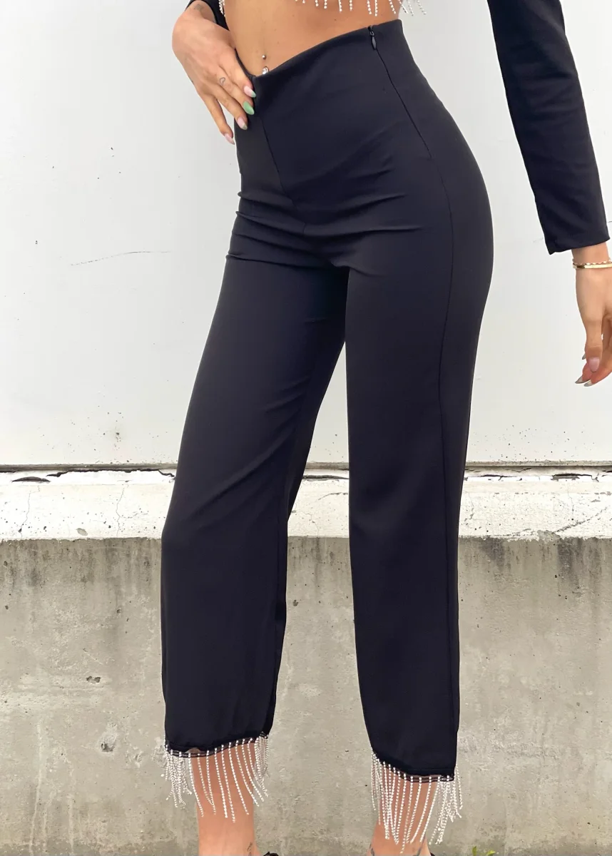 Pantalone nero in tessuto liscio con ciondoli in frange sul finale. La modella è alta 1,80