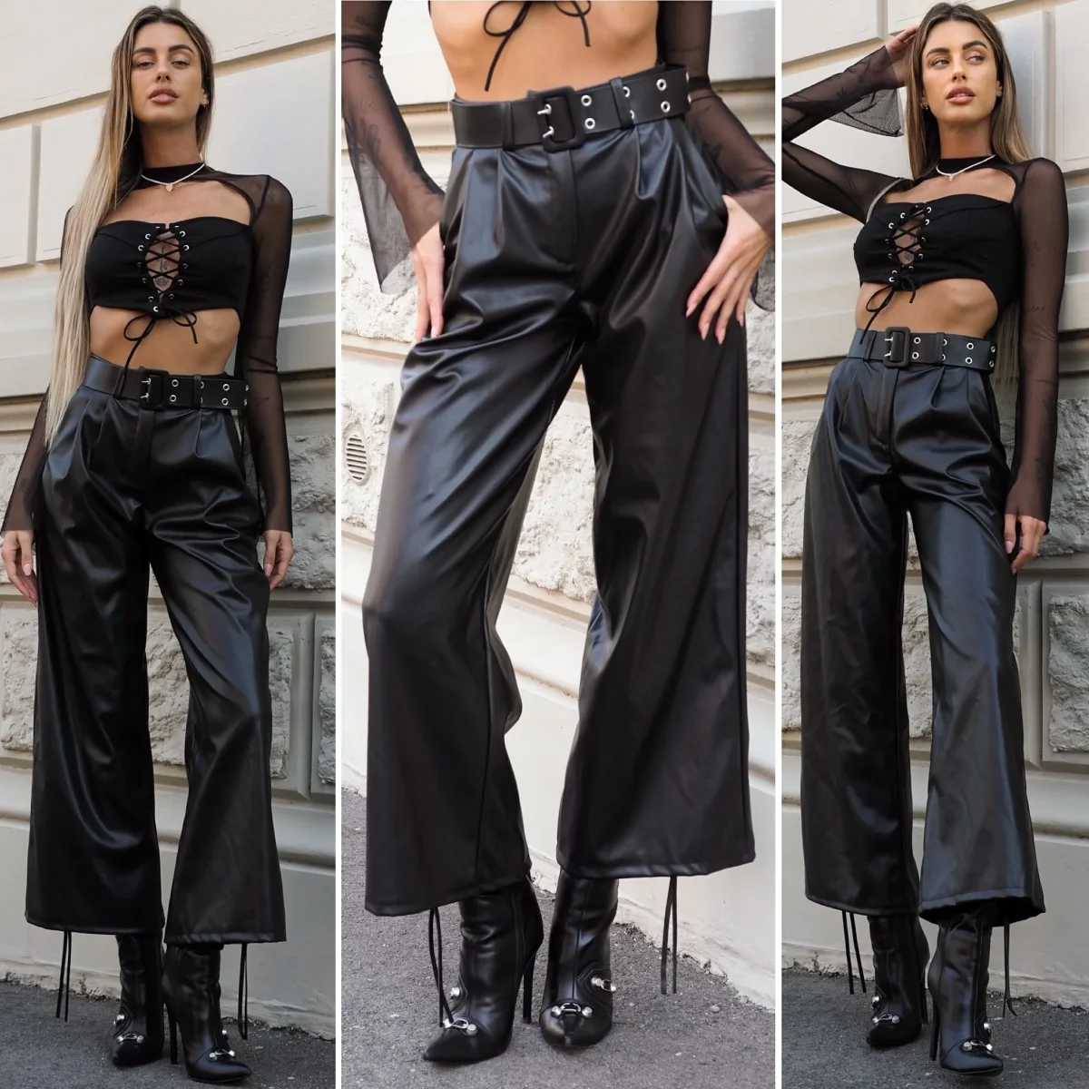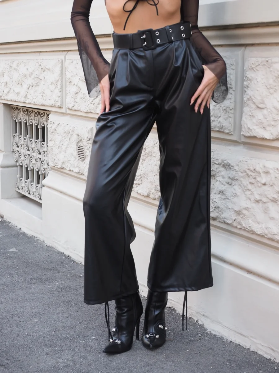 Pantalone in ecopelle a palazzo con cintura regolabile inclusa