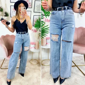 Pantalone in ecopelle con chiusura zip e bottoni, tasche nel dietro e zampa larga