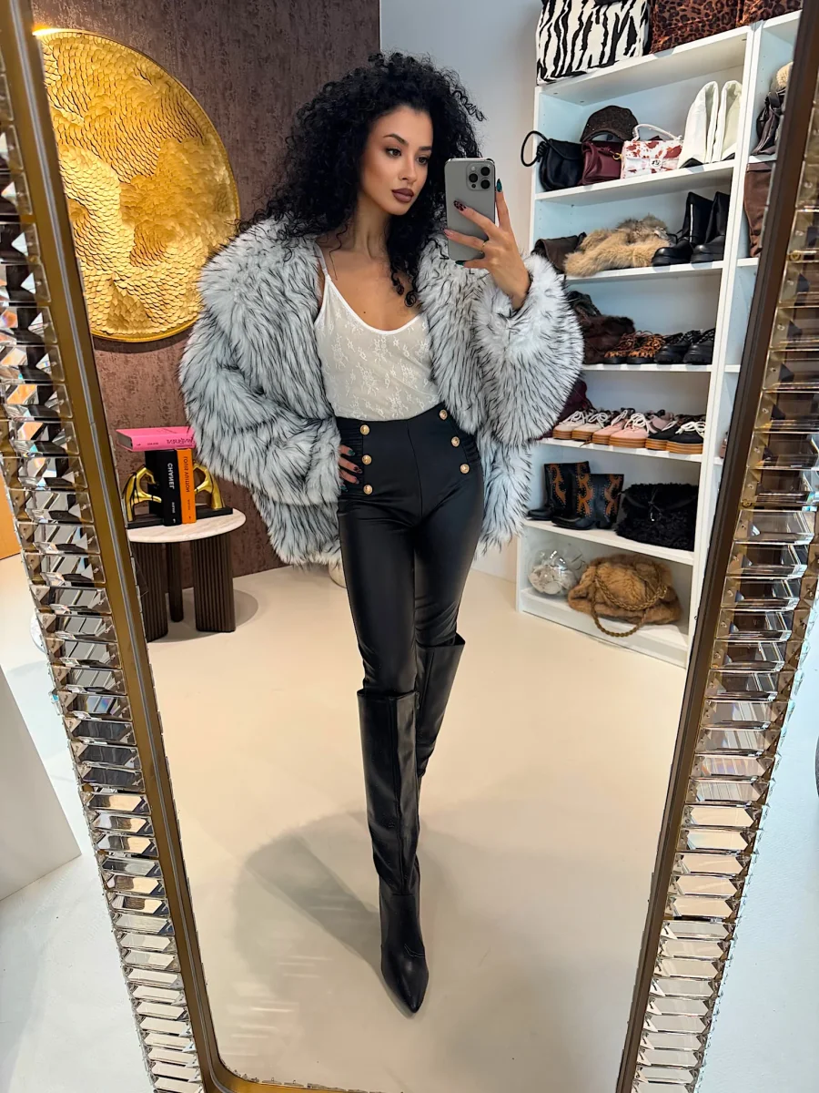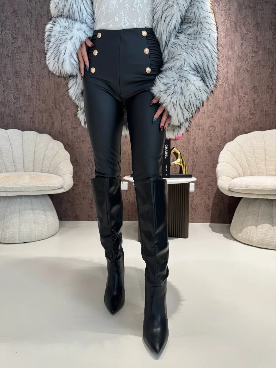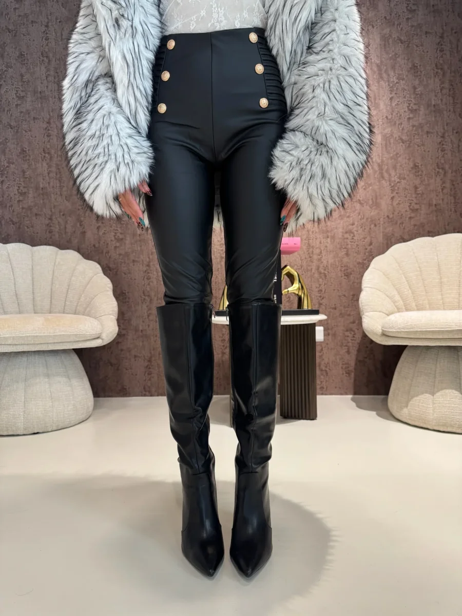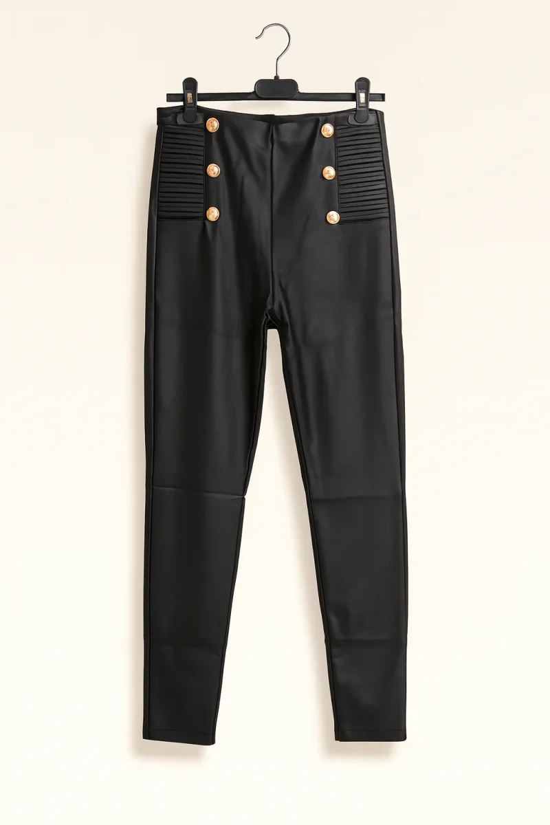 Questo pantalone elegante in ecopelle è la scelta perfetta per uno stile sofisticato e confortevole. Con i suoi bottoni oro e l’elastico in vita, è facile da indossare e si adatta perfettamente alla tua figura. Aggiungi un tocco di classe al tuo guardaroba con questo capo unico.