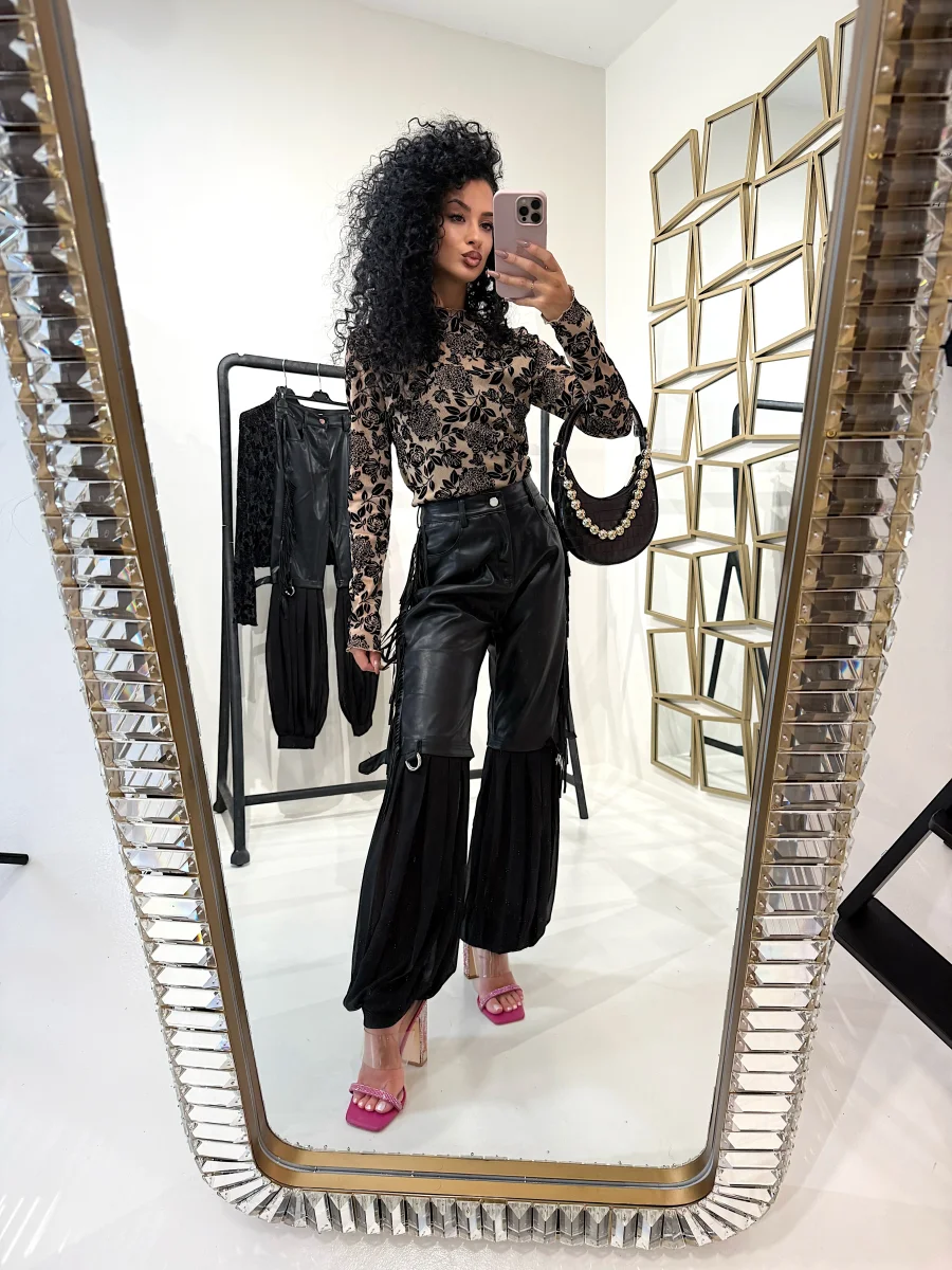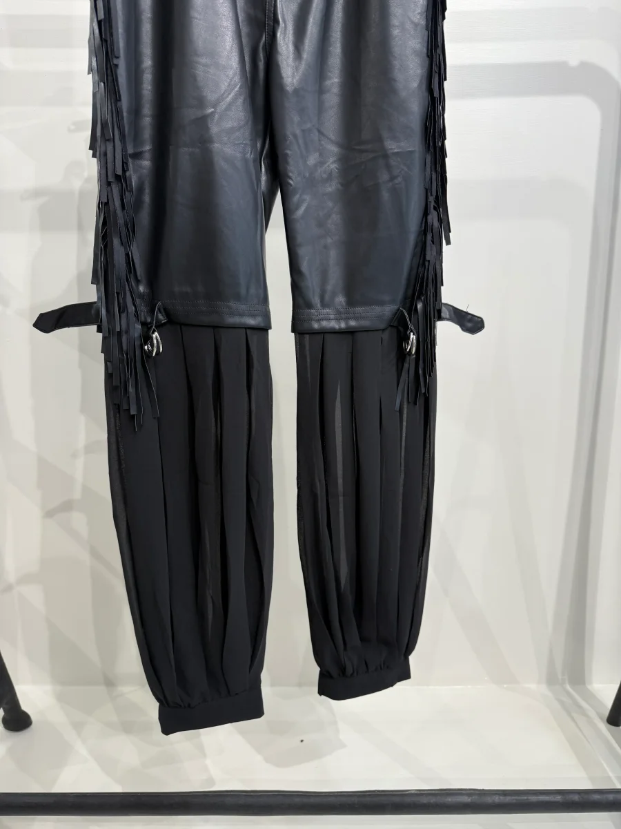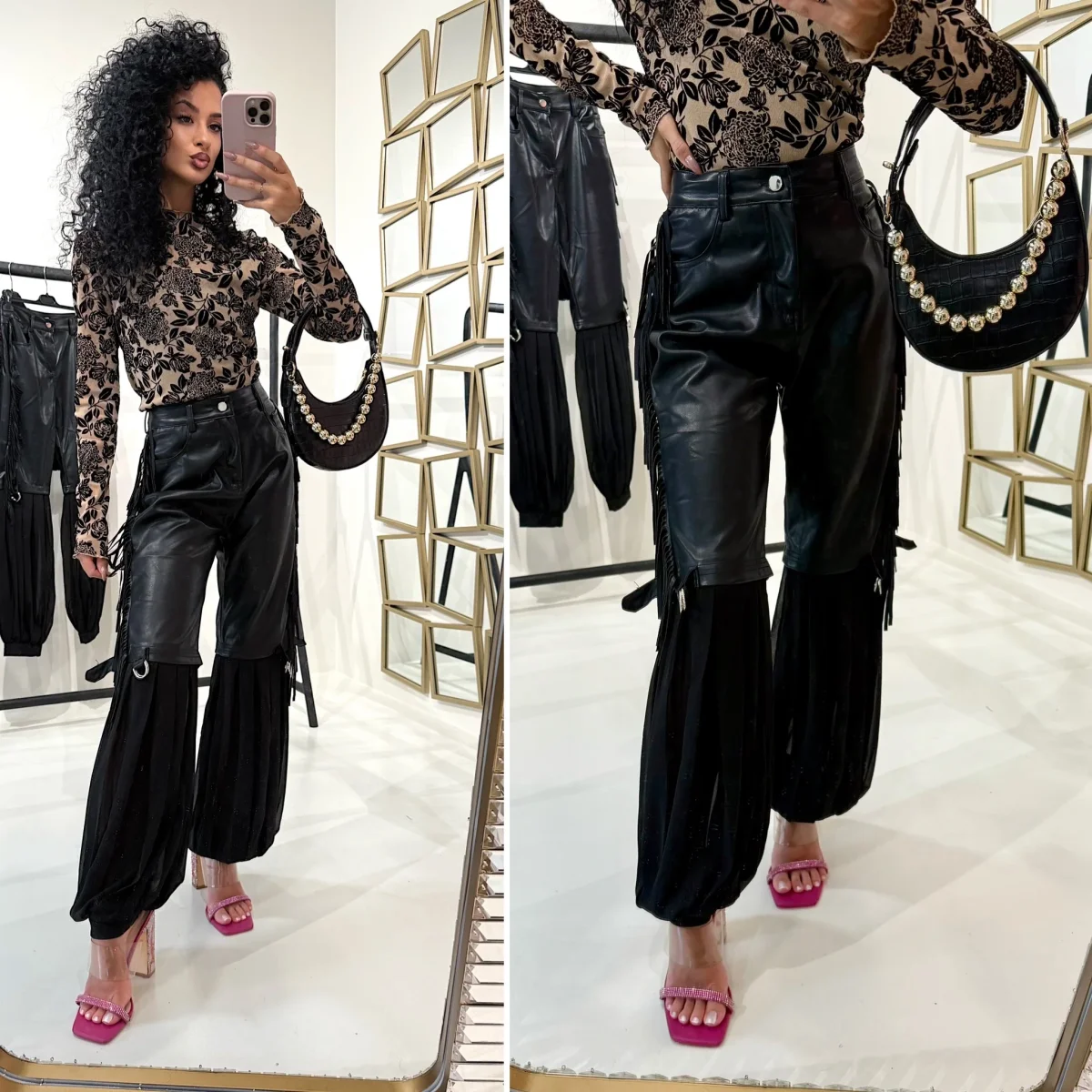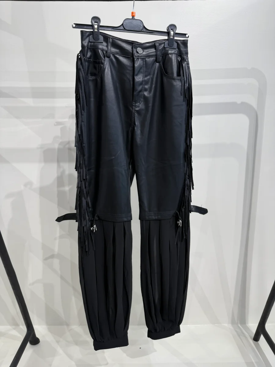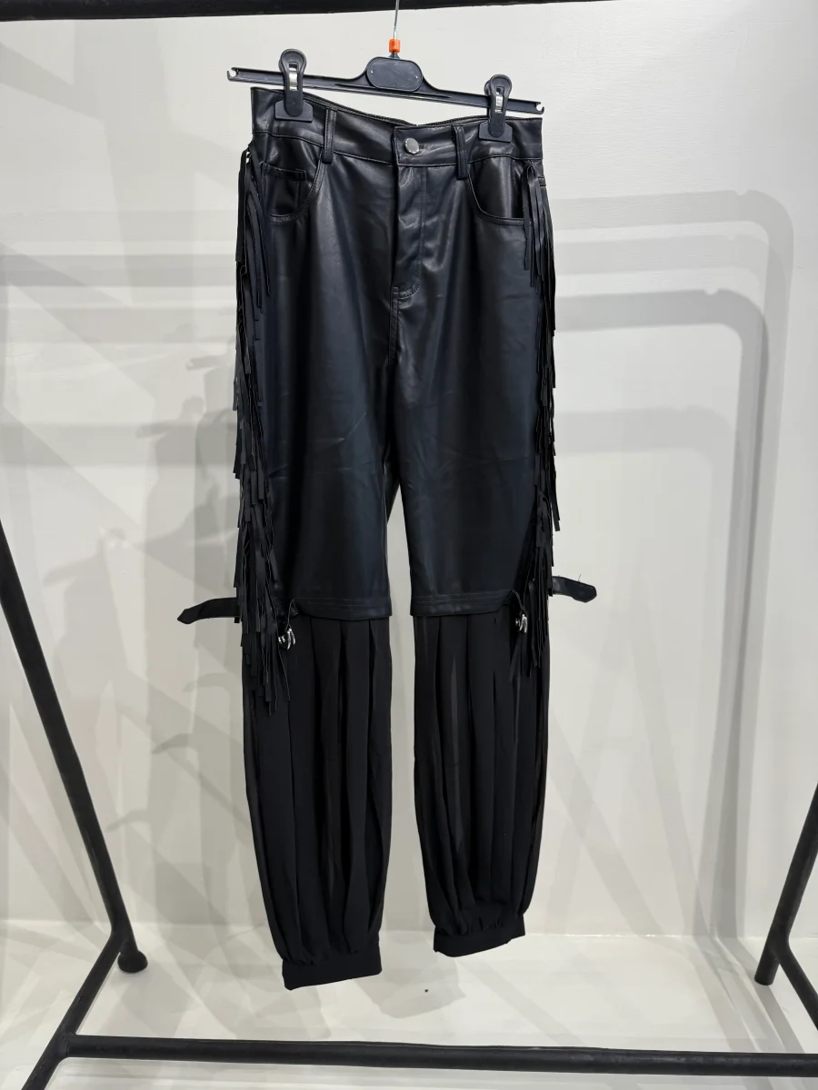 Pantalone dal design originale e grintoso, realizzato nella parte superiore in ecopelle liscia con dettagli a frange sui lati, che donano movimento e carattere. La parte inferiore è in tessuto leggero plissettato, con fondo elasticizzato effetto balloon, per un contrasto di materiali unico e ricercato. Chiusura con bottone e zip, passanti per cintura e tasche laterali in stile jeans. Un capo fashion perfetto per chi ama distinguersi con uno stile deciso e contemporaneo.