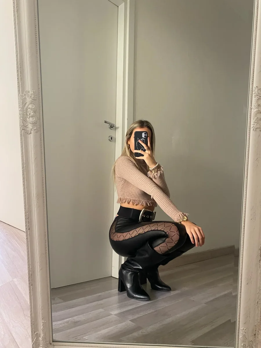 Pantalone in ecopelle con elastico in vita, trasparenza laterale e pois argento
