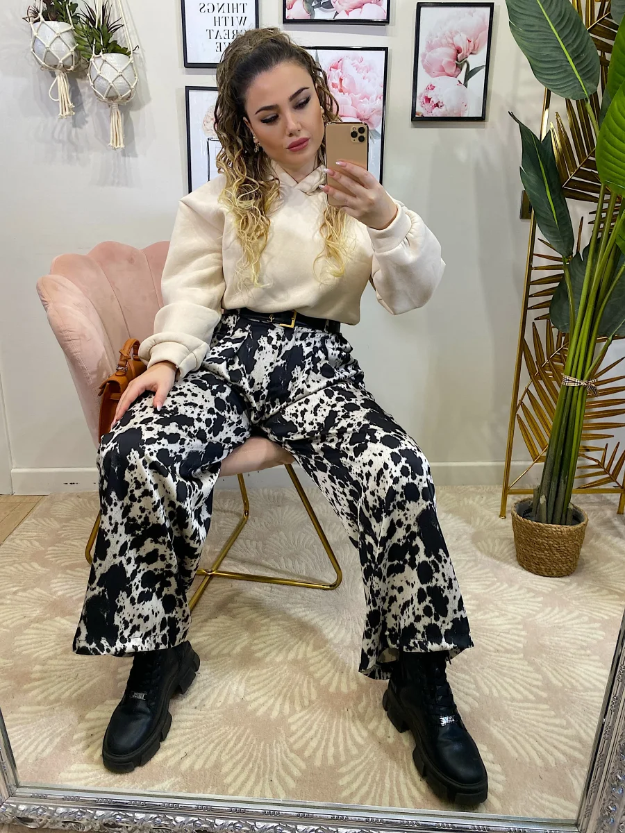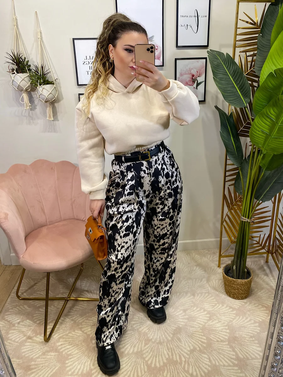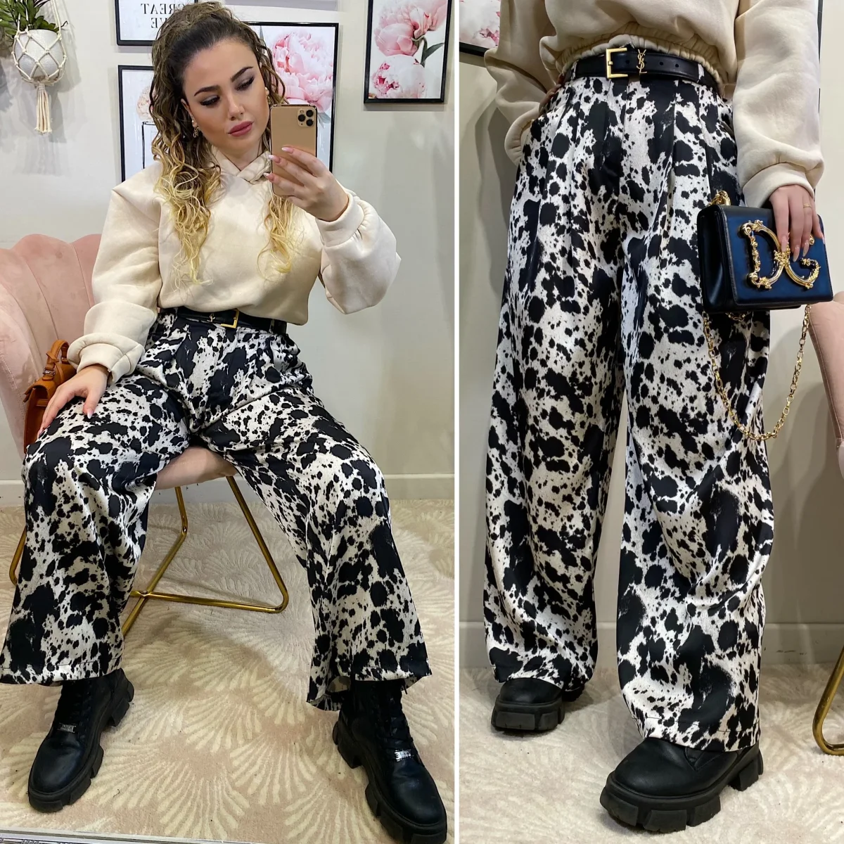 Pantalone in doppio satin a fantasia, con elastico in vita e penche.