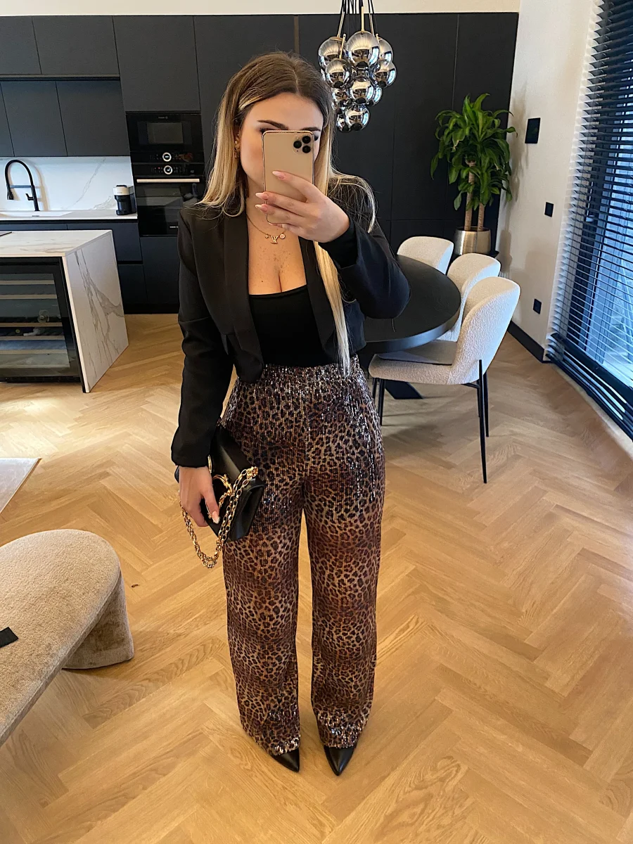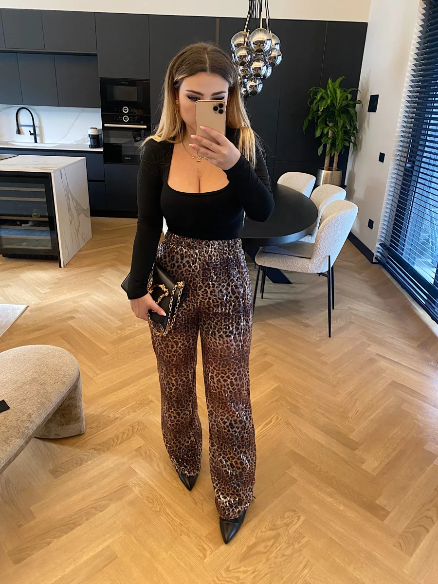 Pantalone a palazzo in paillettes animalier, molto elasticizzato adatto fino a una 46 con fodera a pantaloncino invisibile.