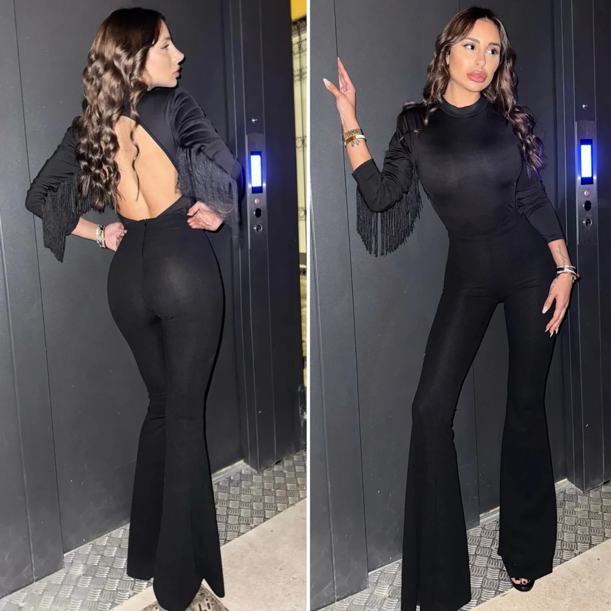 Pantalone a vita alta effetto leggins a zampa, zip nel dietro e elasticizzato in vita. La modella indossa taglia XS.