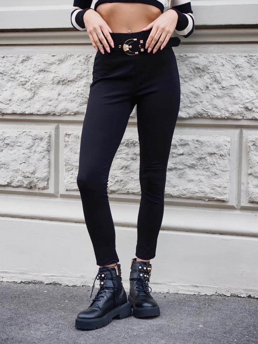 Panta leggins in tessuto elasticizzato aderente con cintura in vita inclusa, dettaglio oro.