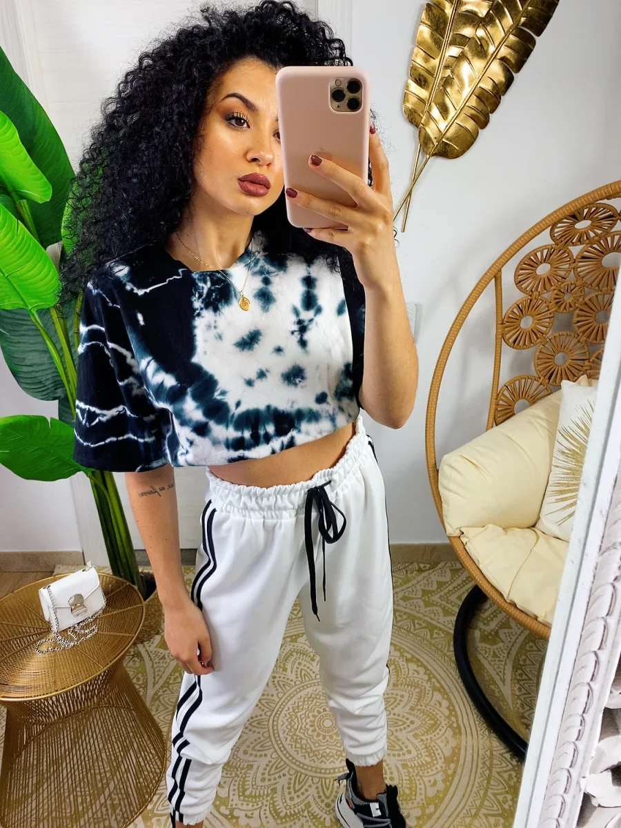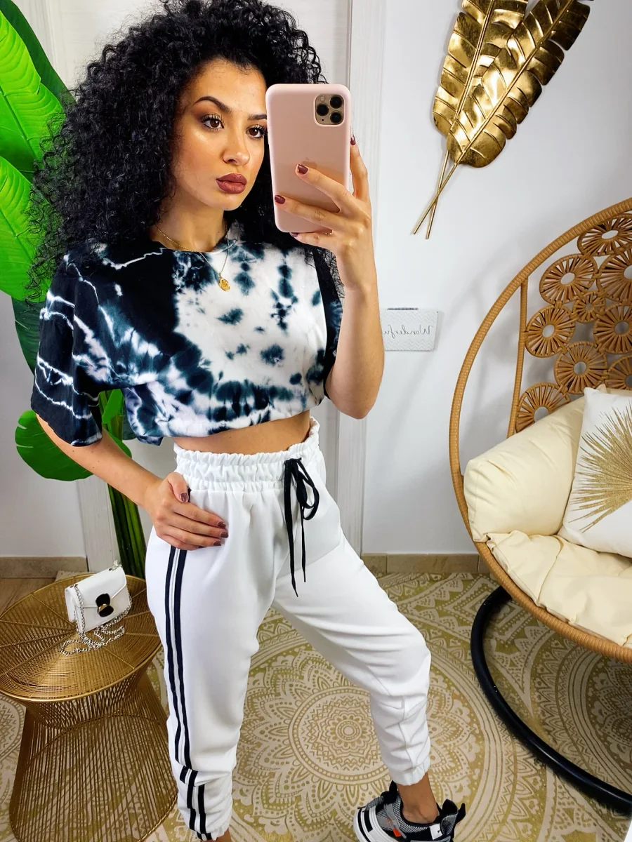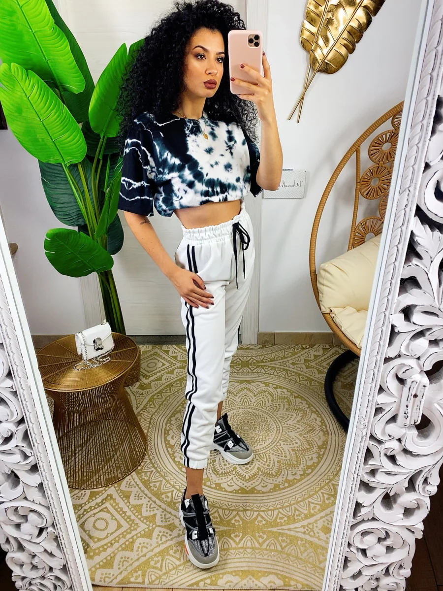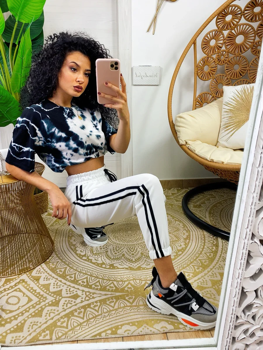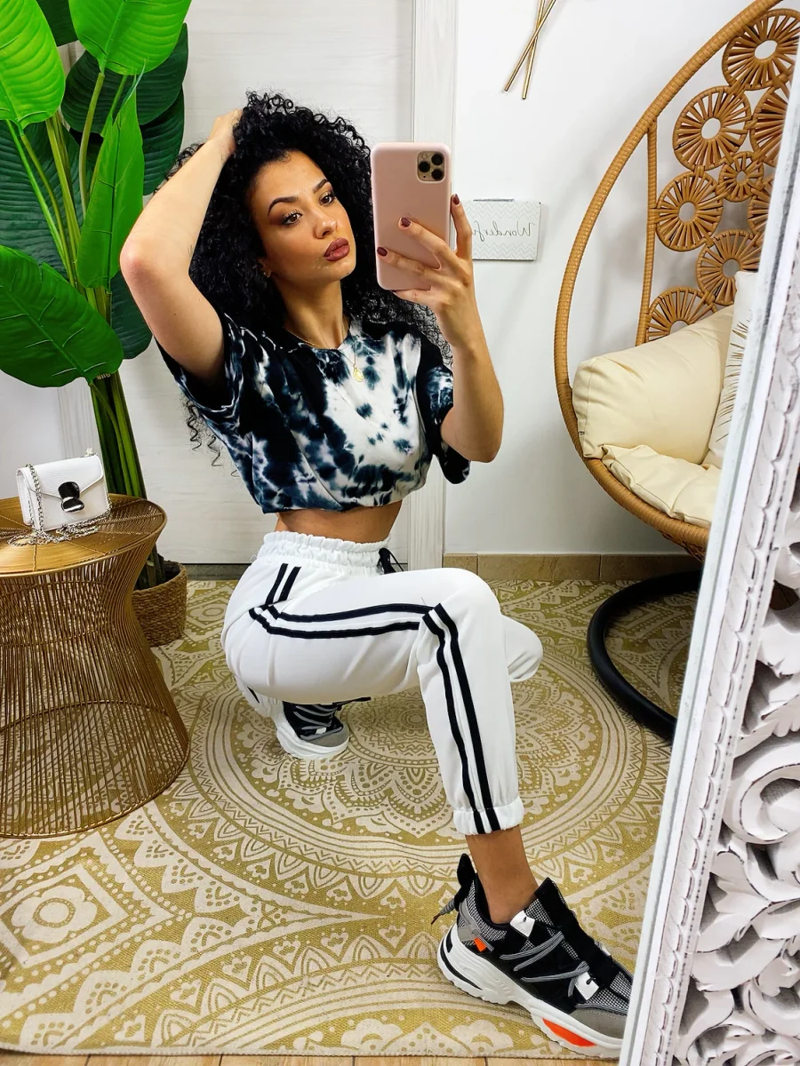 Pantaloni sportivi bianco comodissimi da tutti i giorni. La moda del momento. Elastico in vita e polsino righe laterali nere in contrasto. Tessuto leggero traspirante