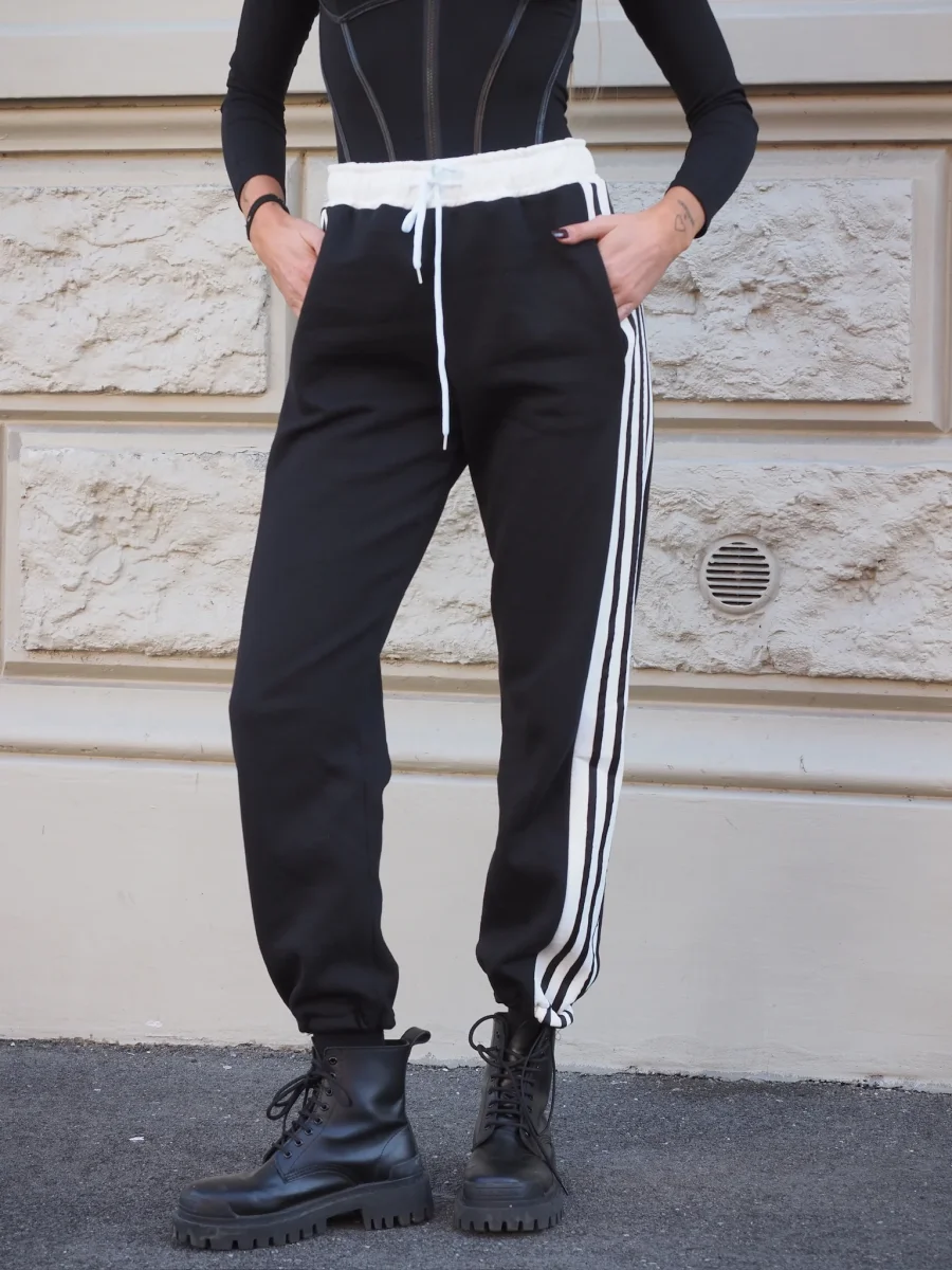 Pantalone sportivo con elastico in vita e laccetto, righe bianche sui laterali.