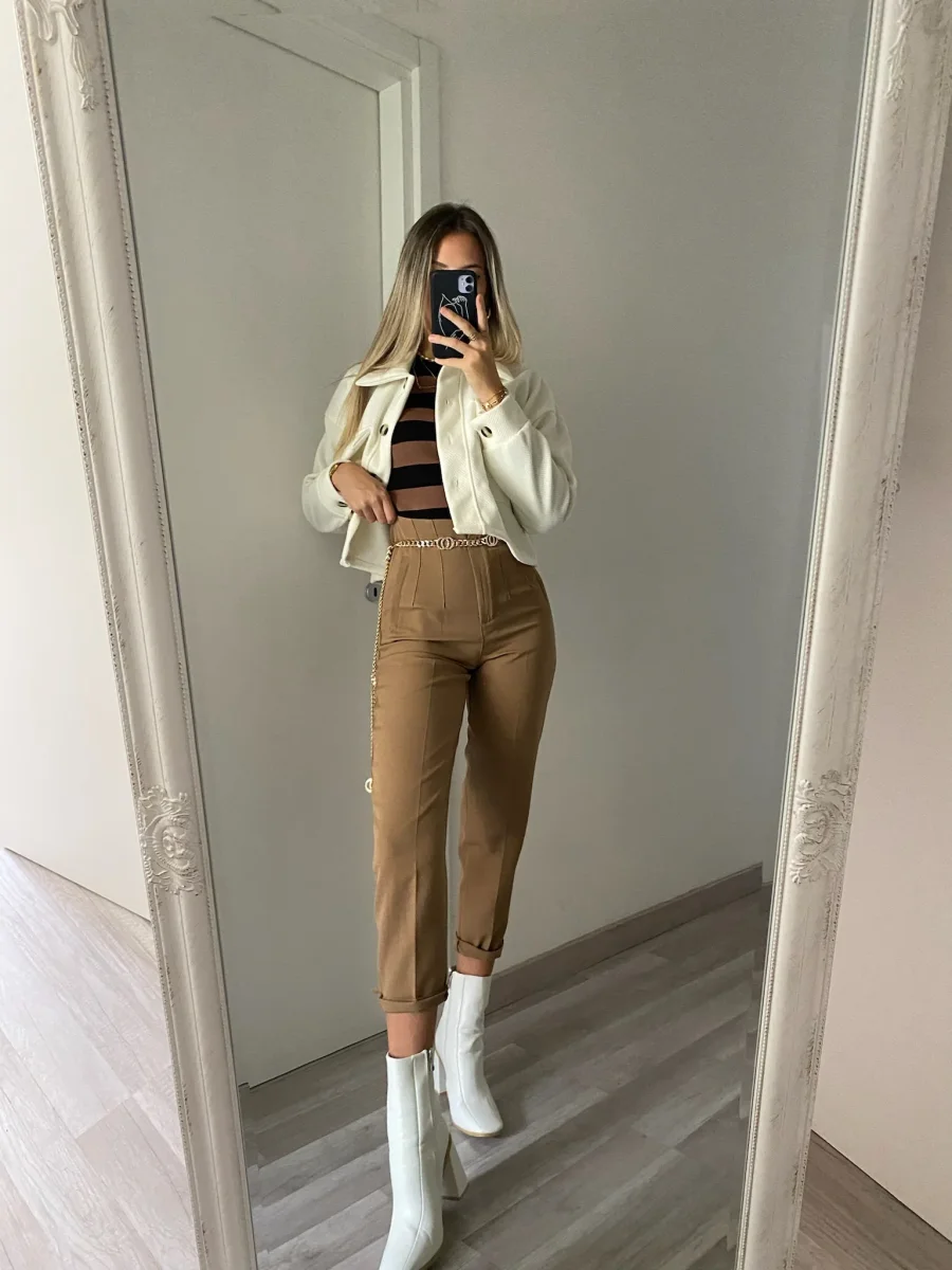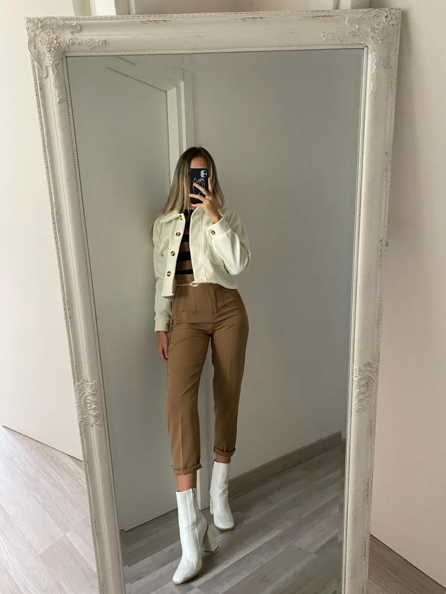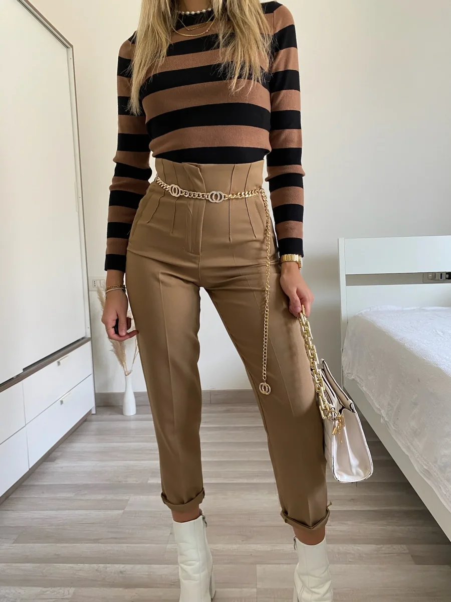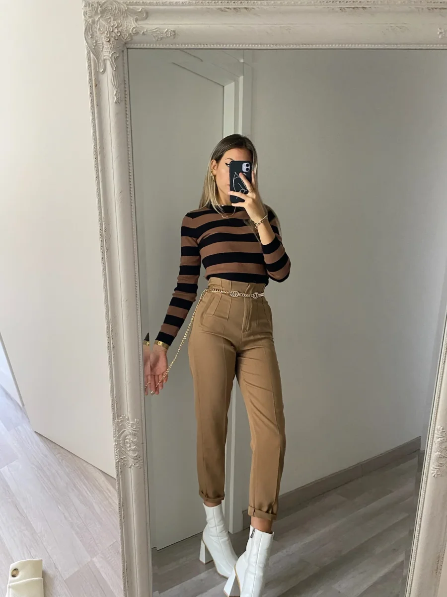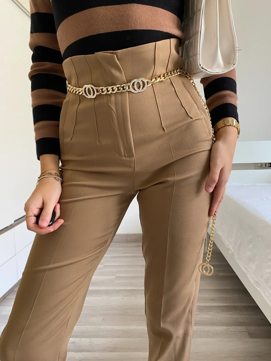 Pantalone a vita alta elasticizzato con chiusura con zip. Tinta unita