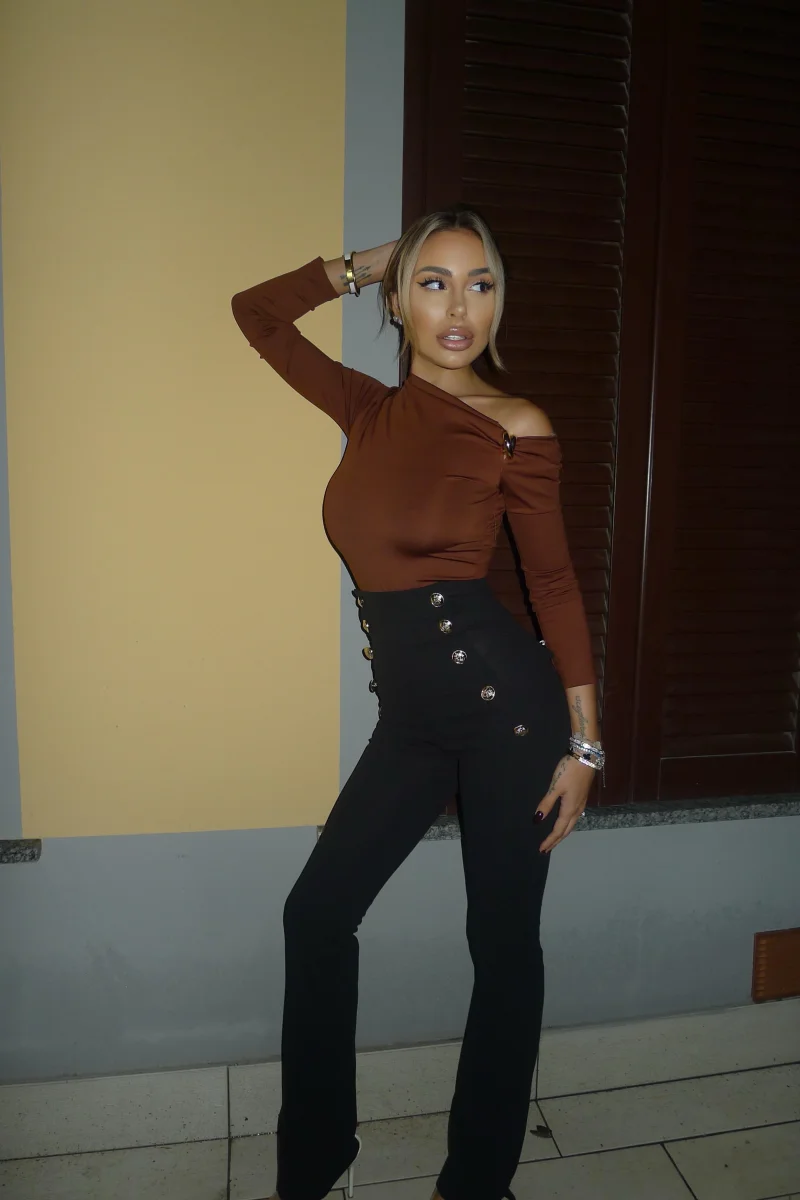 Pantaloni a palazzo a vita altissima con zip e bottoni oro. Vestibilità piccola. In foto taglia XS