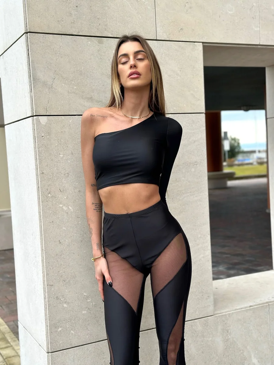 Pantaloni a zampa con elastico in vita e trasparenze in dettaglio